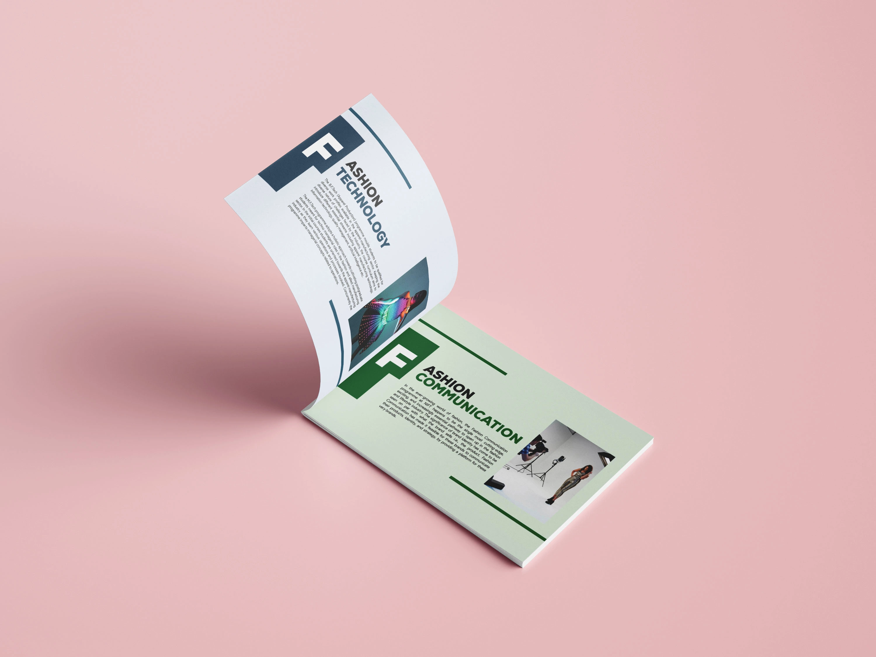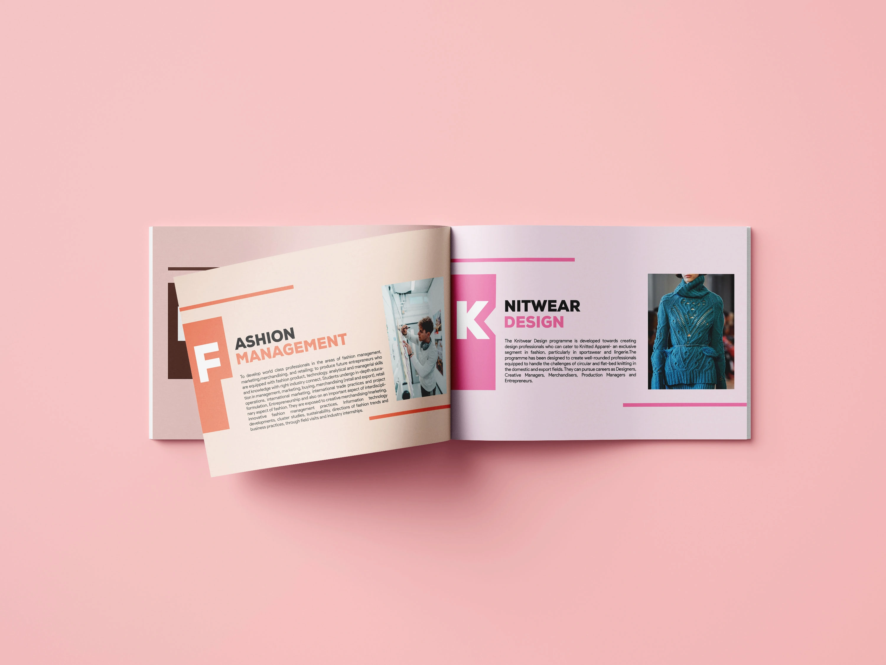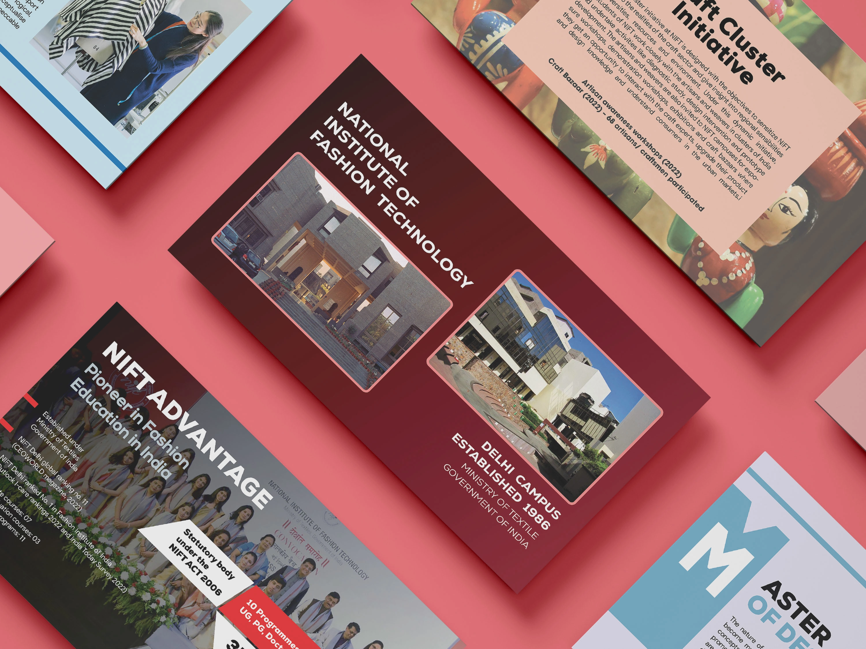 Brochure design for NIFT New Delhi,created with Adobe Illustrator and InDesign.Showcases departments through clean layouts, bold typography,and creative visuals