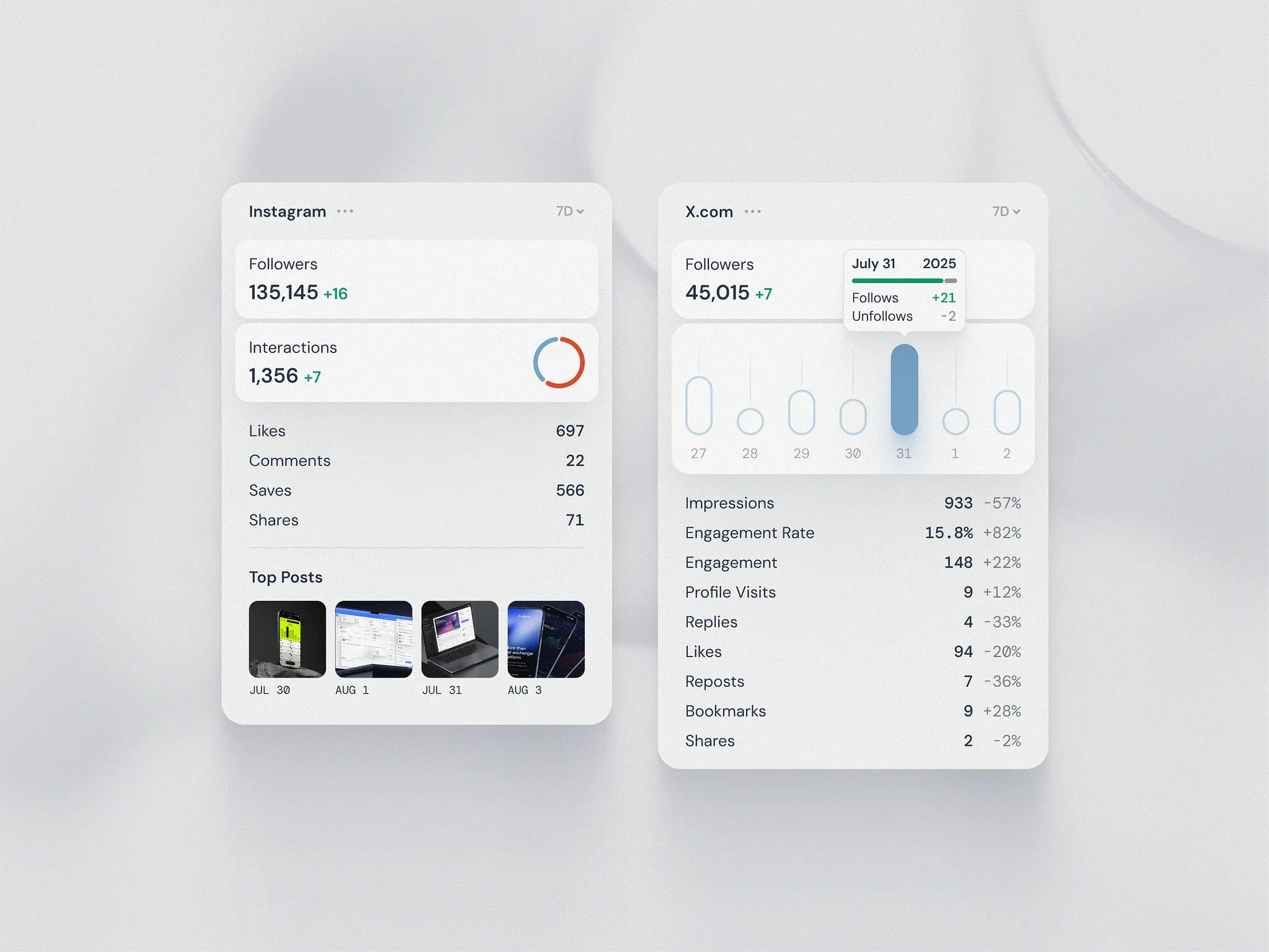 Users can monitor trends over time, drill into individual leads, and review social performance widgets that show followers, engagement, and top posts.