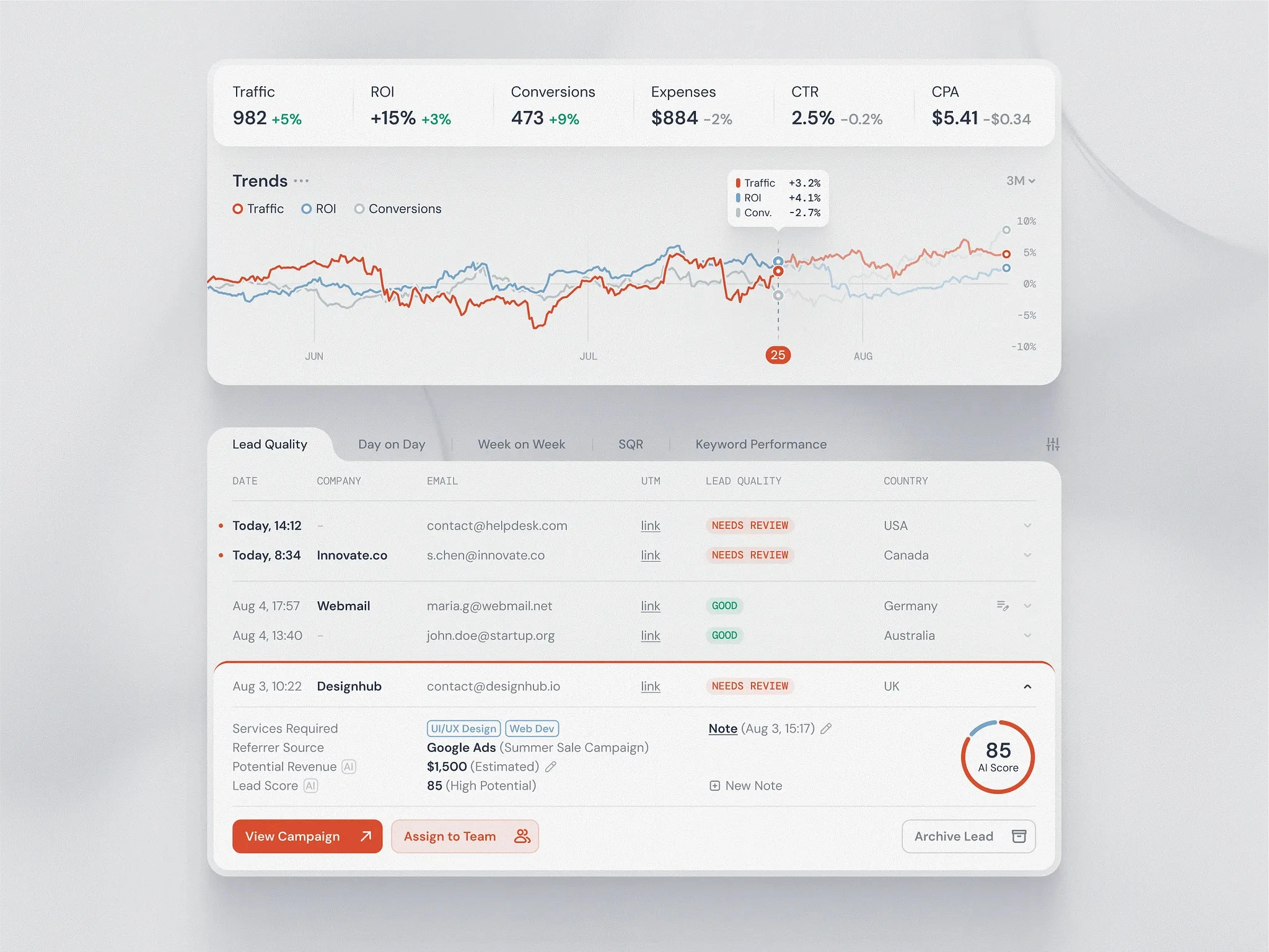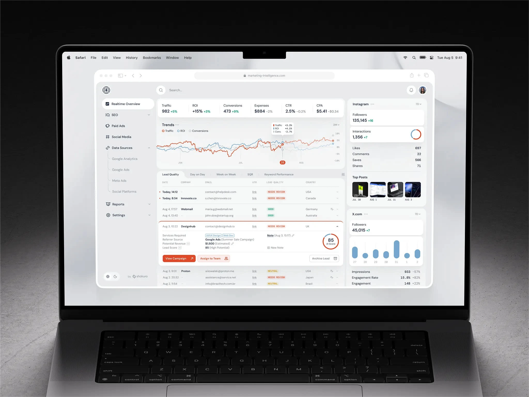 The application connects to multiple data sources - Google Analytics, Google Ads, Meta Ads, and social platforms and consolidates them into a real-time dashboard that surfaces traffic, ROI, conversions, CPA, CTR, and lead quality in a clean, card-based interface.