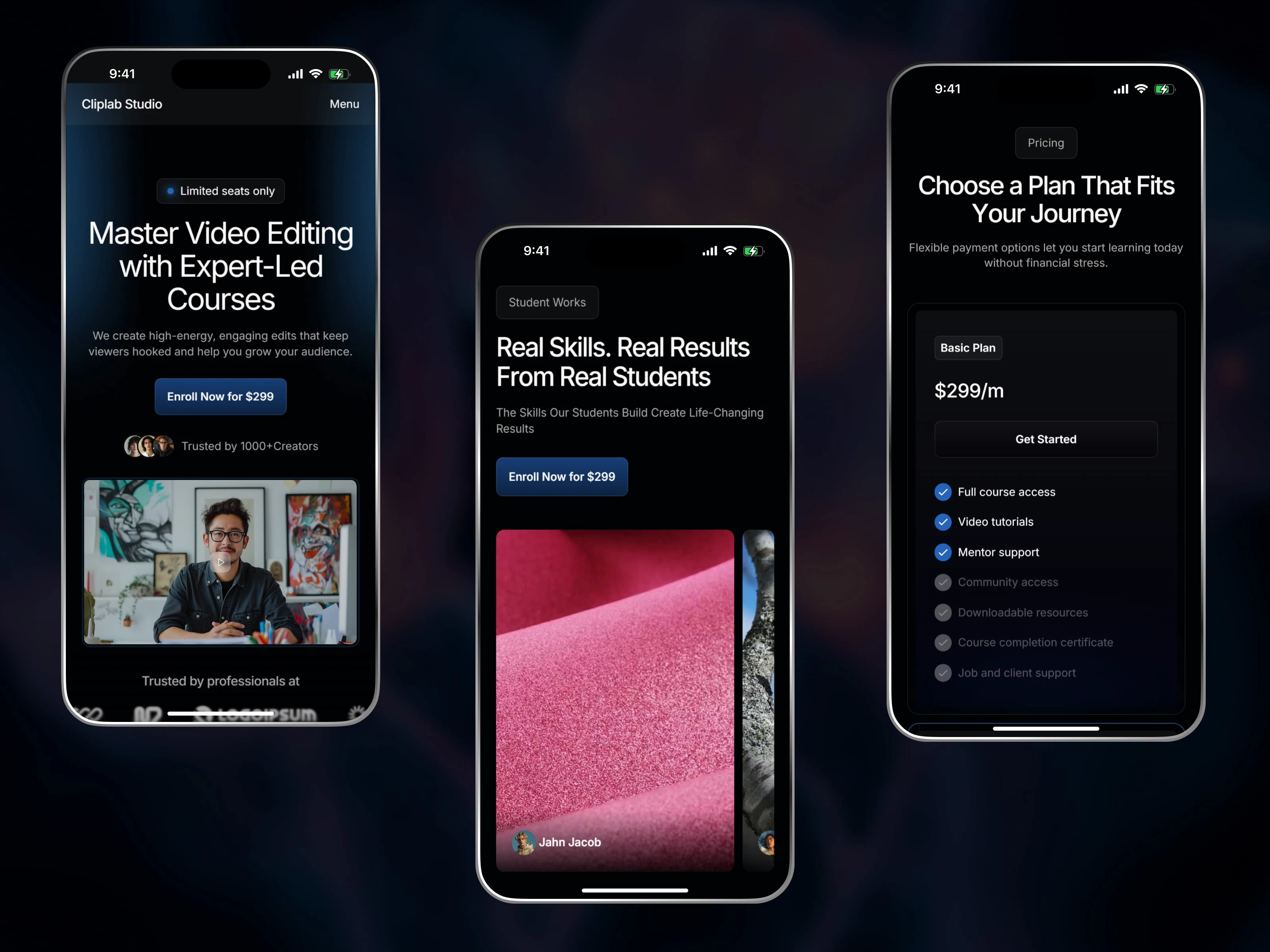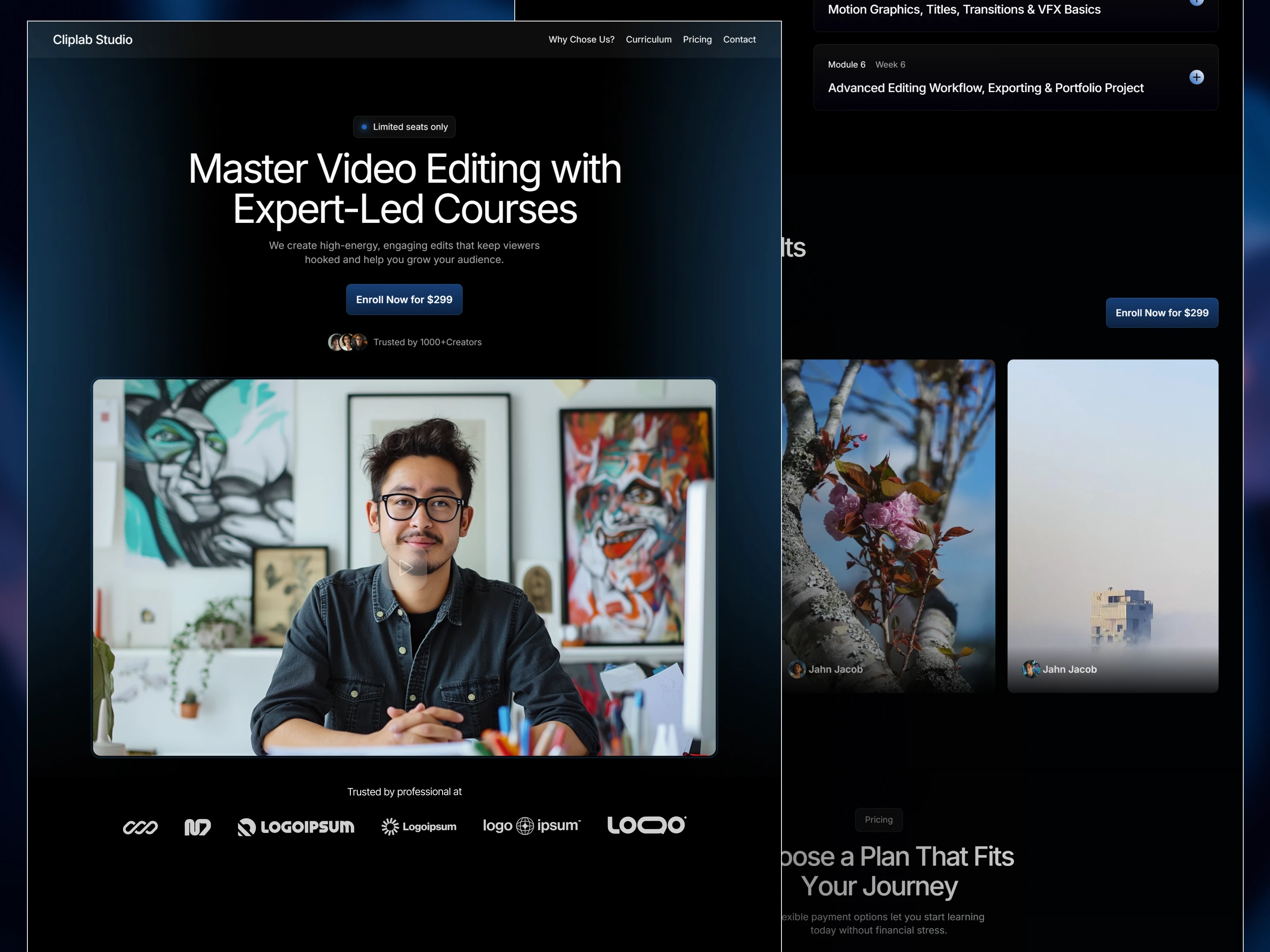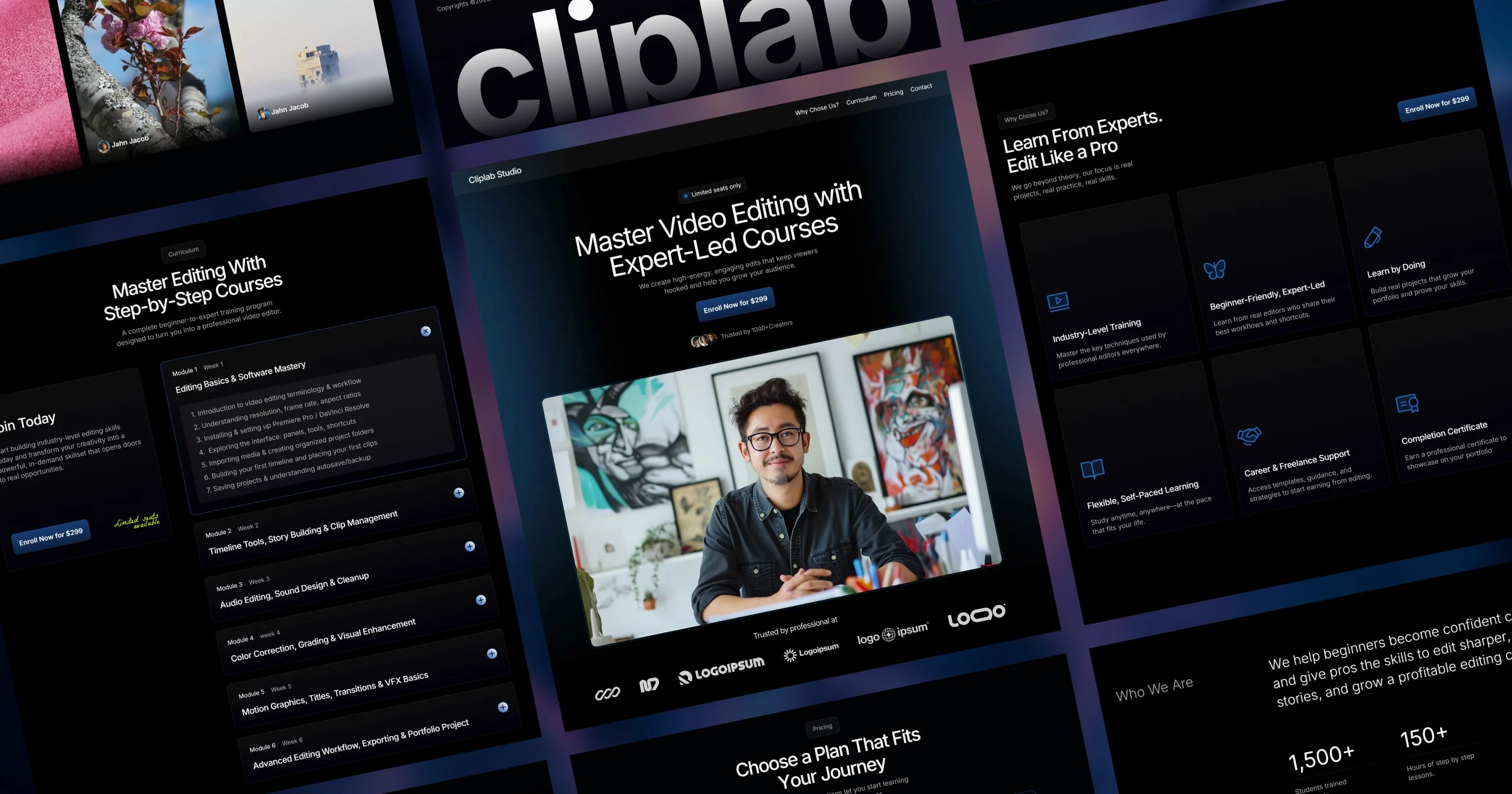 Cliplab Studio is a modern Framer landing page template built for video editors and online educators to showcase their courses online. Designed to convert visitors into students, it features bold visuals, smooth interactions, and a professional layout that highlights your expertise.