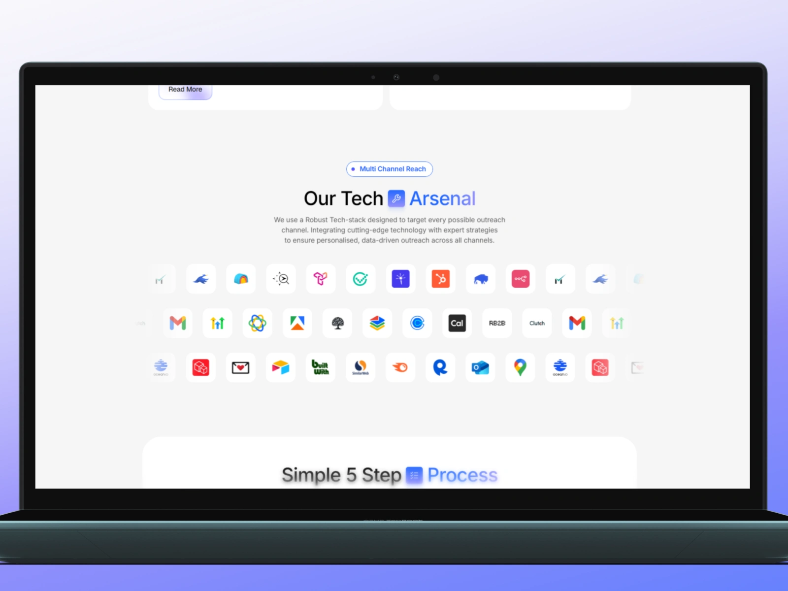 The Tech Arsenal section was built as a reusable component to showcase the tools and integrations Outreachify uses, while the 5-Step Process section uses a sticky animation stack that guides you step by step as you scroll — simple, smooth, and structured.