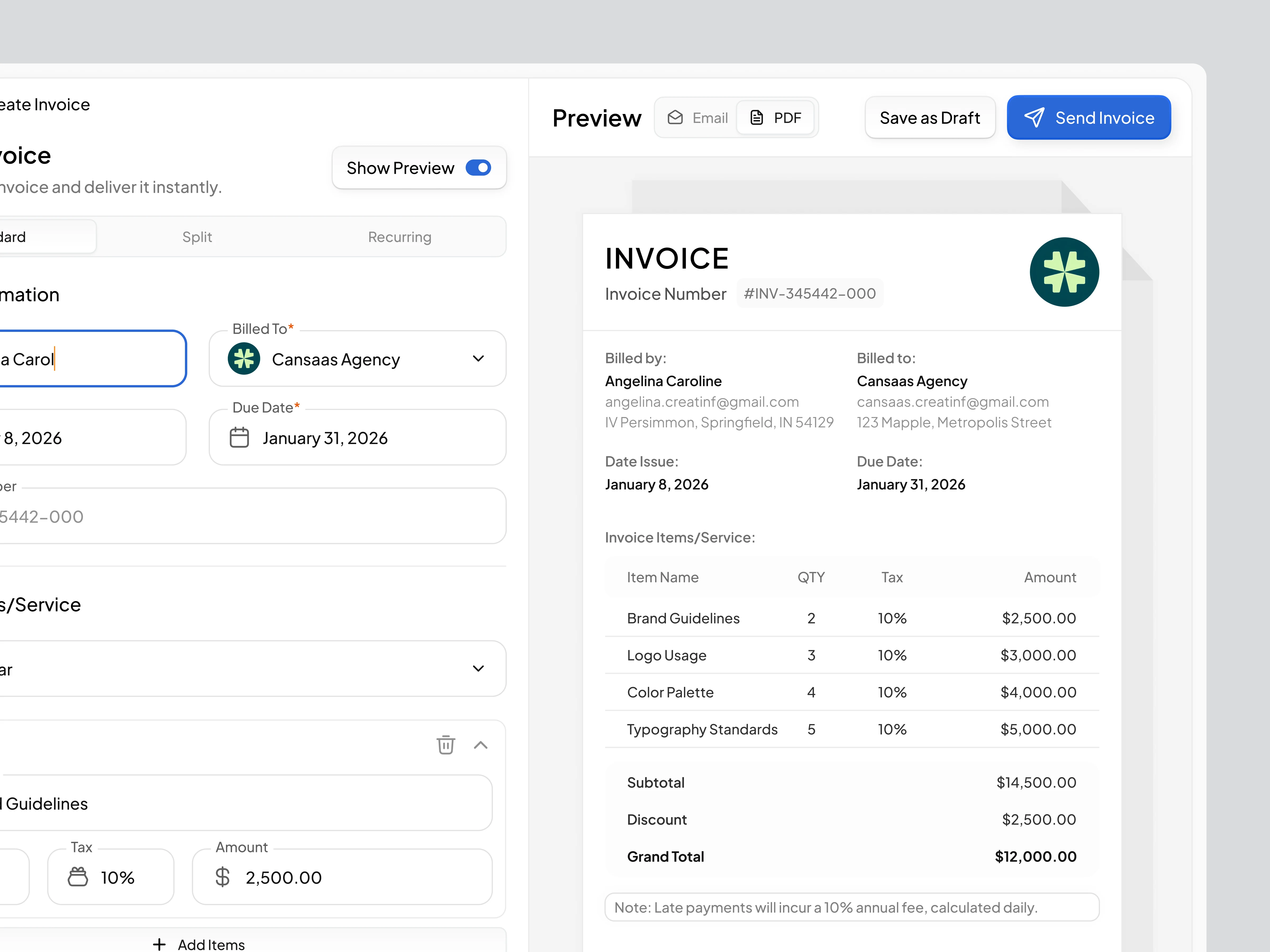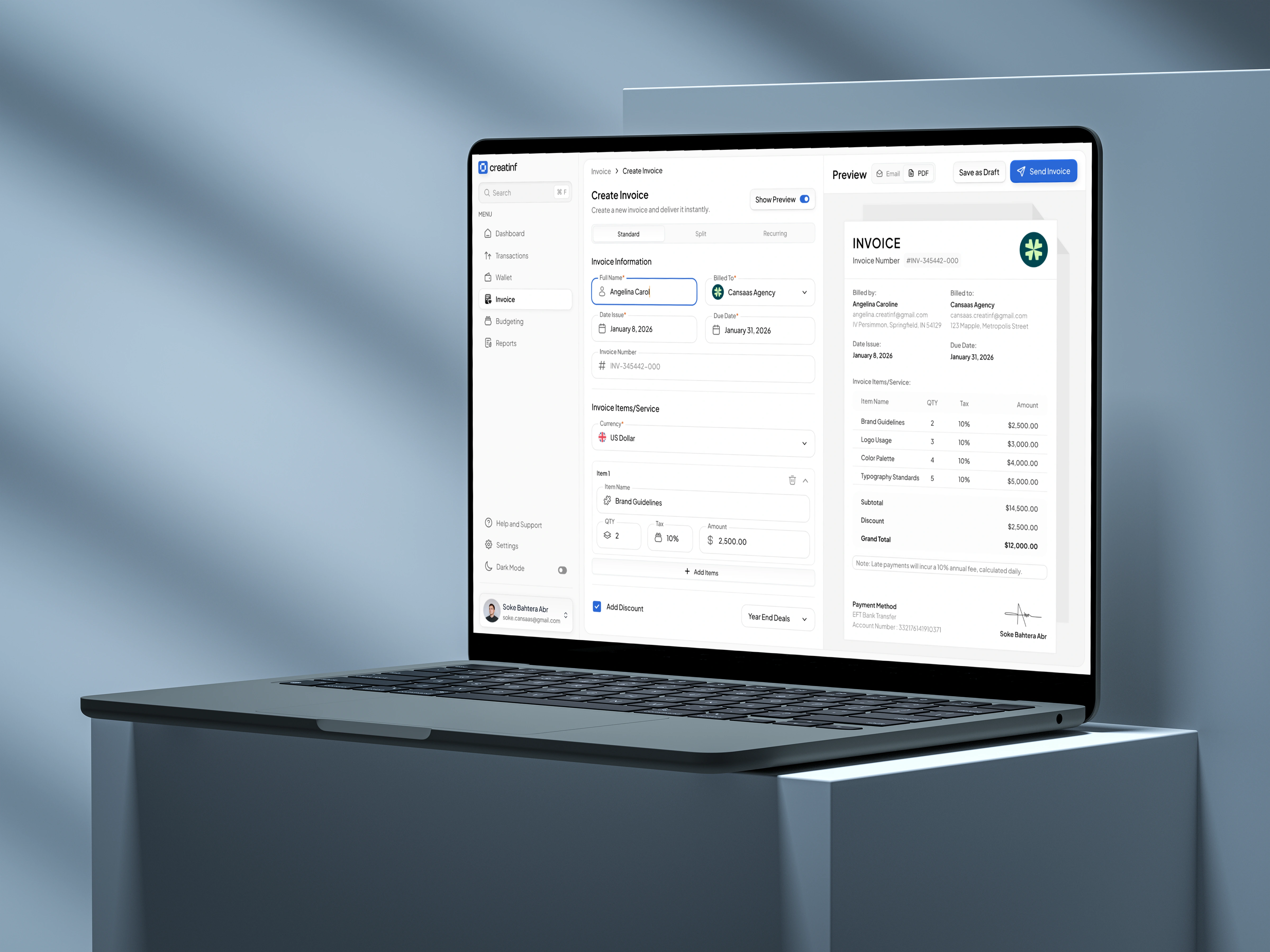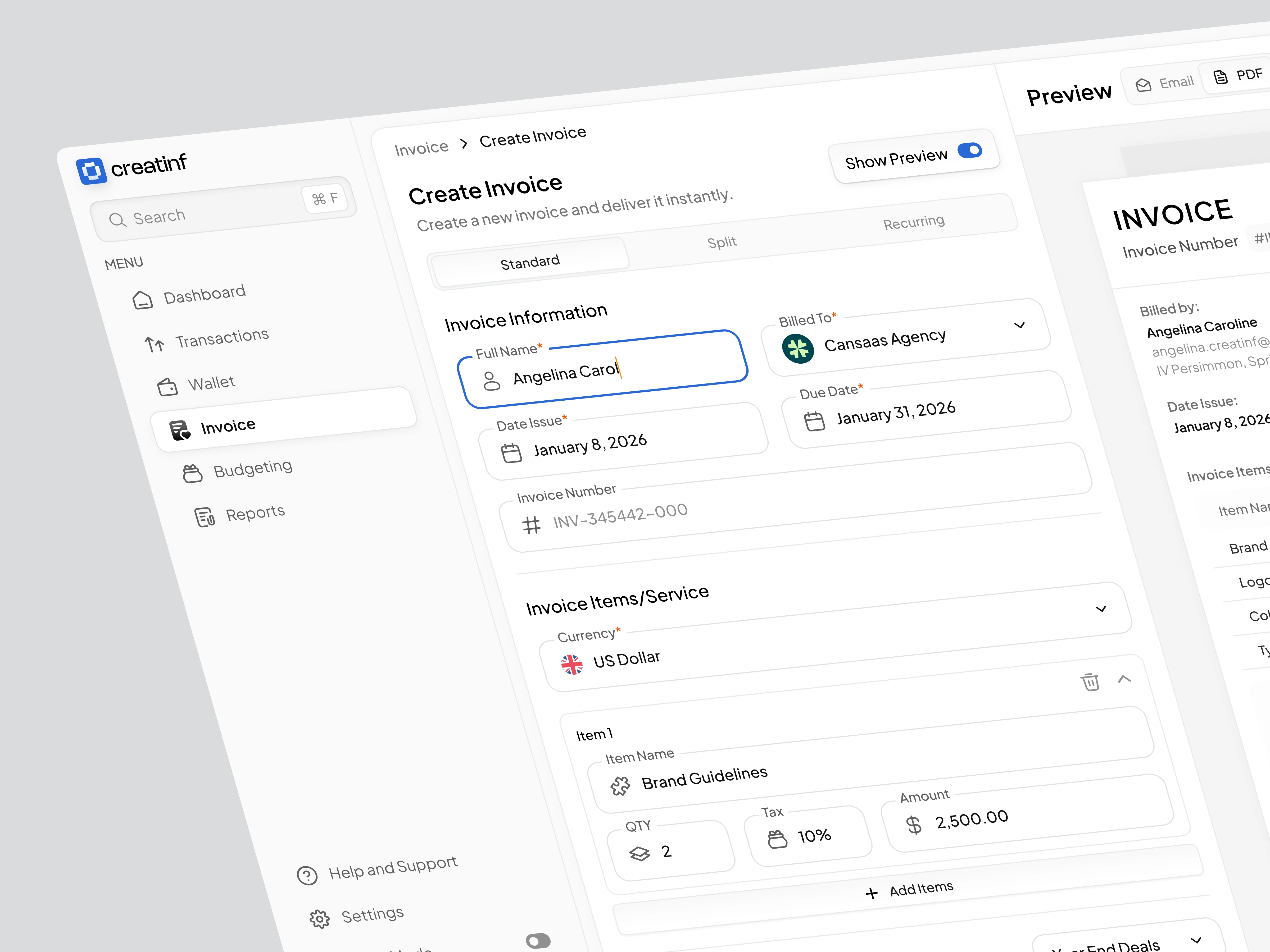 We designed a split layout that clearly separates form inputs and live invoice preview. The interface prioritizes logical grouping, clear labels, and real-time feedback to reduce mistakes and speed up the invoicing process.