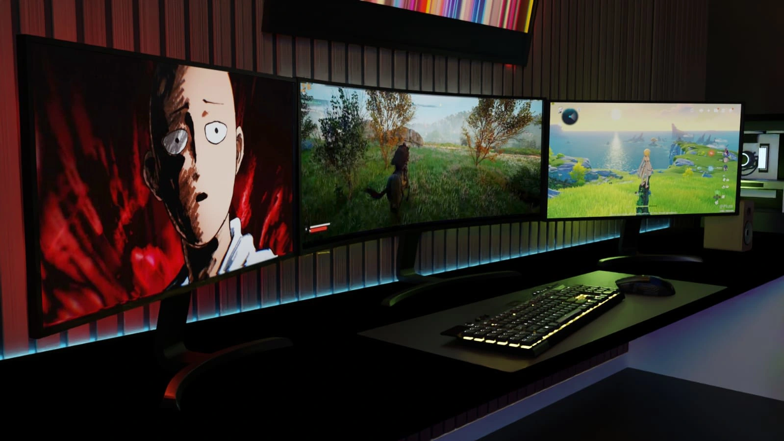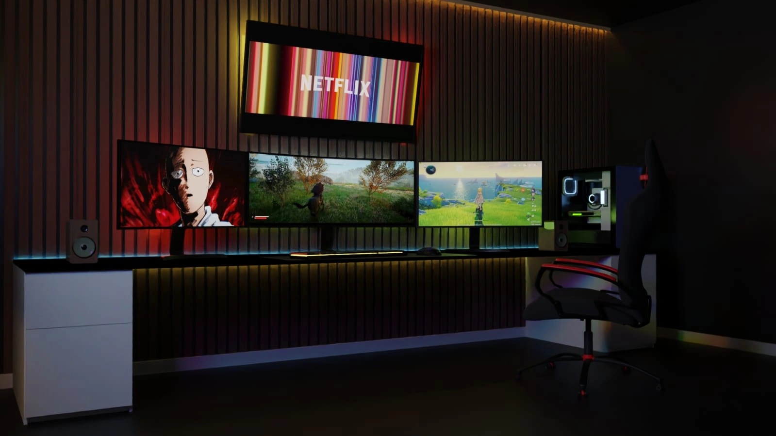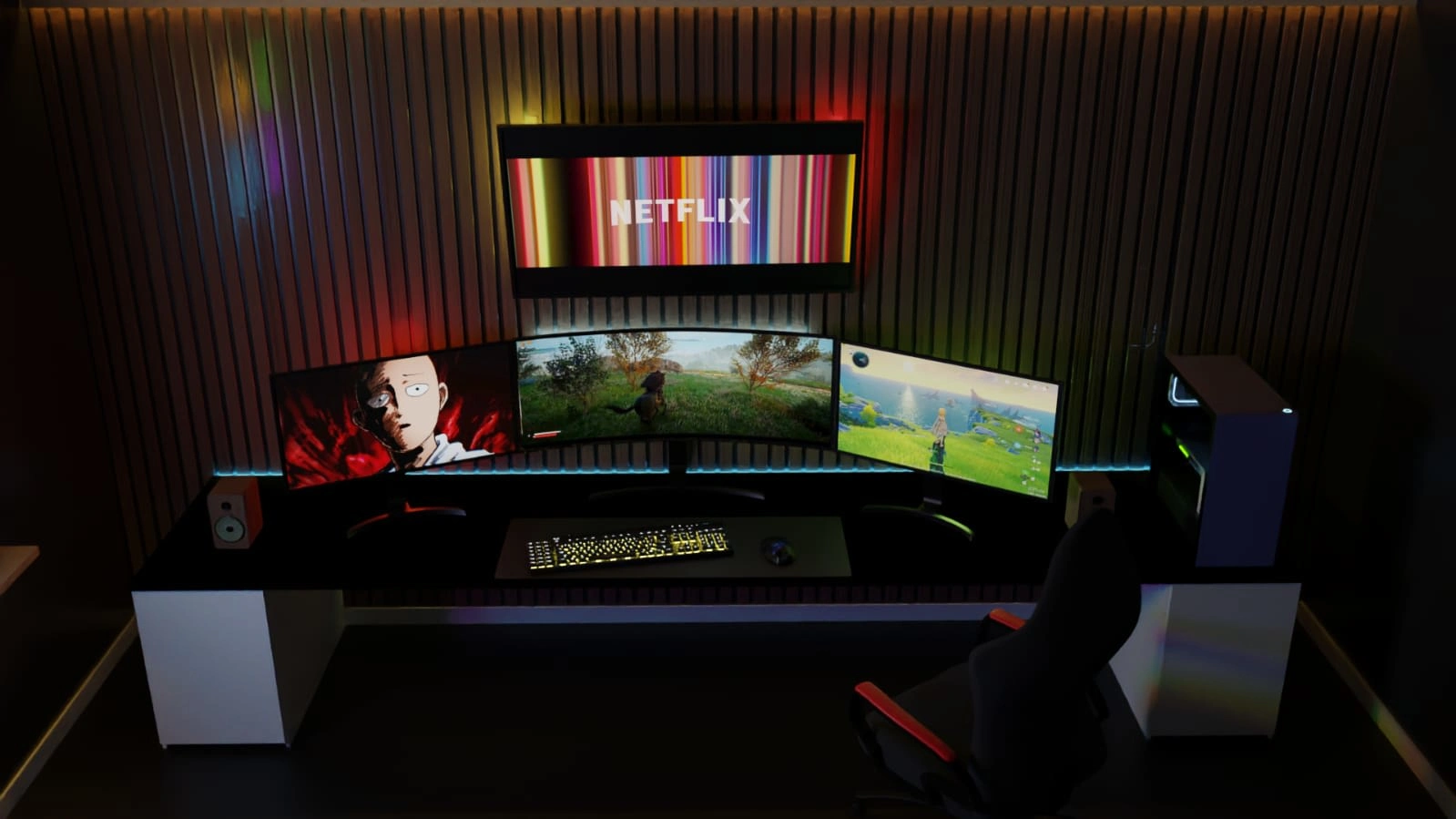 Creation of a 3d model of a gaming setup, which is a dream of many people. Consists of RGB lights in the background, and a high end CPU.