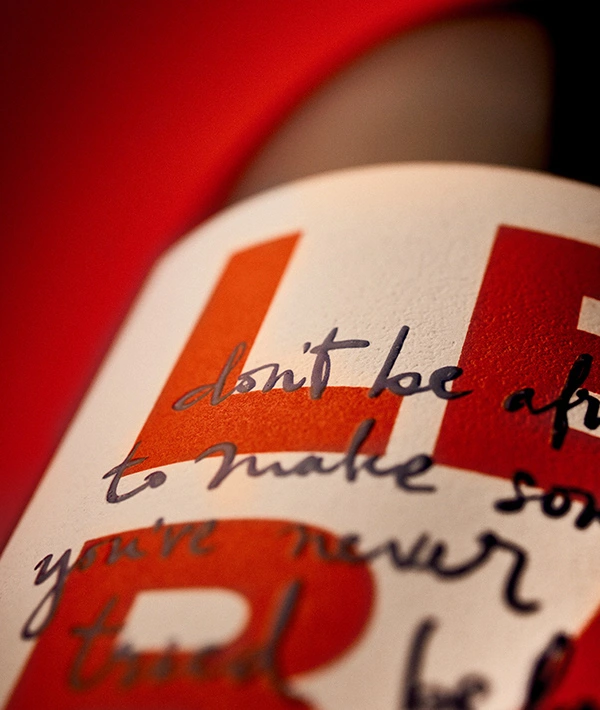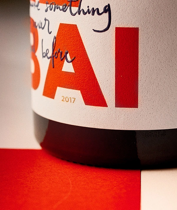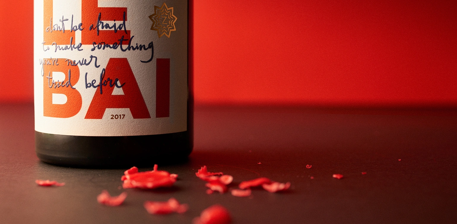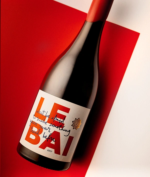 Timeless elegance for Zornitza Estate's Le Bai. A limited edition label featuring bold red type, hand-drawn script, and gold foil for a premium tactile finish.