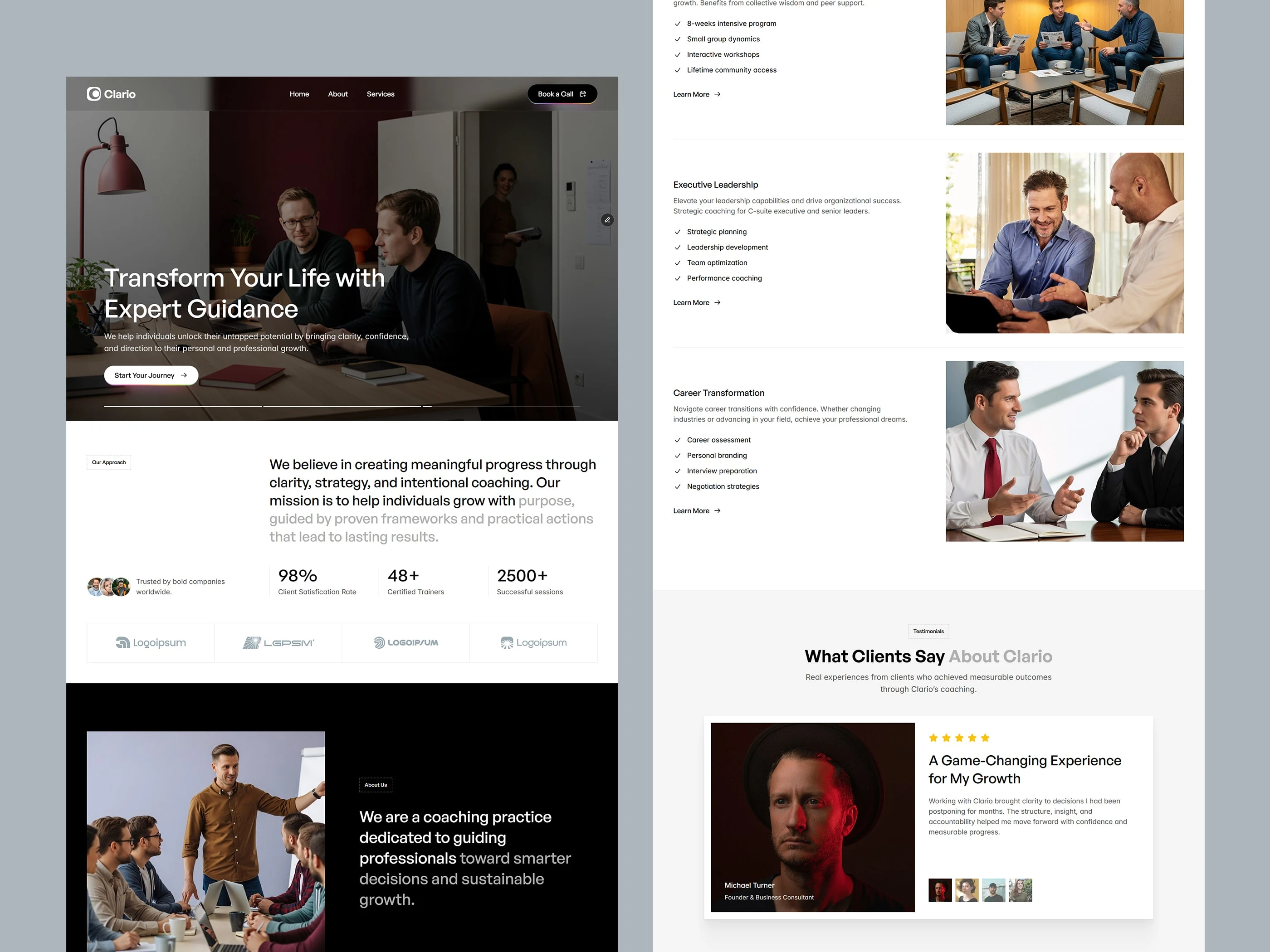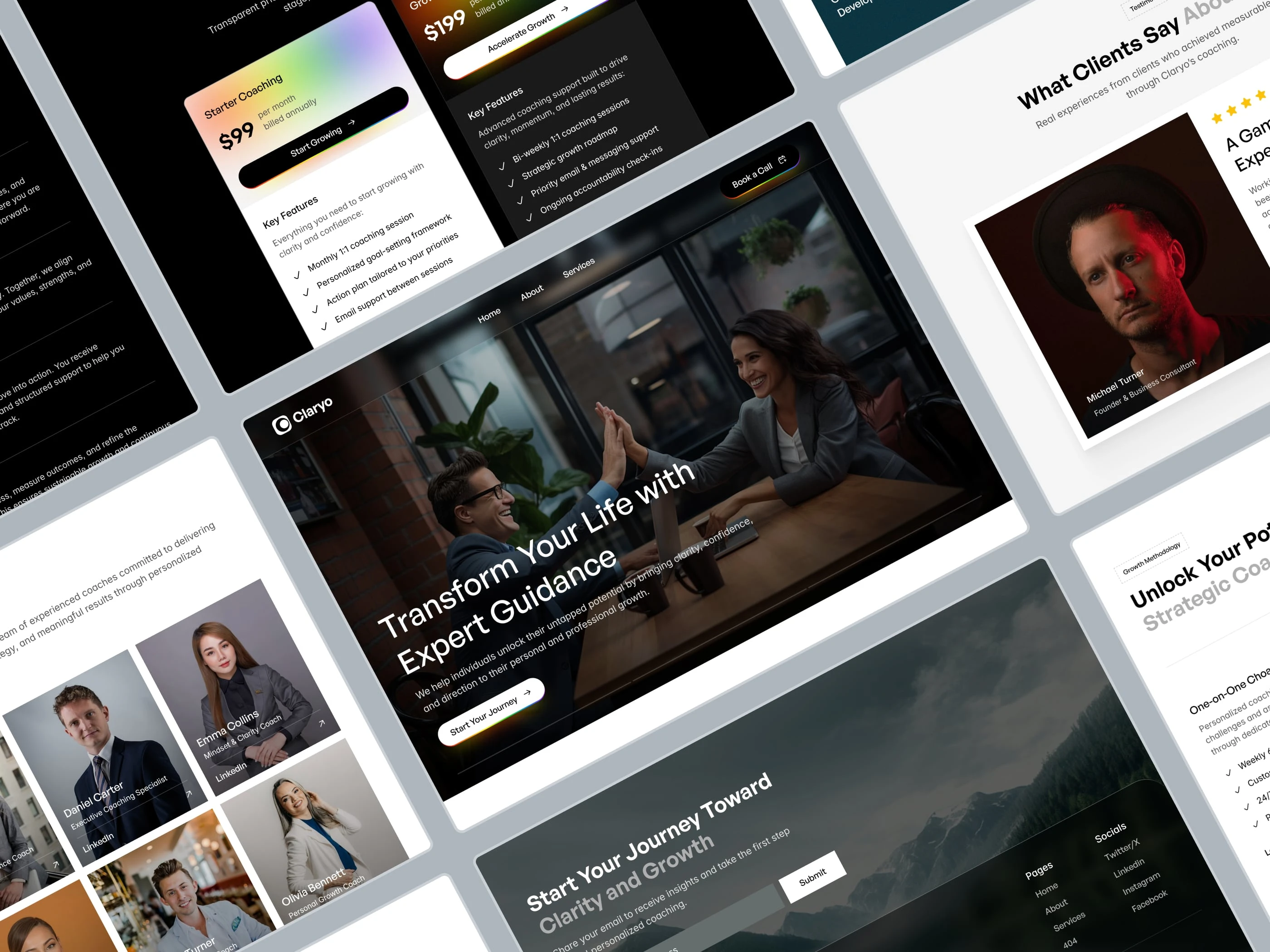 Every section is intentionally structured to communicate authority, build trust, and guide visitors toward action. From growth methodology and service programs to testimonials, pricing, and FAQs, Claryo provides everything needed to present your coaching business with confidence and professionalism.