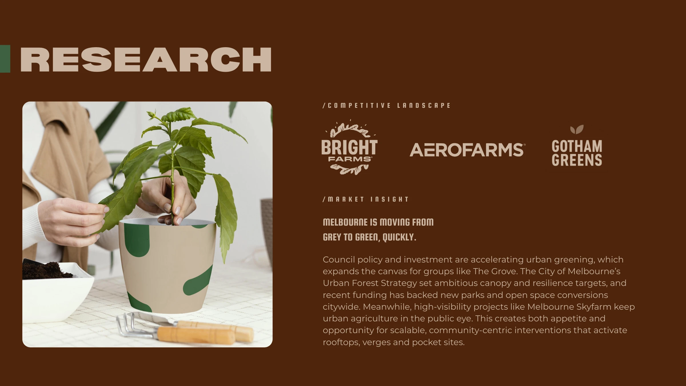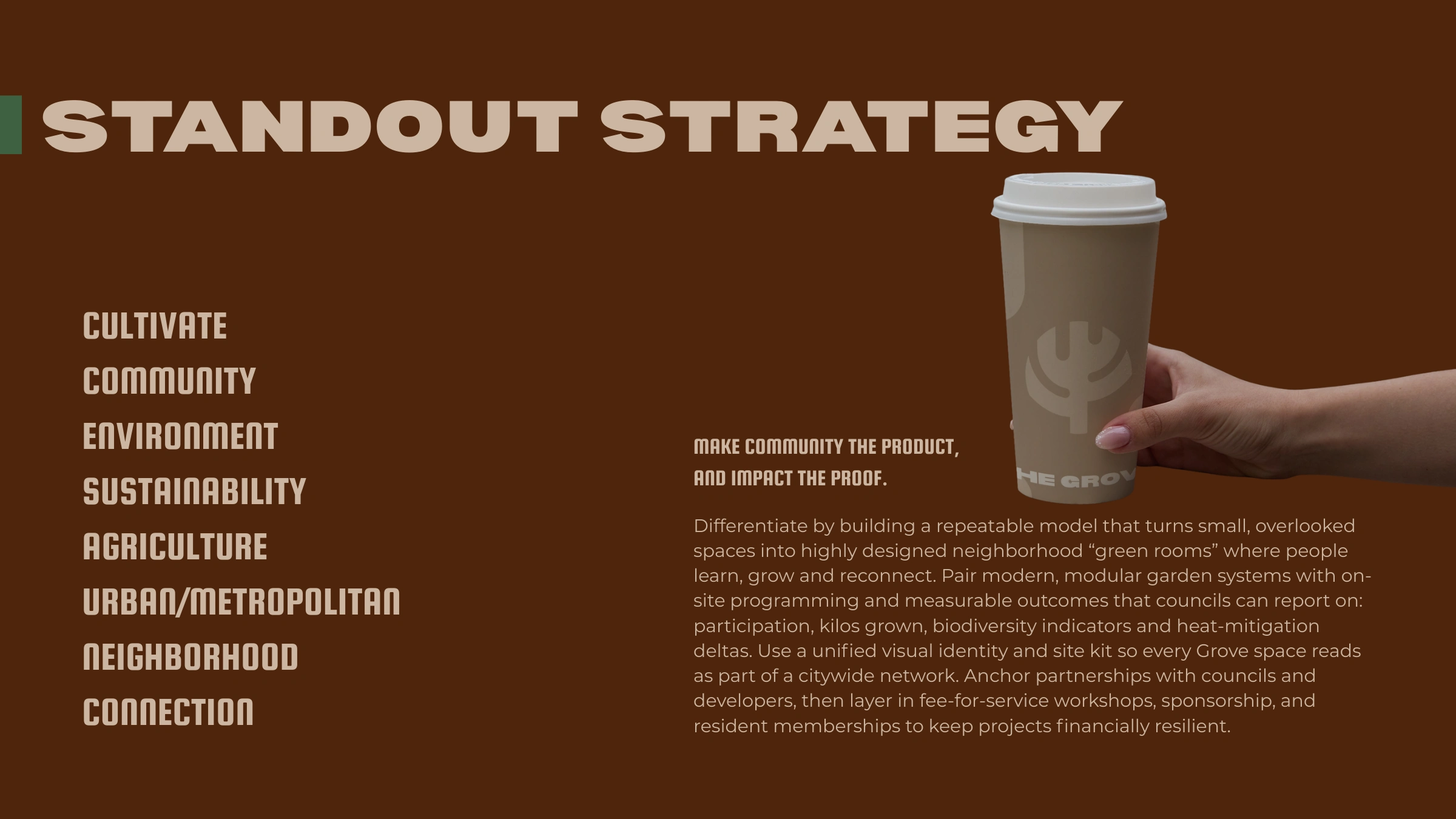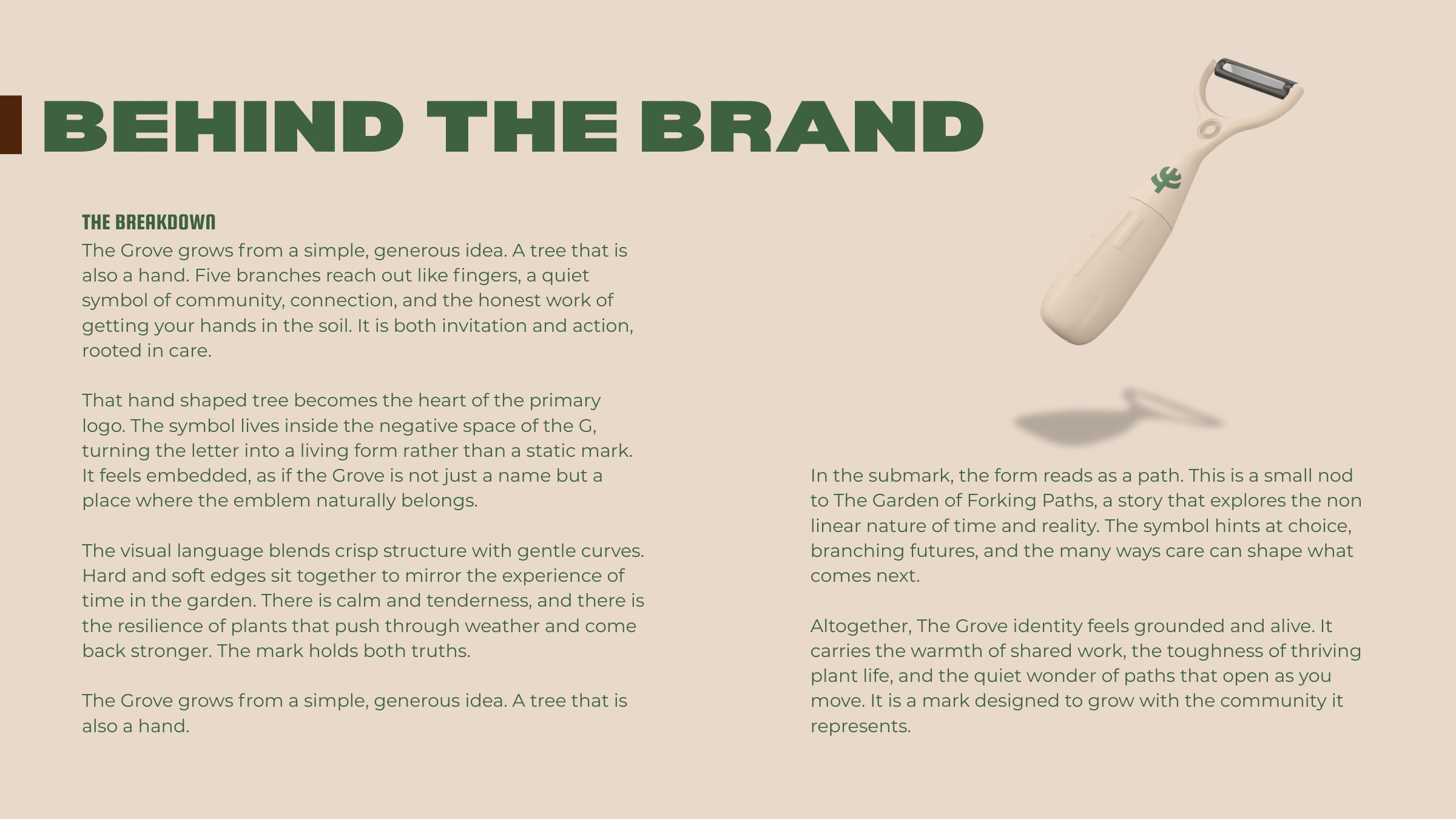 The Grove is a modern neighborhood provisions brand rooted in slow living and seasonal abundance. It gathers the calm of a canopy and the craft of a kitchen into one thoughtful identity that feels fresh, grounded, and generous. A refined wordmark with soft organic curves pairs with an emblem that moves from seed to sprout to canopy, celebrating growth and care. The palette leans into deep greens, sunlit neutrals, and a touch of copper that nods to handwrought tools and warm hospitality. Tactile textures, honest typography, and clean grid systems bring the brand to life across packaging, product, and web, creating a calm, confident presence that invites people to shop well, eat well, and feel connected to the source.