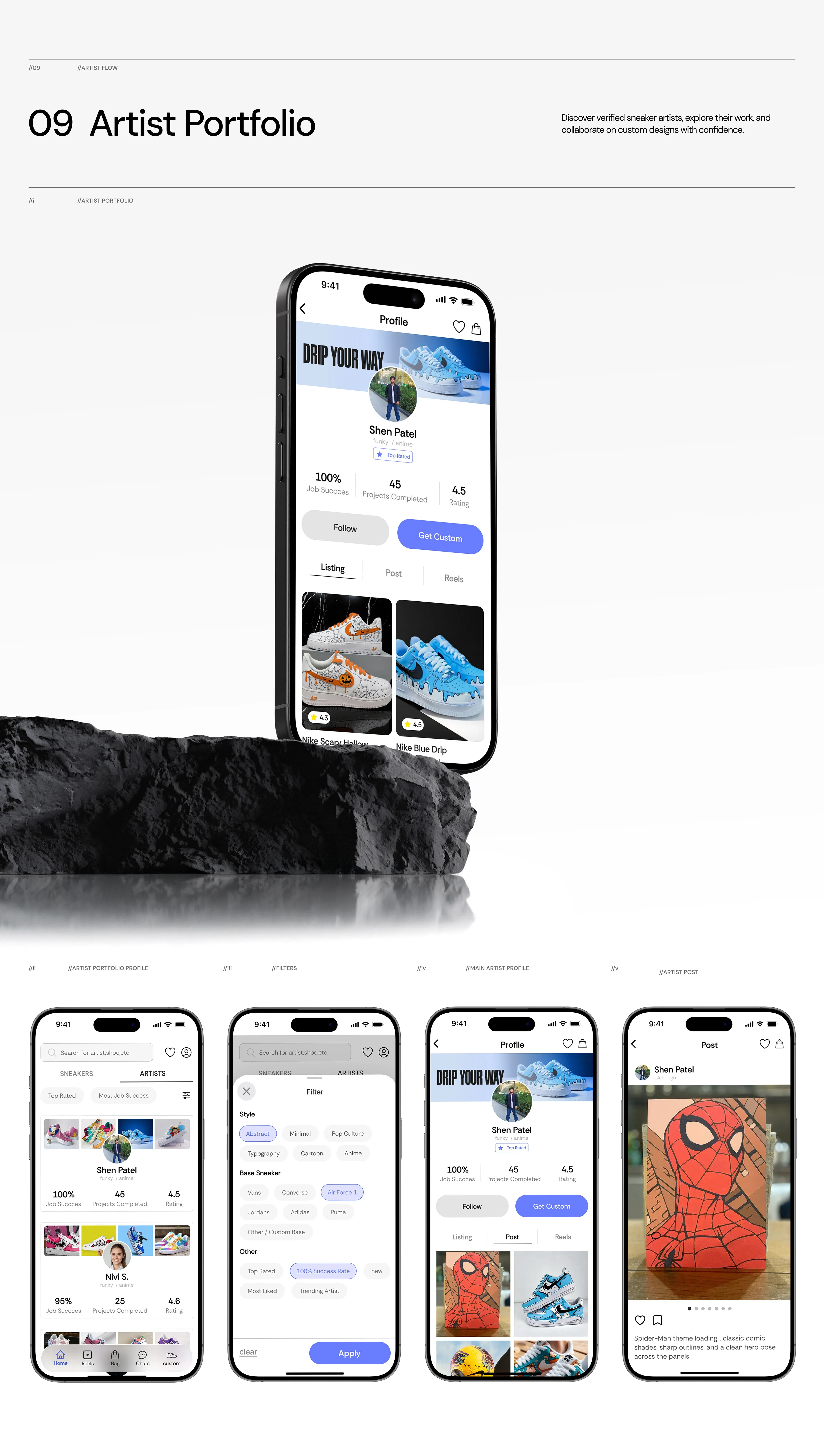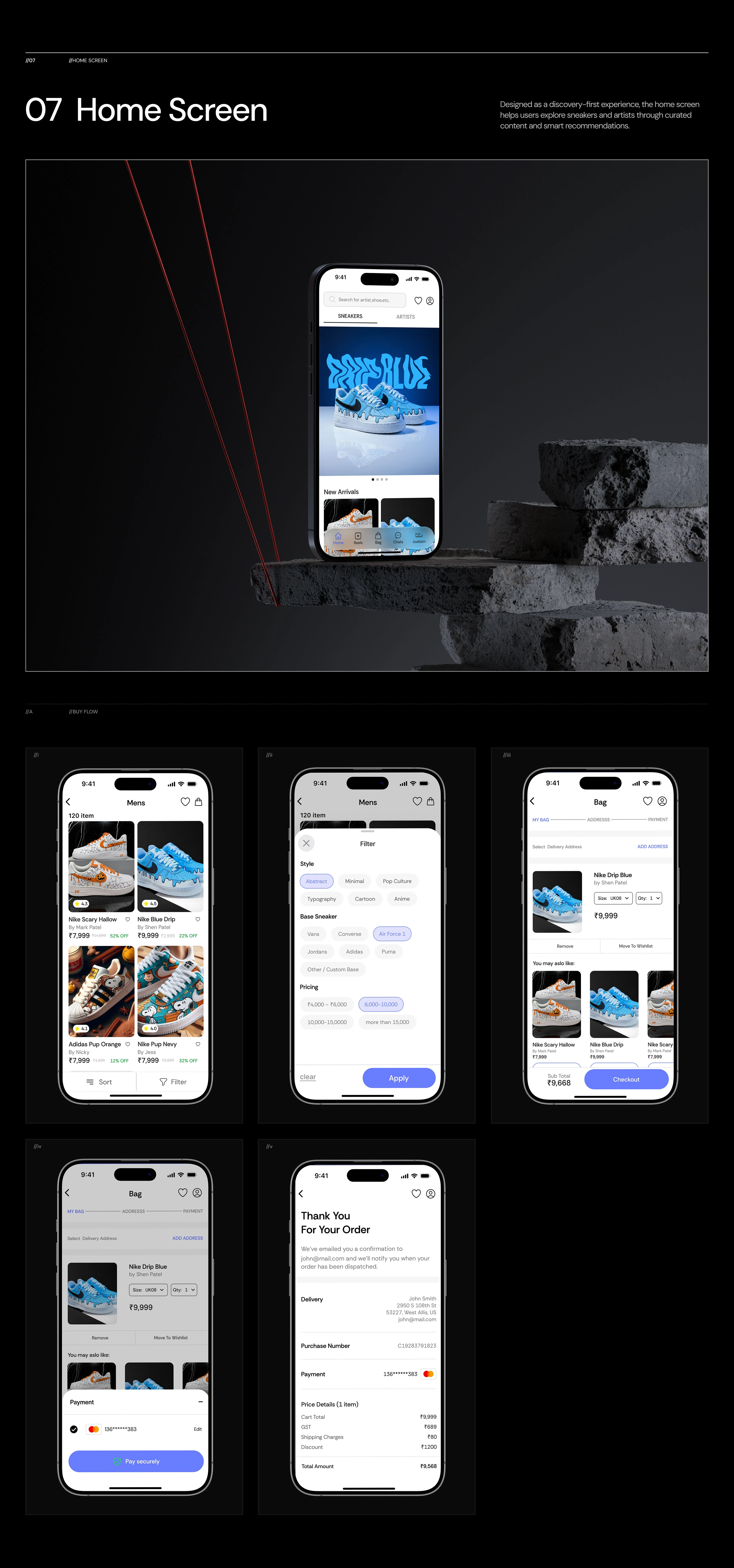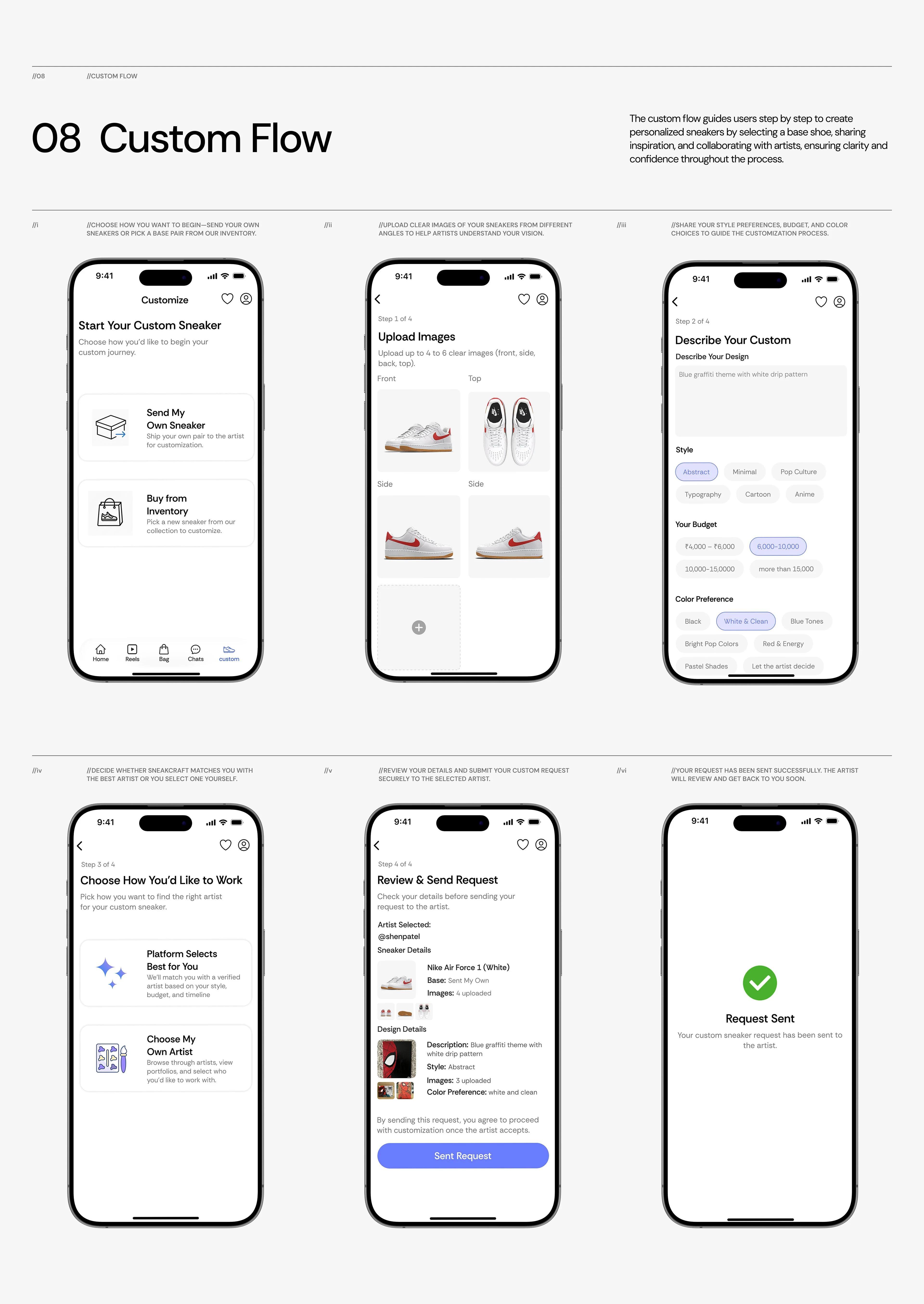 This project showcases the iOS UI design for SneakCraft, a custom sneaker marketplace app designed to deliver a clean, modern, and intuitive mobile experience.