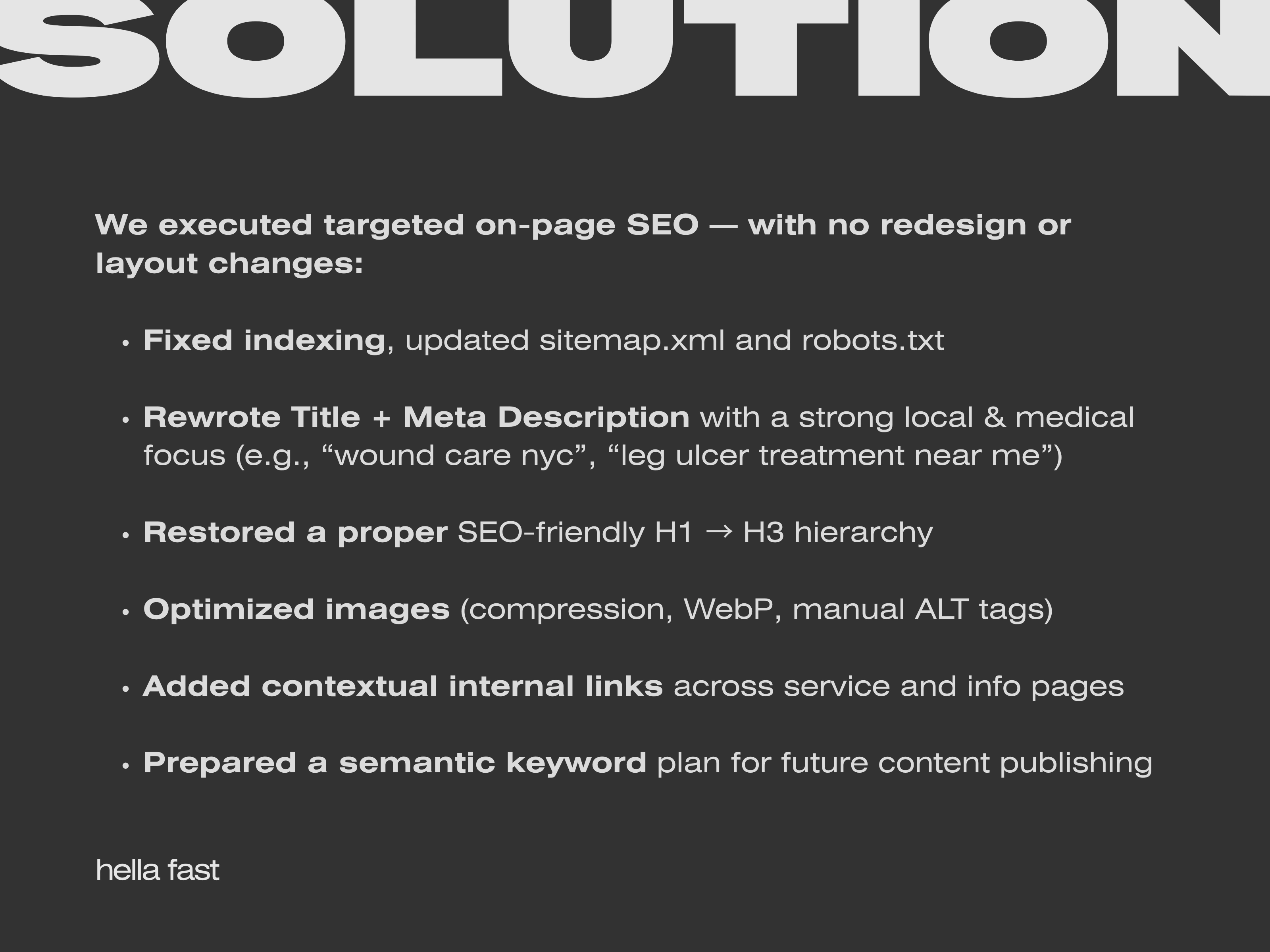 SEO optimization for a wound care clinic — fixed indexing, improved structure, and boosted organic traffic by 21% in under 3 weeks.