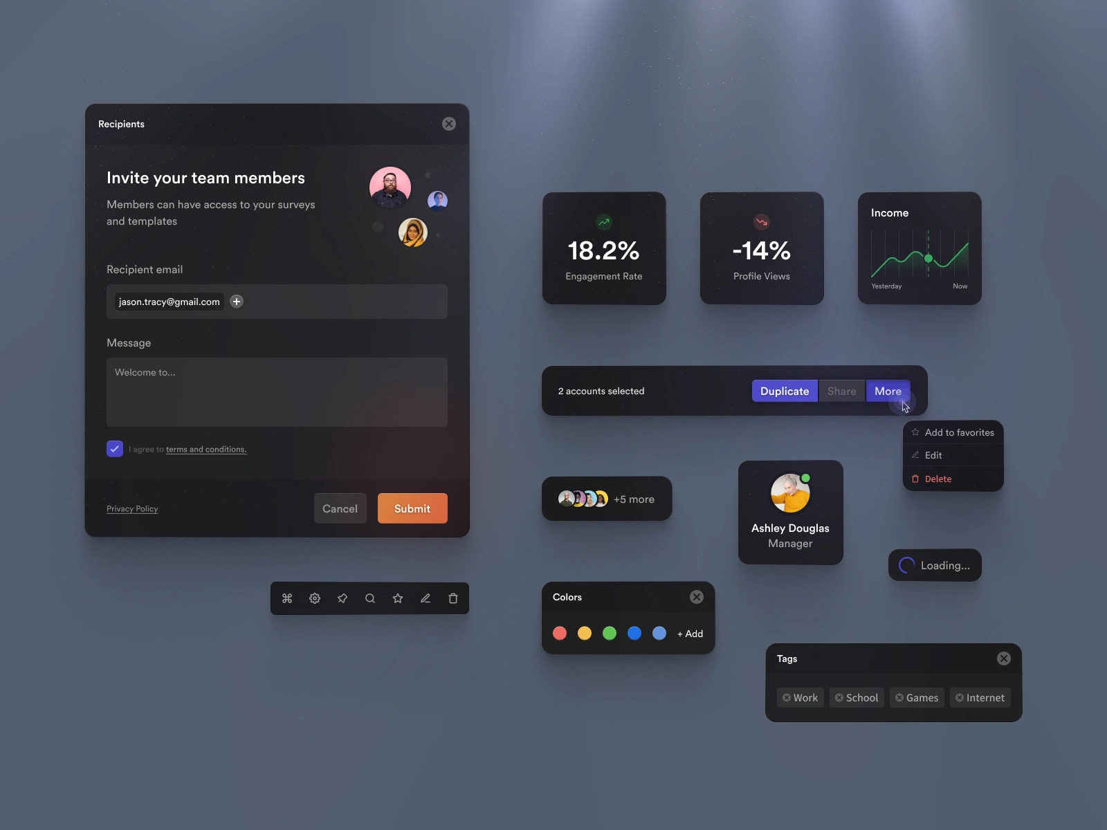 A modern dark-themed UI kit designed for collaboration platforms, showcasing clean components, analytics cards, and interactive elements for a seamless UX.