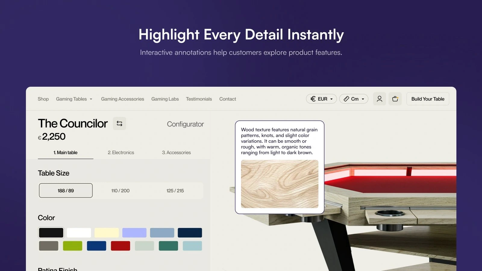 Built with Three.js and WebGL, our configurator runs seamlessly across modern browsers and devices. It supports textures, color/material switching, dynamic components, and annotations - all optimized for loading performance.