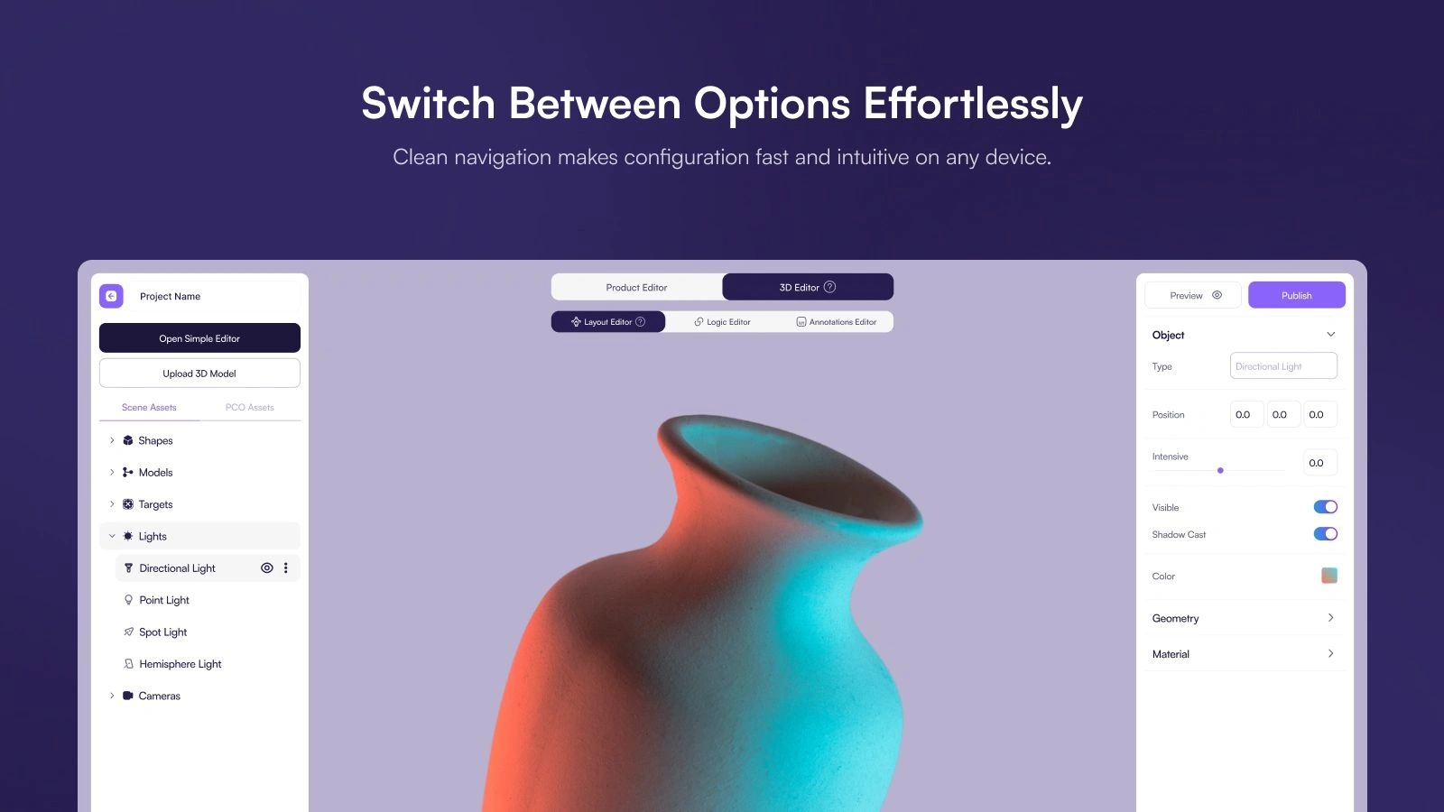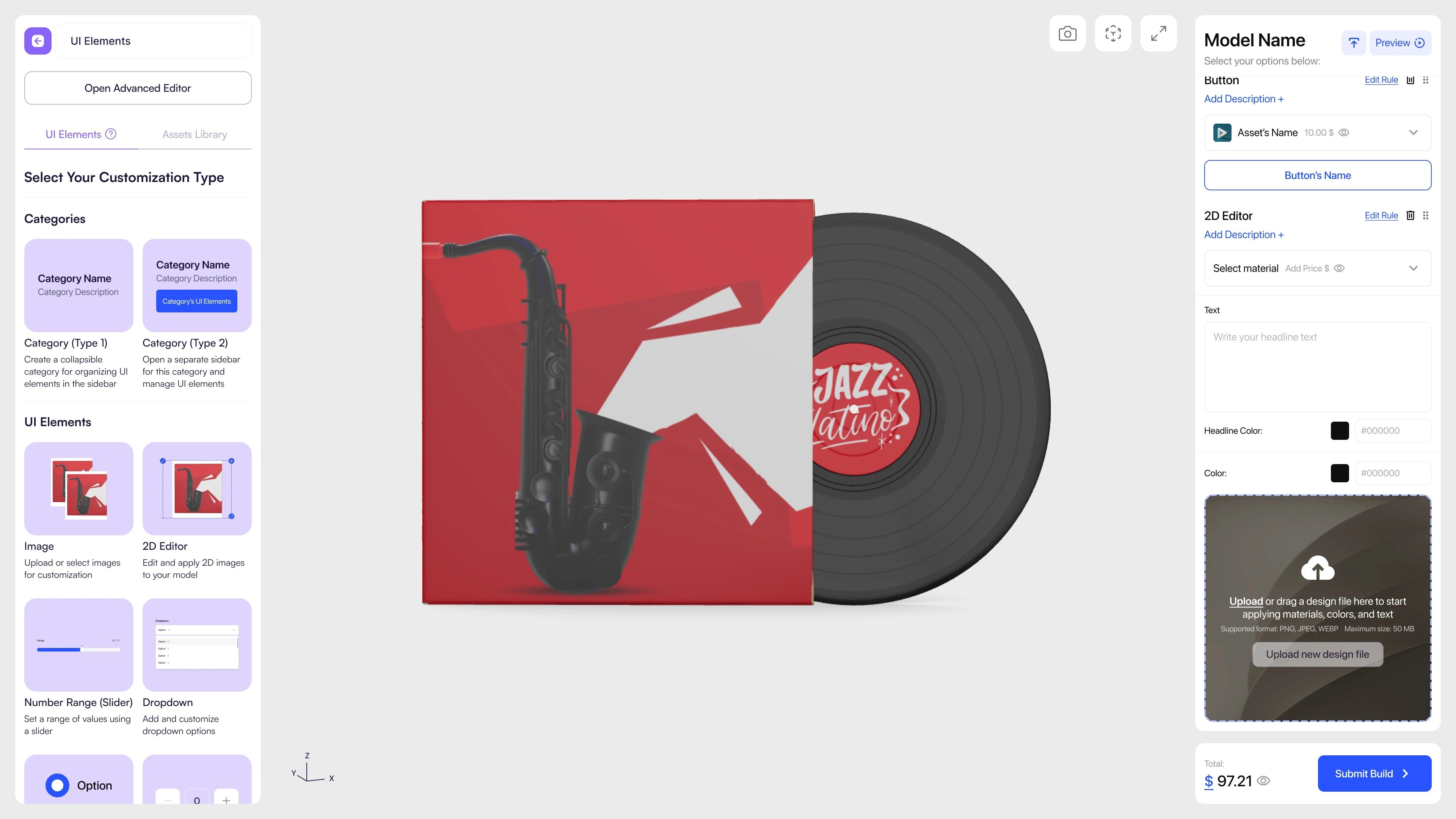 Admins can upload GLB/GLTF models, define customization logic, organize parts and options, and structure the user journey - without needing 3D software skills.
