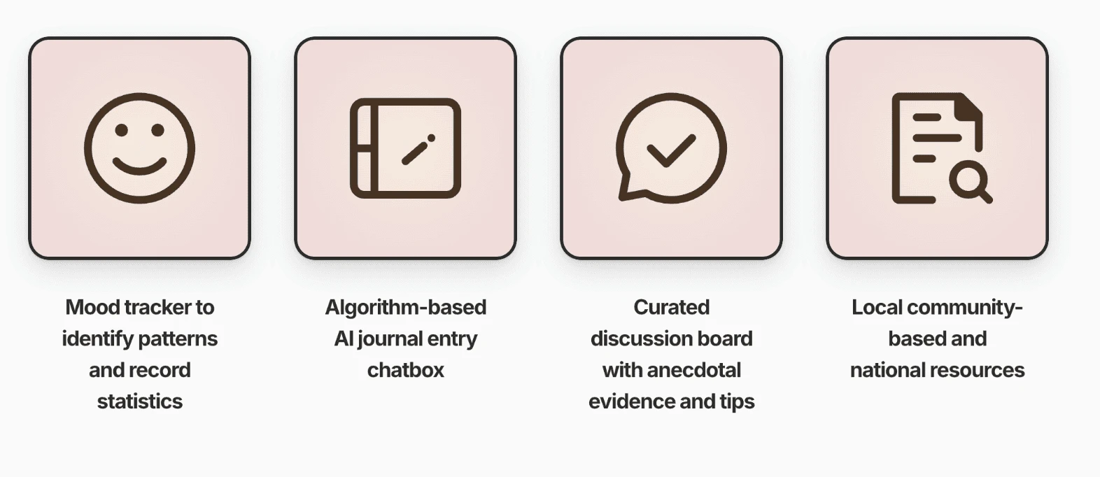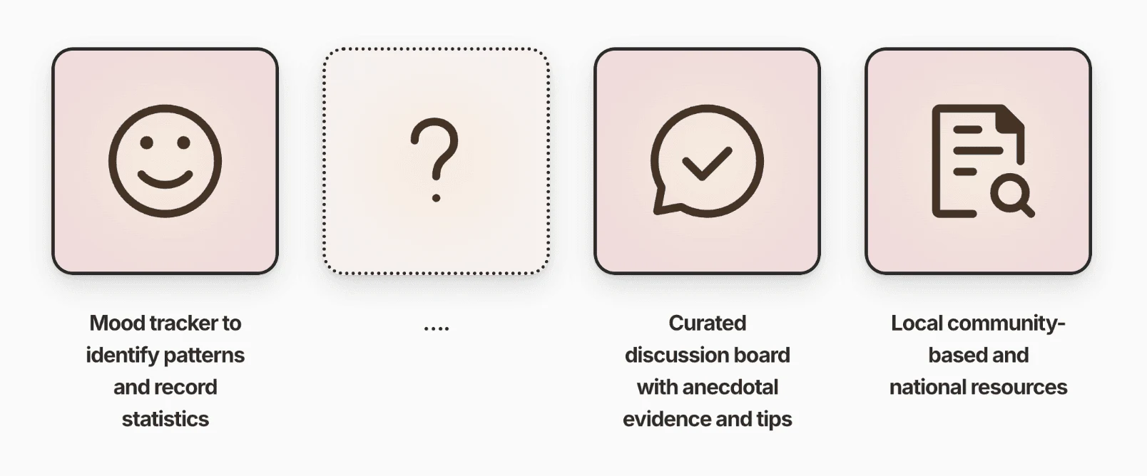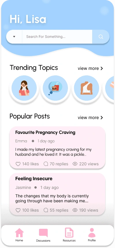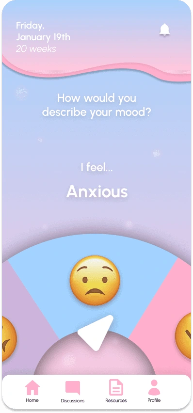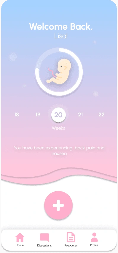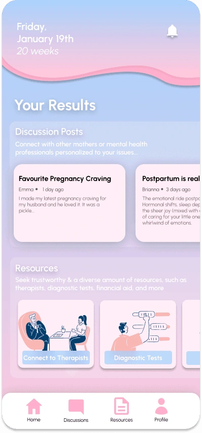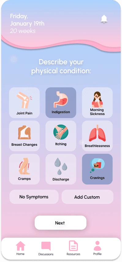 With a tap of the plus, you can add a daily entry: where the user can log their feelings, physical symptoms, and any additional comments or topics they want to vent. After submission, the algorithm will analyze their entry and take into these 3 criteria, as well as keywords to curate data for the personalized discussion posts and resources, in the next flow.