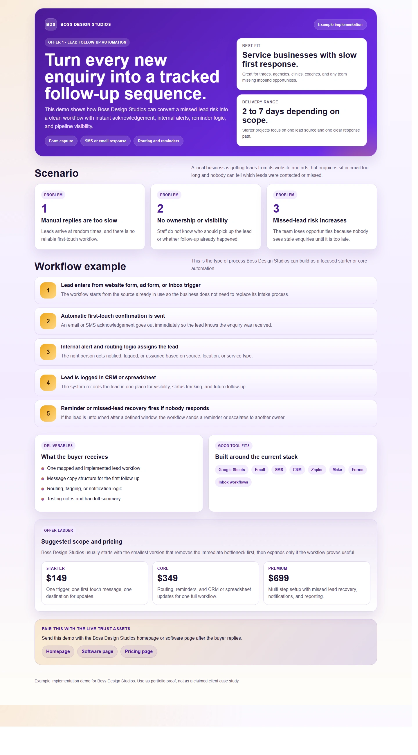 Self-initiated workflow demo showing faster first response, lead routing, reminders, and CRM updates for service businesses.