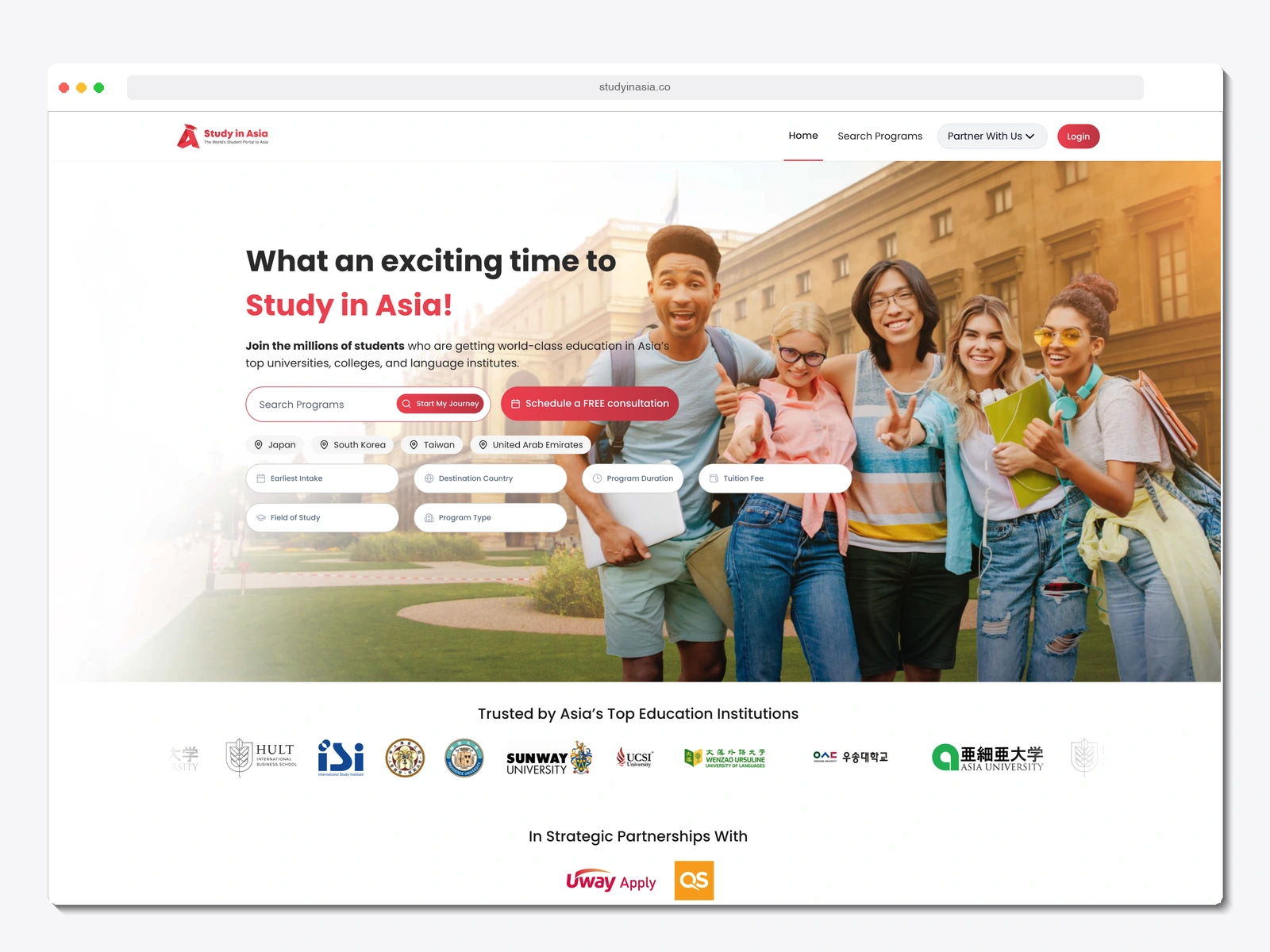 Study in Asia (studyinasia.co) is a multi-tenant SaaS platform that connects international students with universities across Asia. The platform serves 130+ institutional tenants and 270+ active users, providing program discovery, student applications, and a full partner management portal.