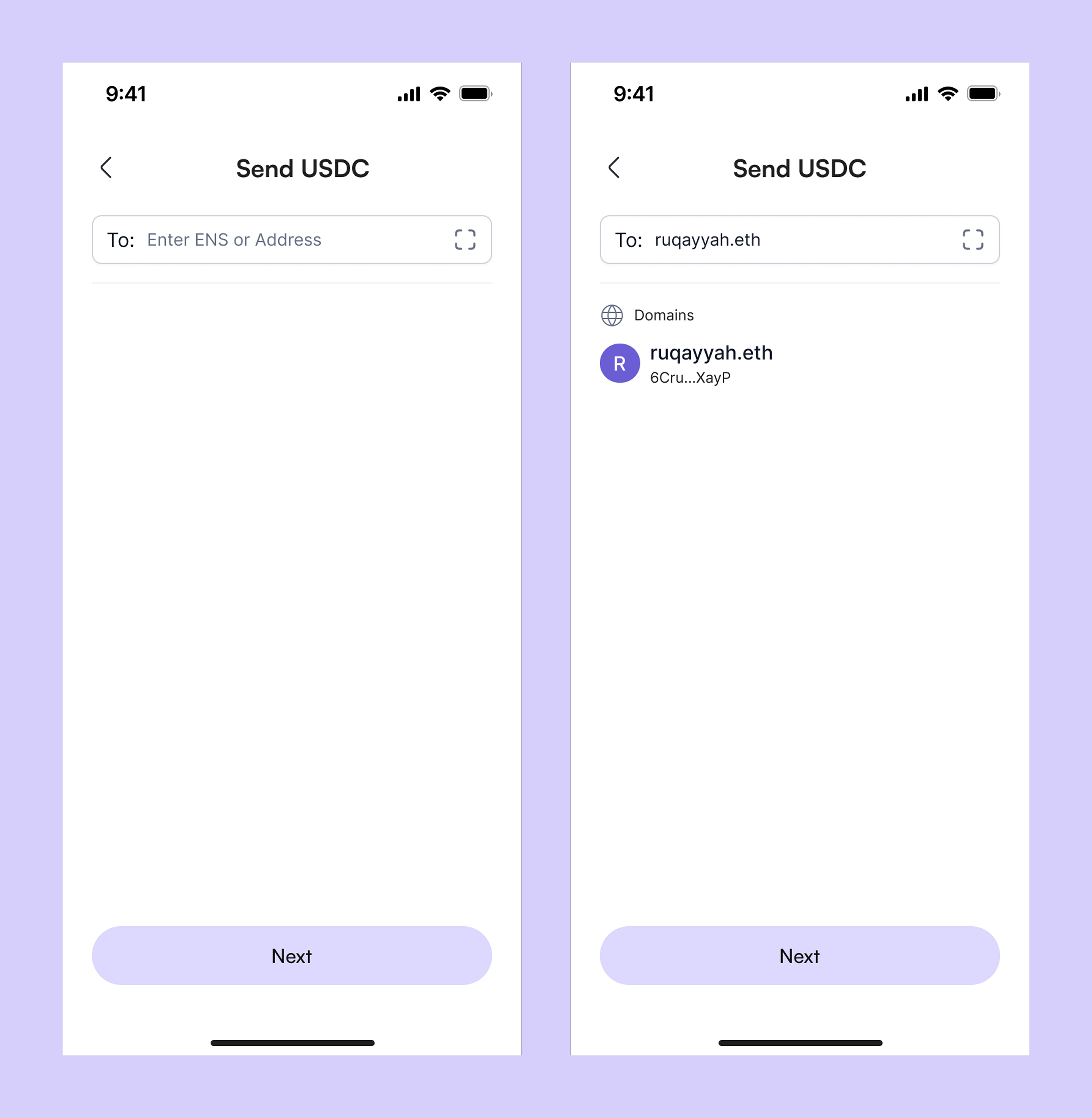 Instead of pasting a 42-character address, users type something more human like ruqayyah.eth. The app resolves the ENS and displays the correct EVM address + avatar for trust.