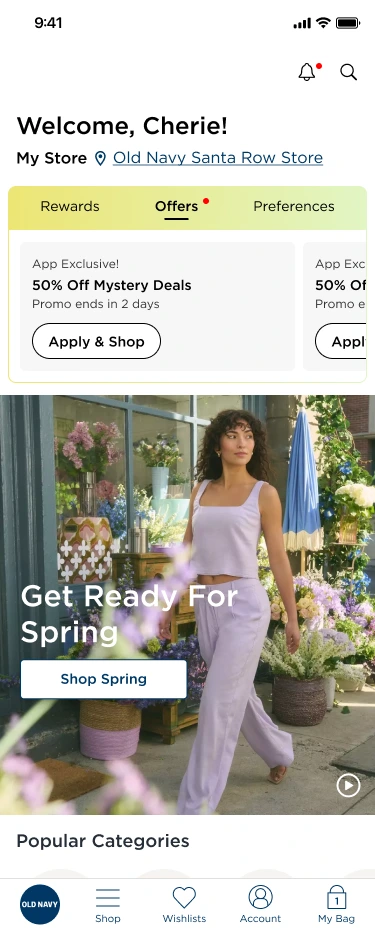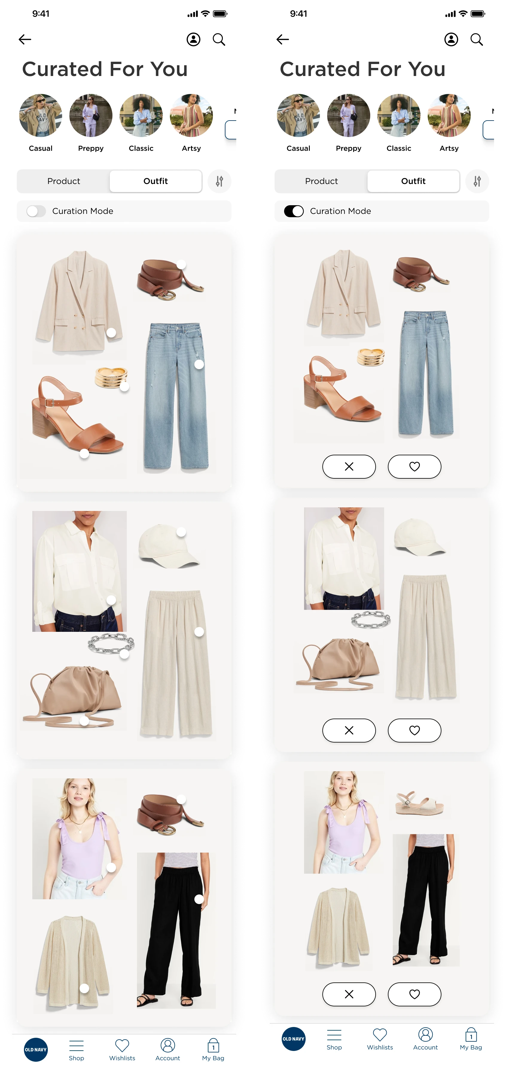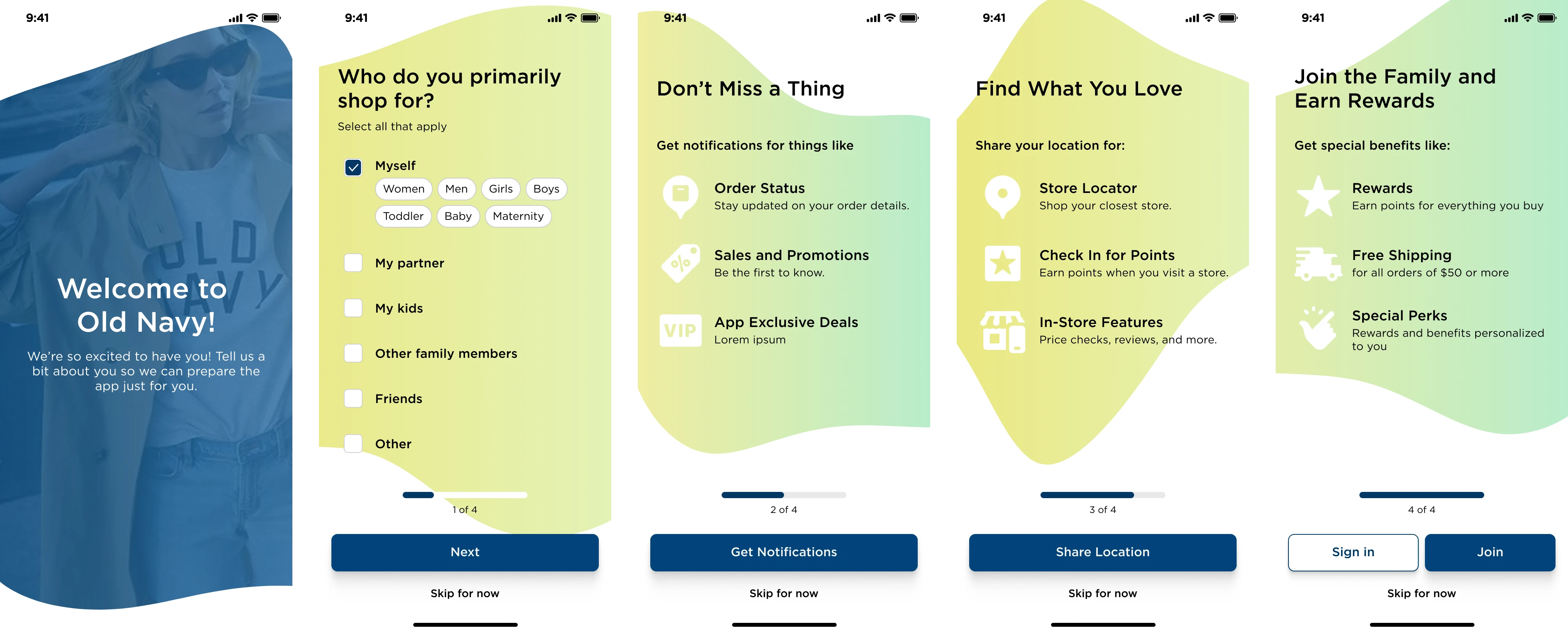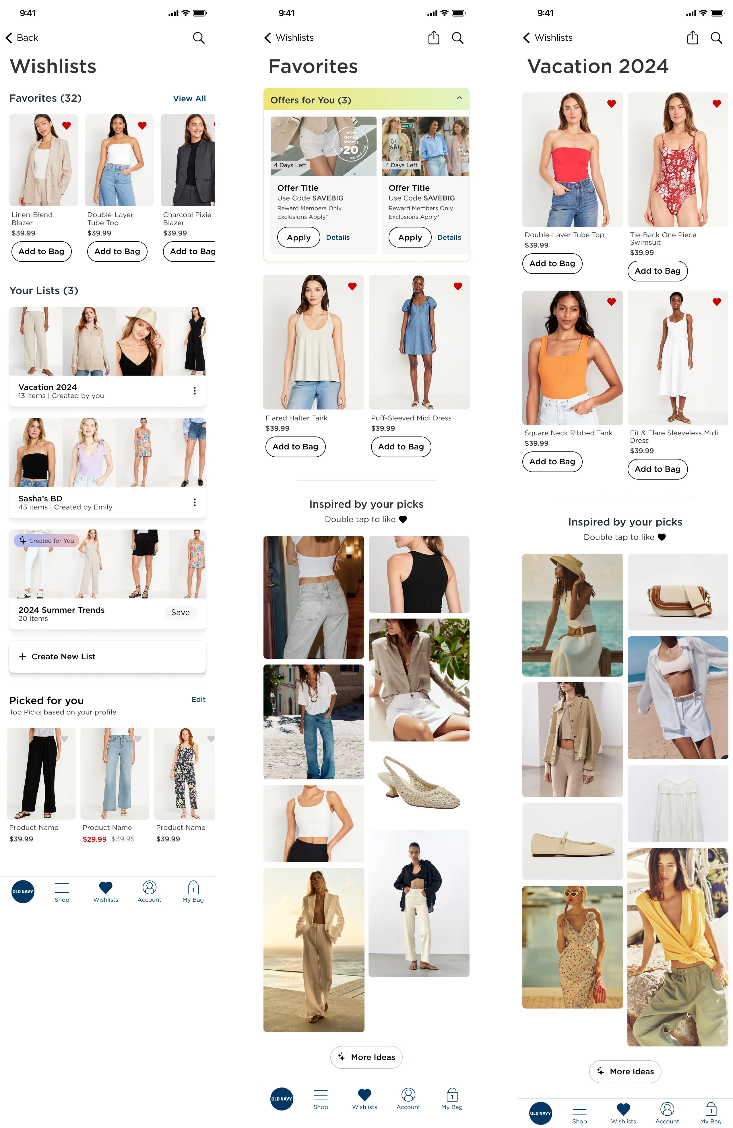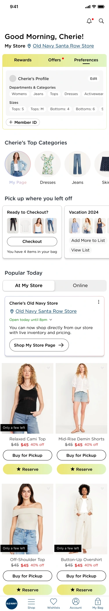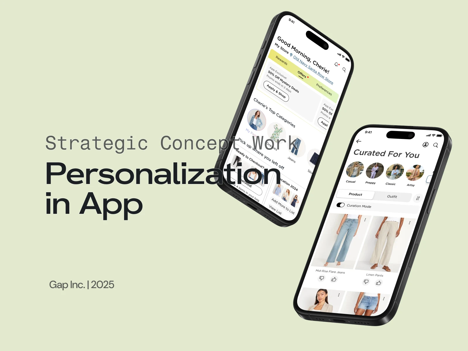 This project was one part of a three-pronged personalization strategy for Gap Inc.’s mobile apps. Each concept was scoped into a two-week sprint to explore, design, and prototype, enabling the research team to run quick user tests. I focused on personalization, with primary attention on the home screen, category page, and wishlists, using Old Navy as the test brand.