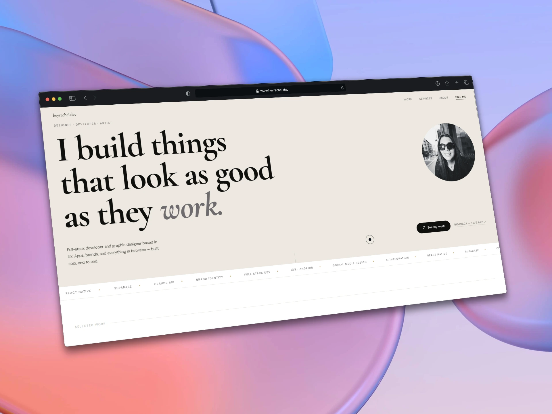 Full portfolio site built from scratch in HTML, CSS & JS — no templates. Features an AI quote generator, live app showcase, and 7+ years of design work.