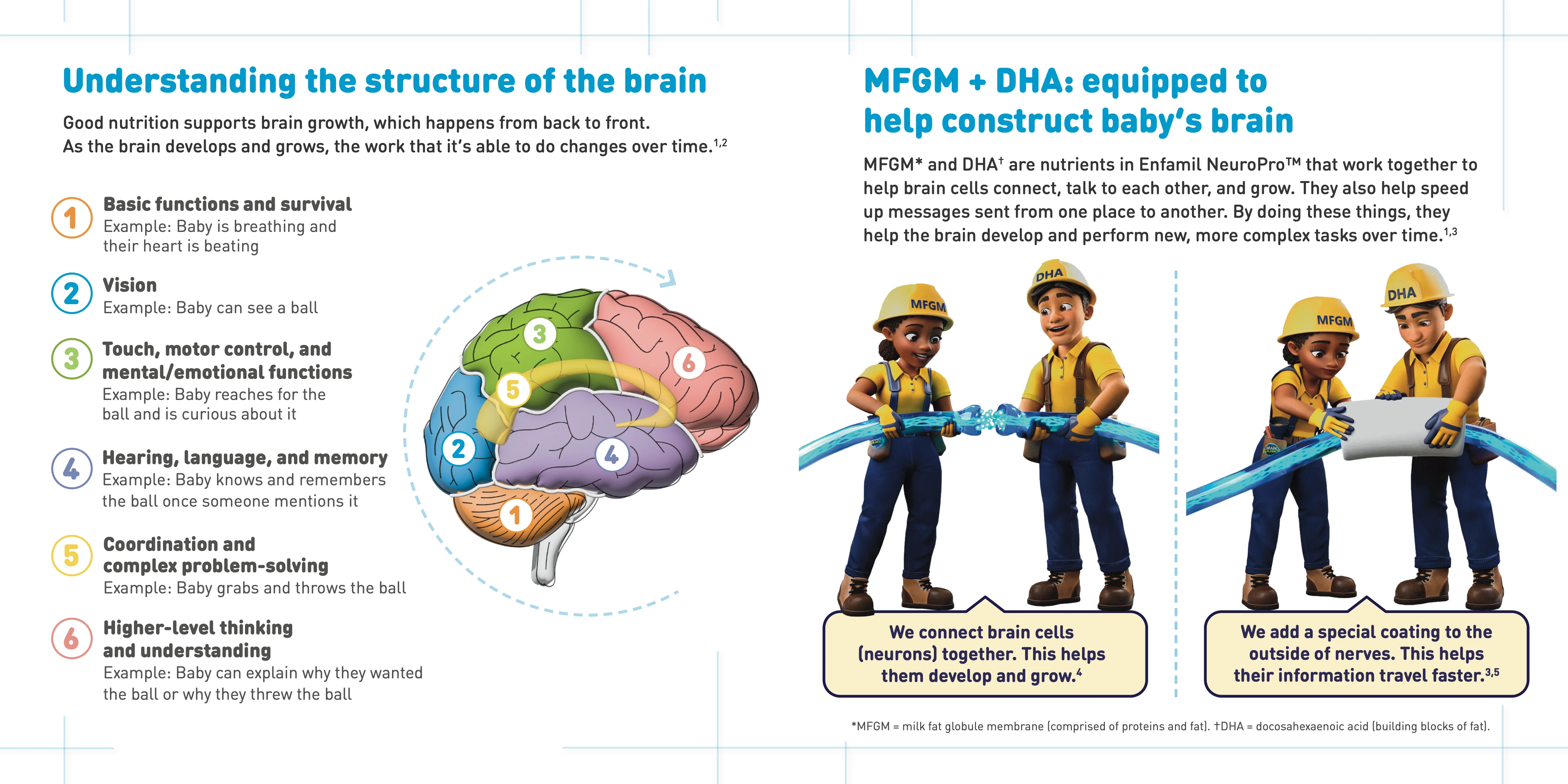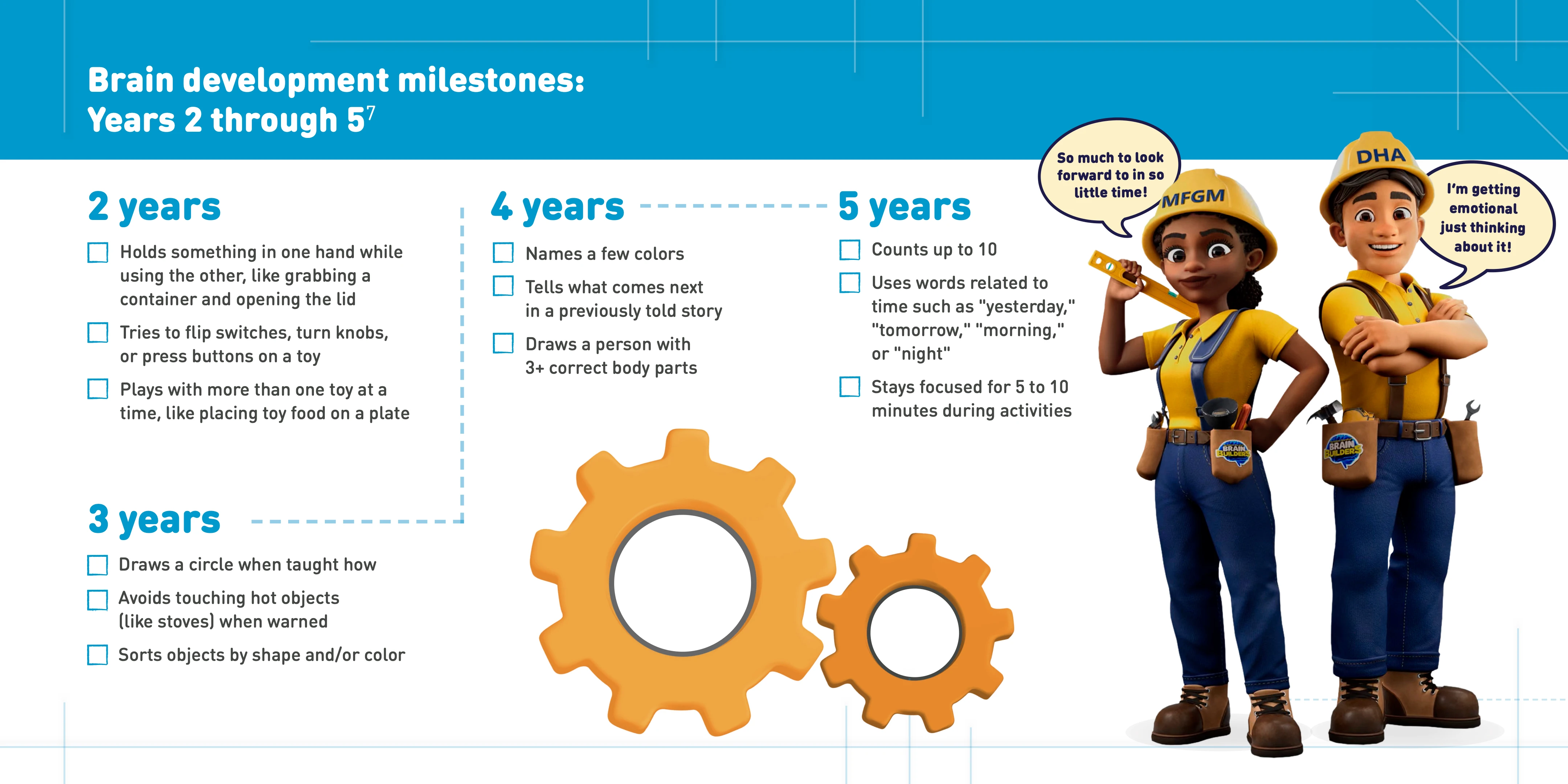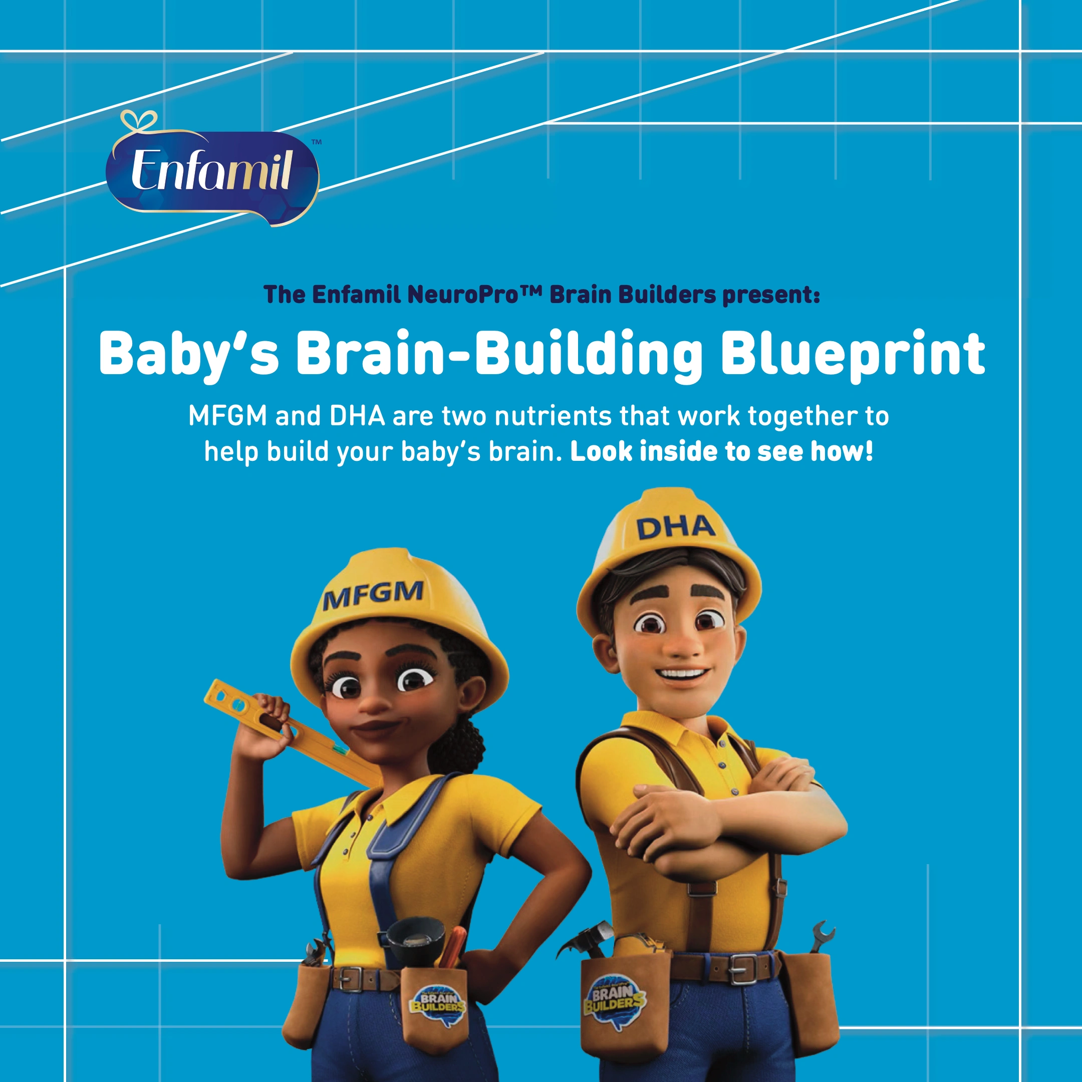 Enfamil NeuroPro is a brain-building baby formula. So, naturally, it needs brain-building mascots! The Brain Builders are construction workers that represent key nutrients in Enfamil NeuroPro that help support a baby's developing brain. In this piece, The Brain Builders provide a literal blueprint to parents that details the developmental and behavioral milestones that they may see in their child.
