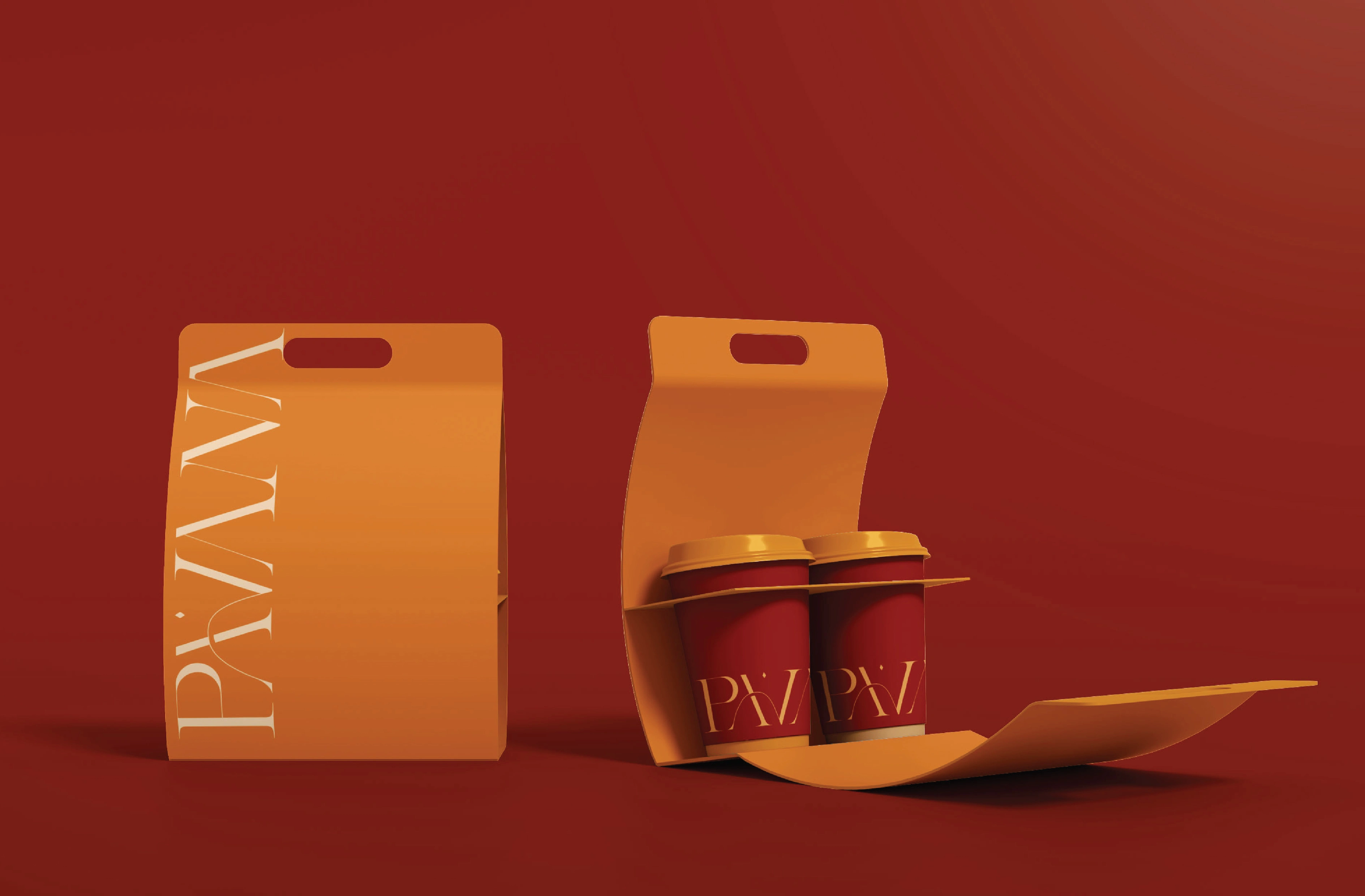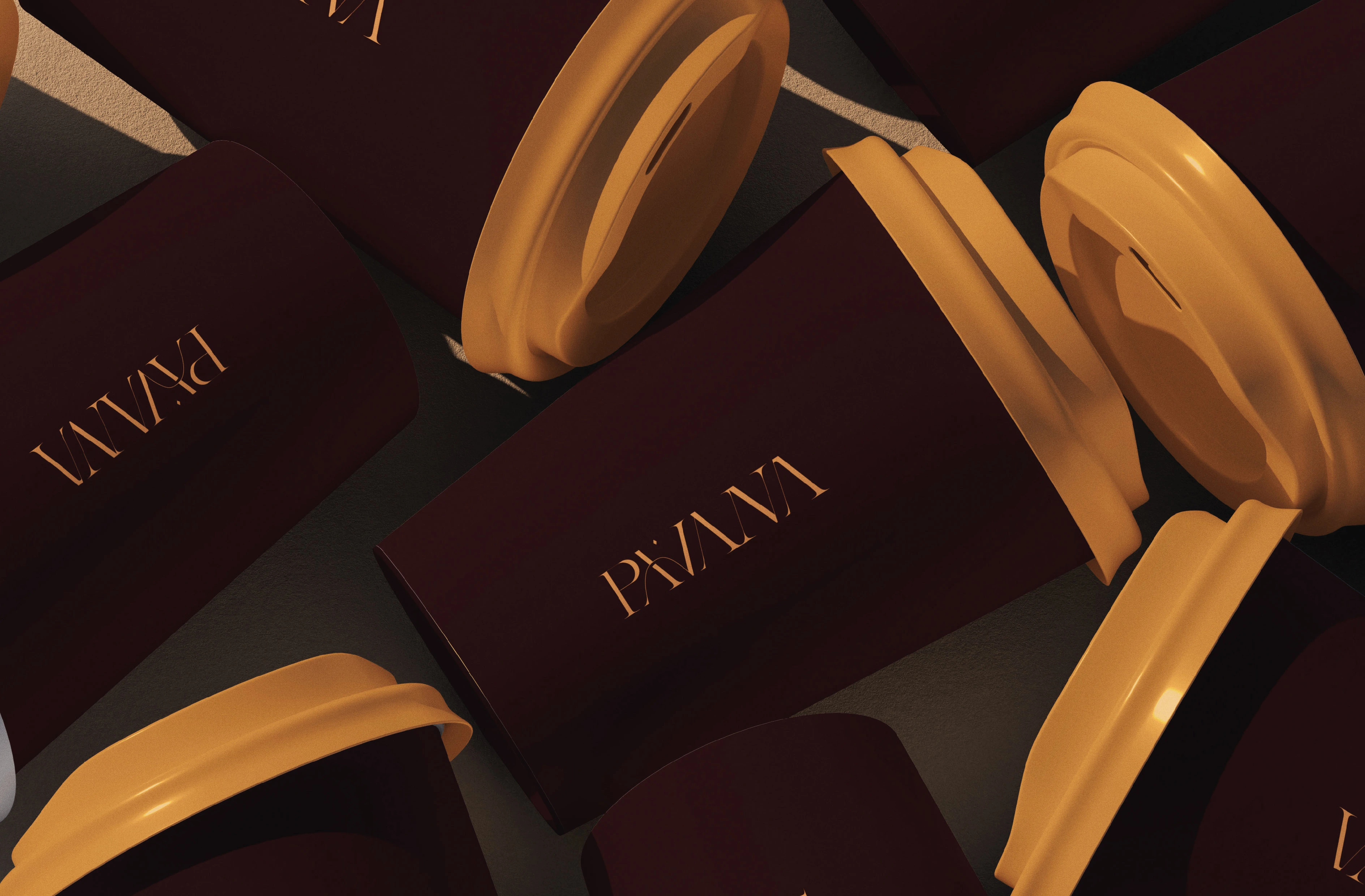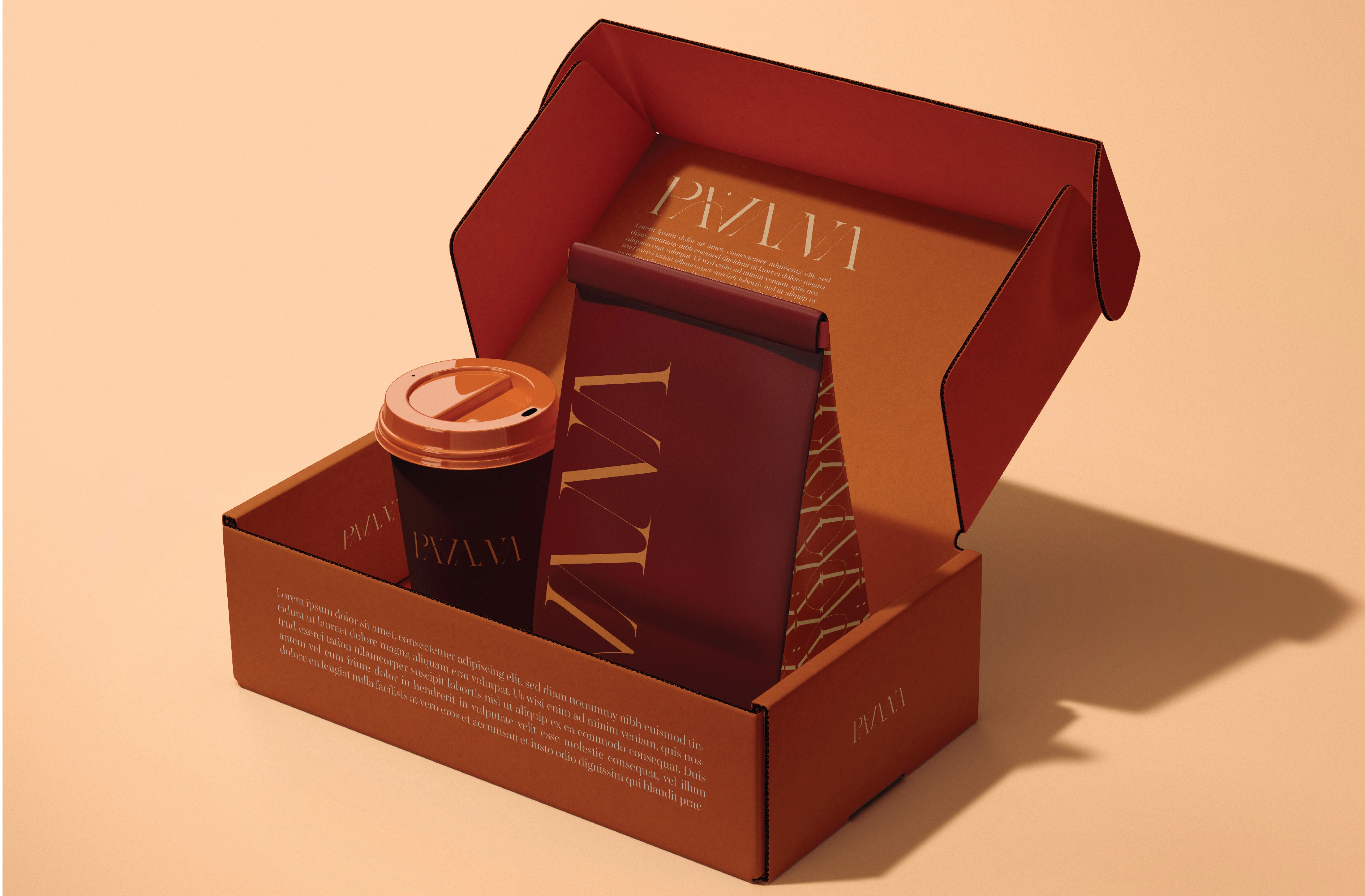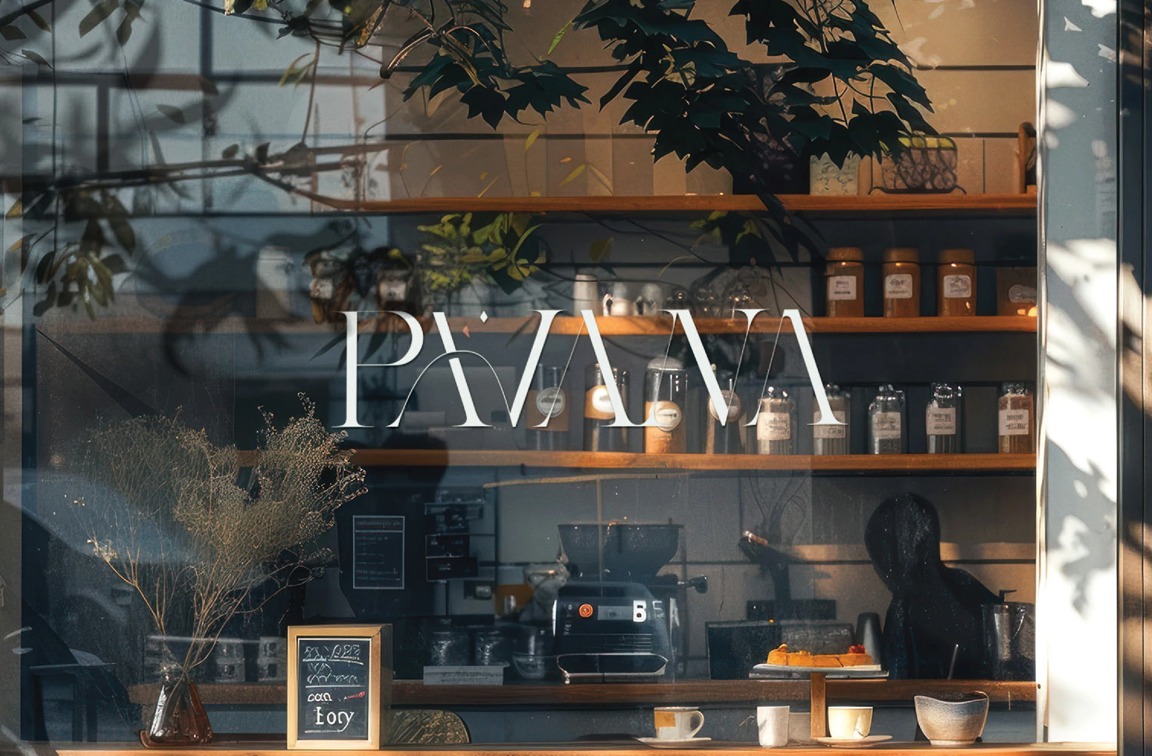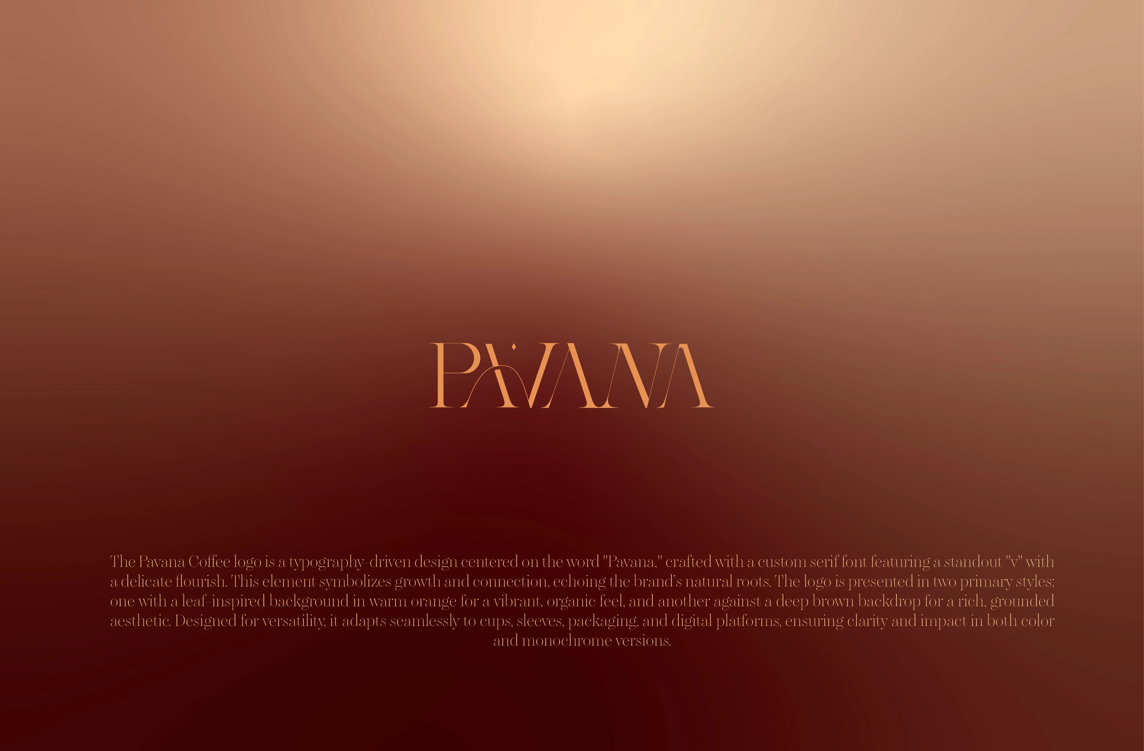 Pavana Coffee: earthy tones (soft cream, warm orange, deep brown) with a unique "v" logo. Designed for cups and social media, reflecting sustainability.