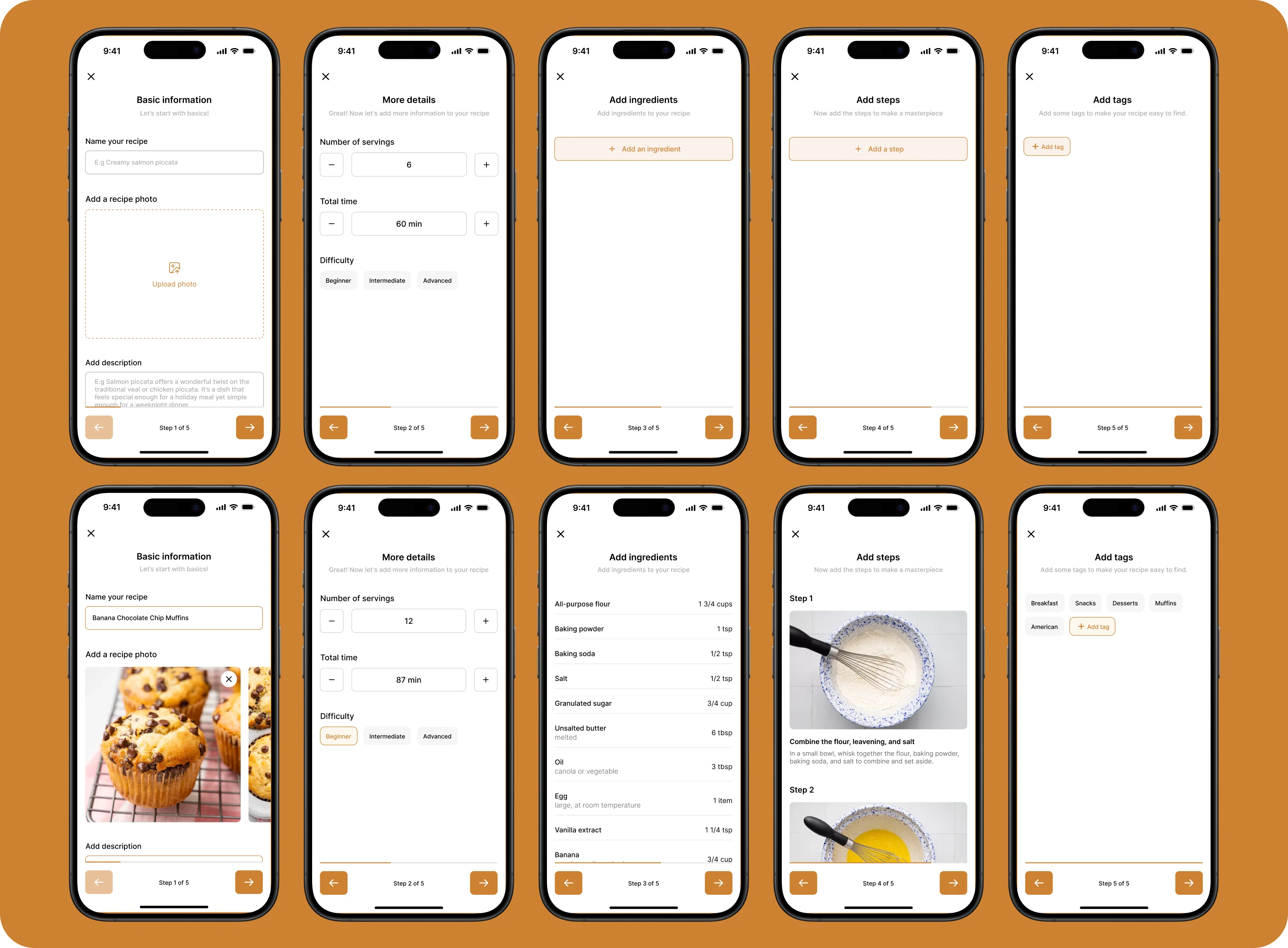 Users can create and share their own recipes using an intuitive recipe creation process. This allows users to add name of recipe, description, photos and videos, total time, ingredients, steps and tags.