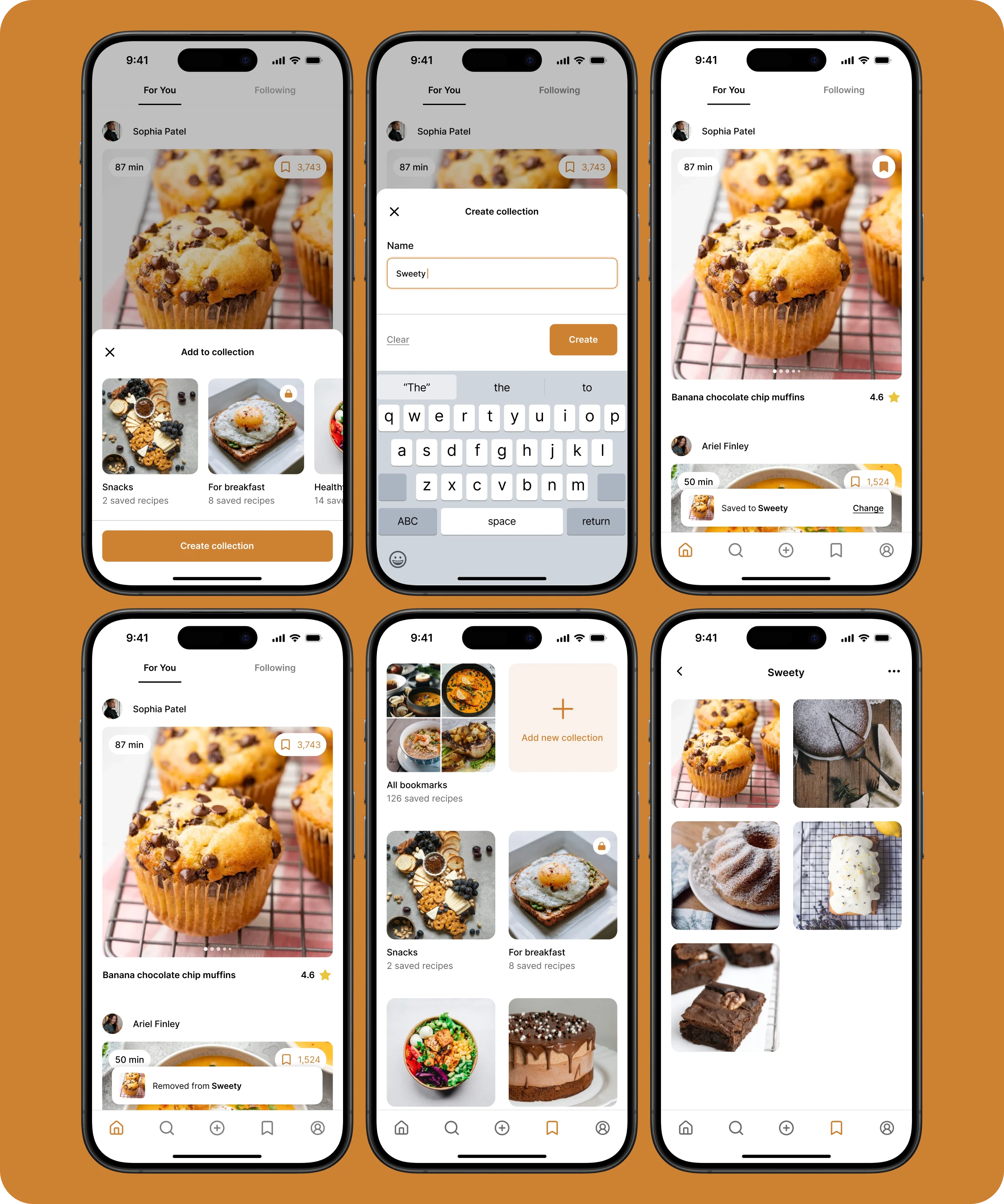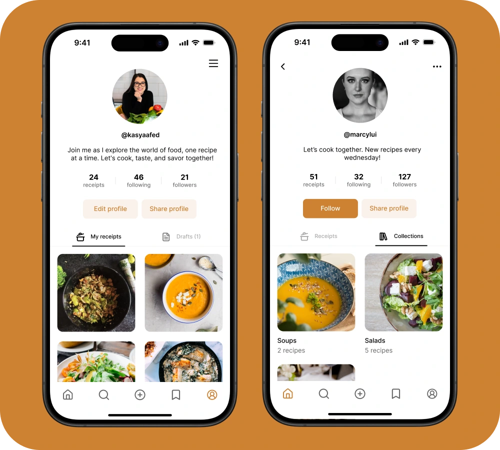 The Profile screen contains all necessary information about user activity: recipes created and collections. Users can also follow profiles they like to avoid missing useful content.