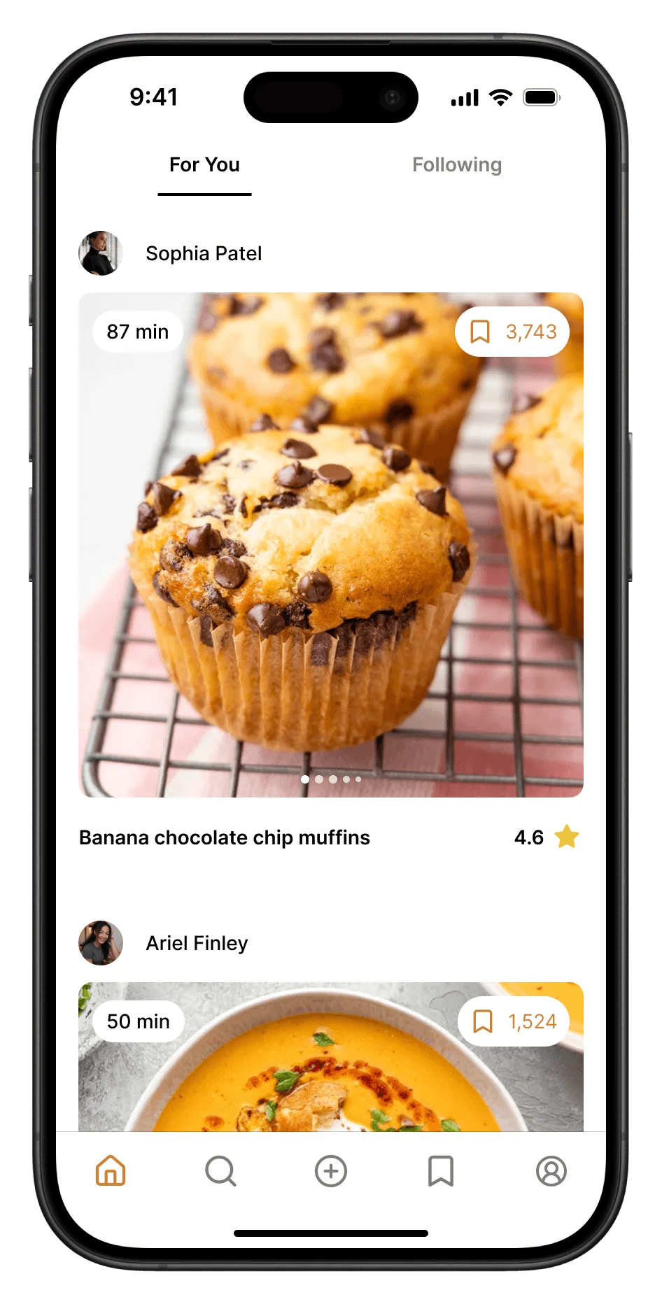 The feed is divided into two categories: recommendations for you and following. This allows users to explore recipes based on their preferences and view recipes from people they follow.