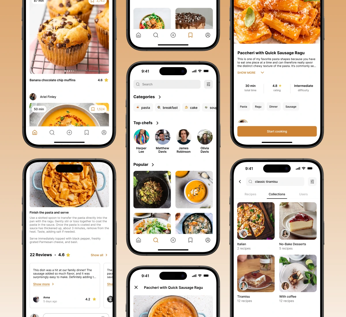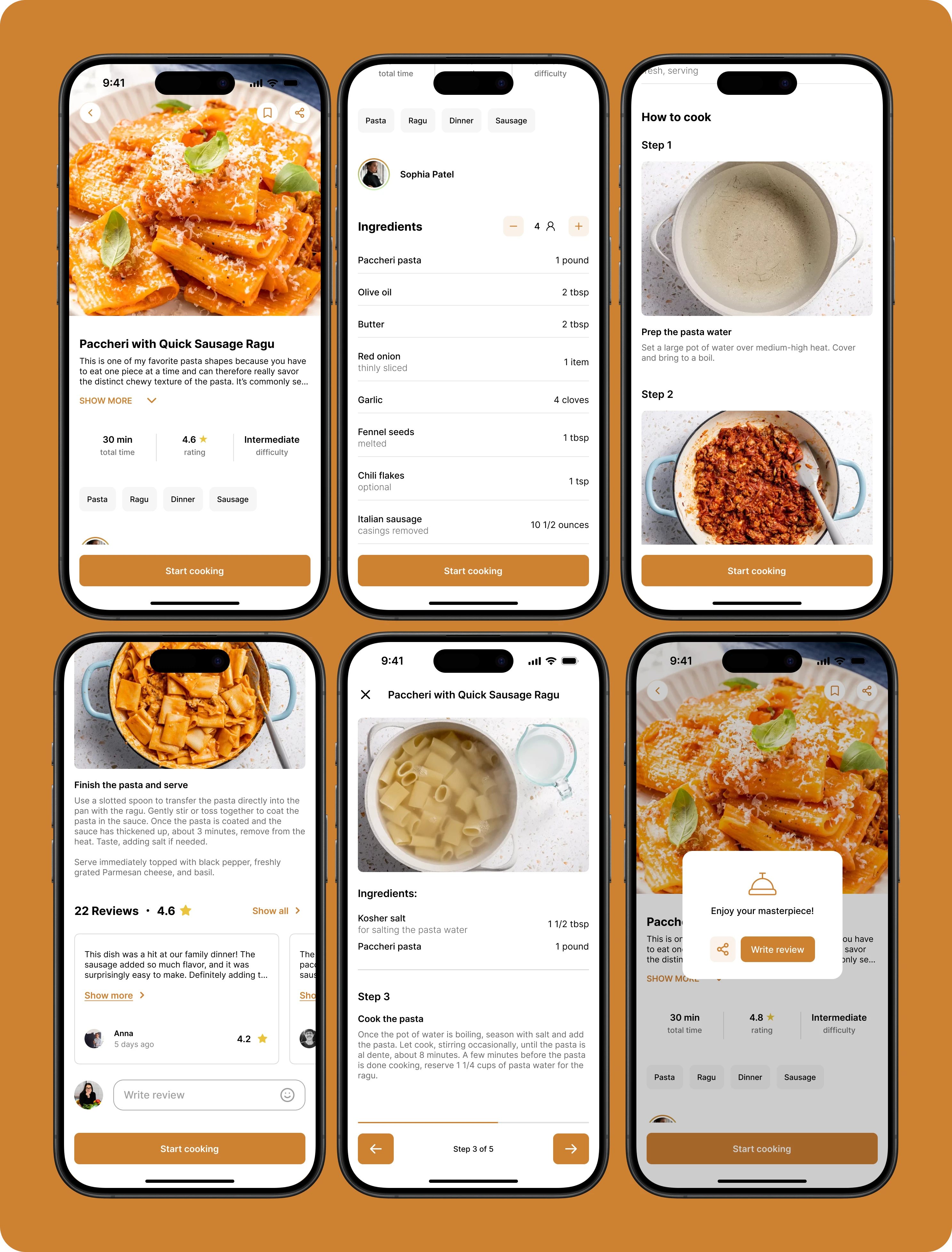 The recipe page contains all the necessary details for users to cook: photo, description, cooking time, portion calculator, detailed description of each step and photos, and also page has reviews from other users. In addition to this cooking becomes convenient with step-by-step instructions.