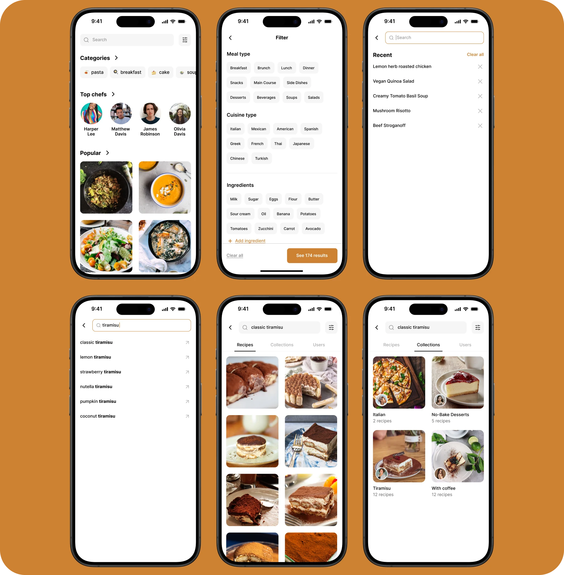 The Search tab allows the user to quickly find the recipe they need using search and filters. Even if the user is not looking for something specific, there are categories, top chefs and popular recipes that may interest the user in cooking something.
