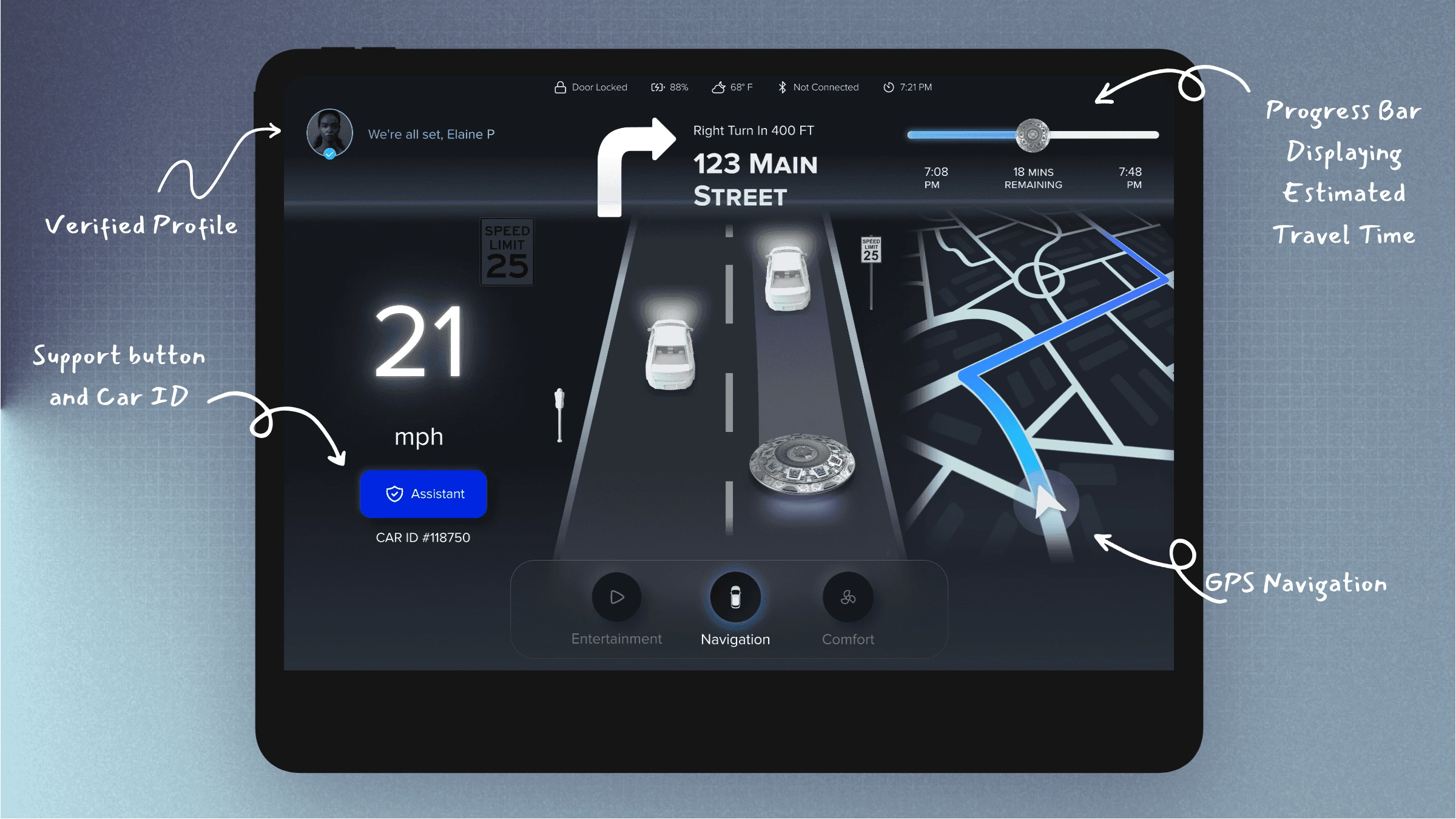 Passengers felt uneasy with cluttered dashboards and no safety feedback. I simplified navigation, enlarged indicators, and added live street-view tracking to build trust and comfort.