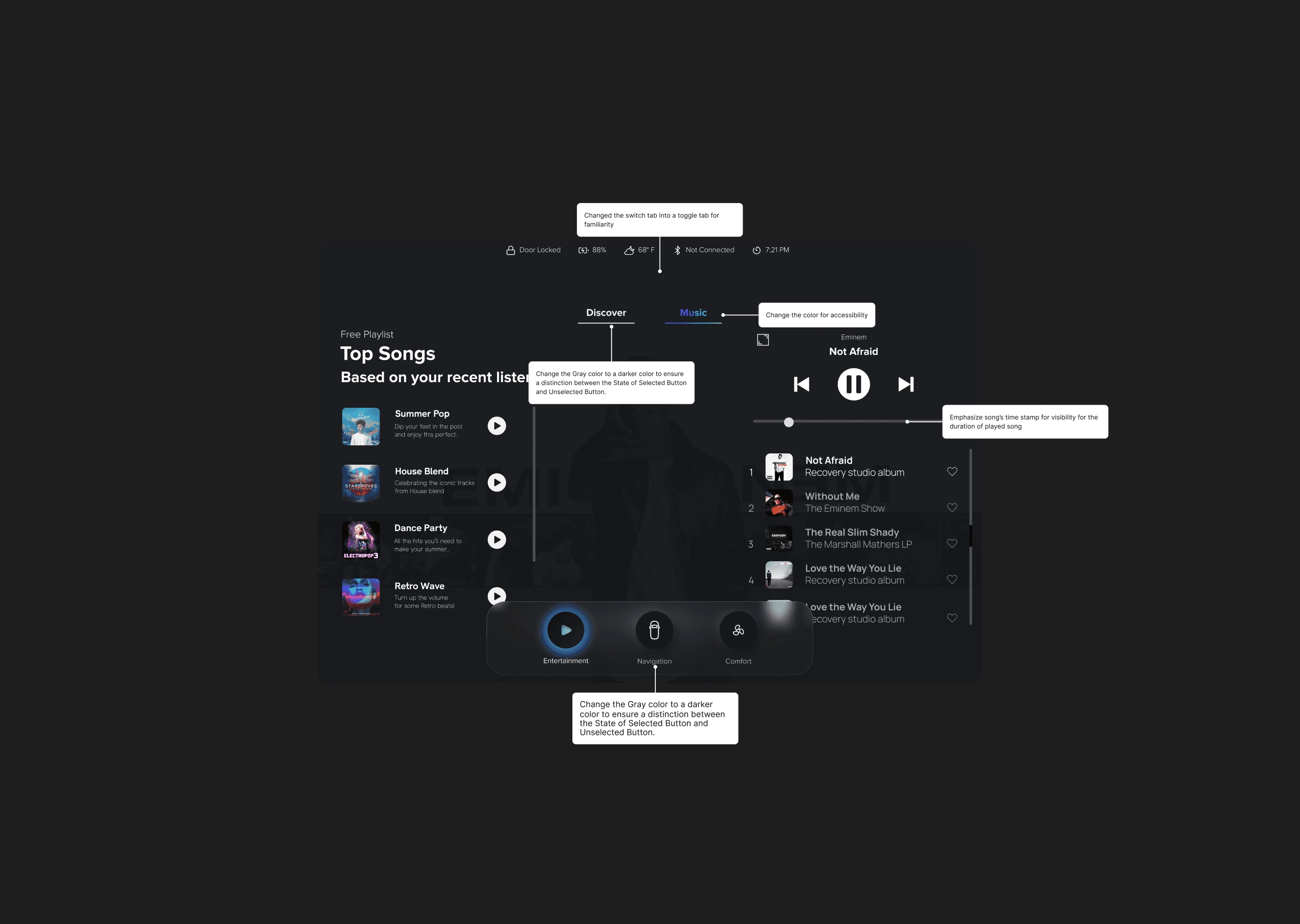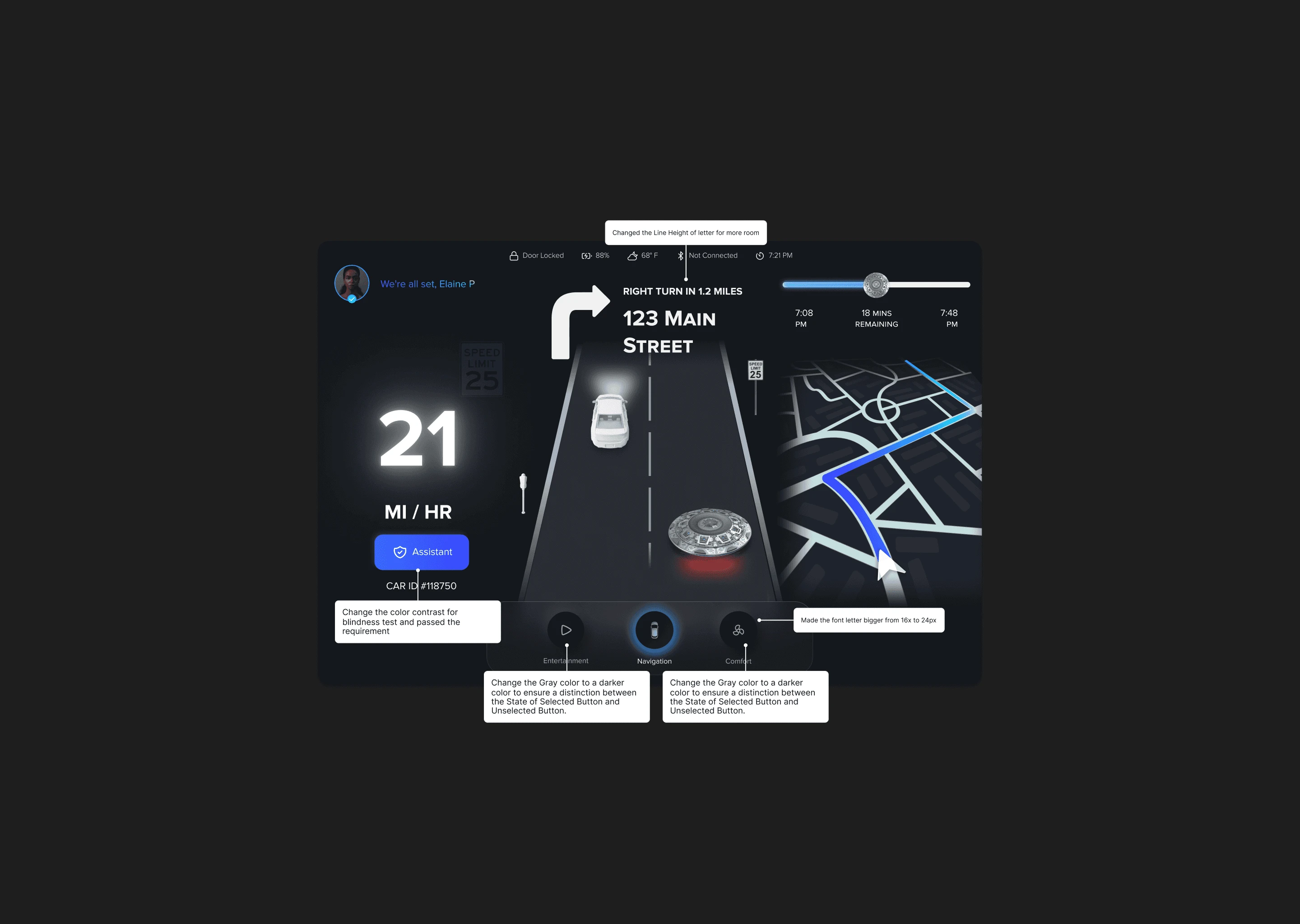 I refined hierarchy, improved color contrast, and polished components for clarity. Feedback led to a larger full-screen button, clearer labels, and a live navigation feed to reduce uncertainty and build trust.