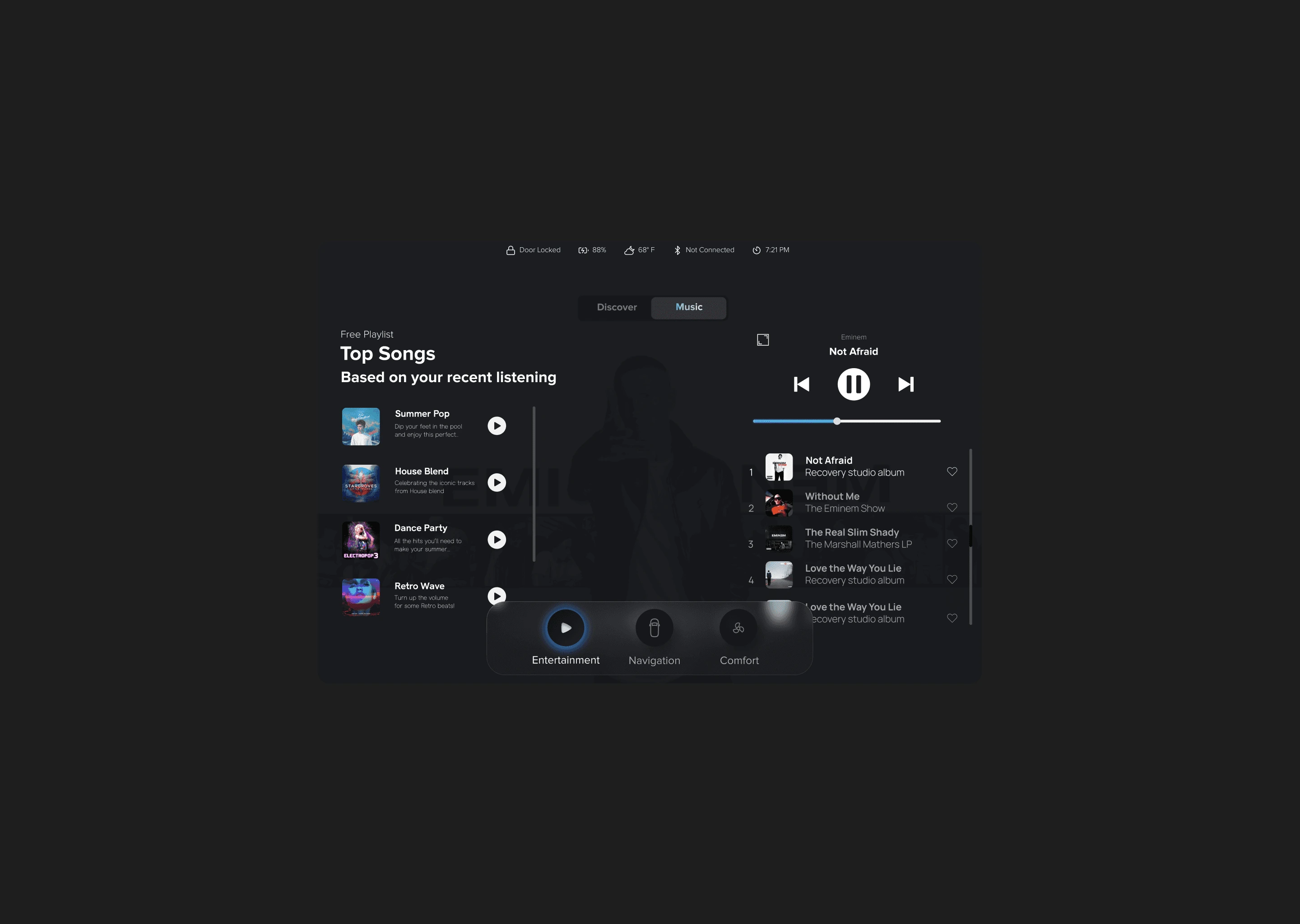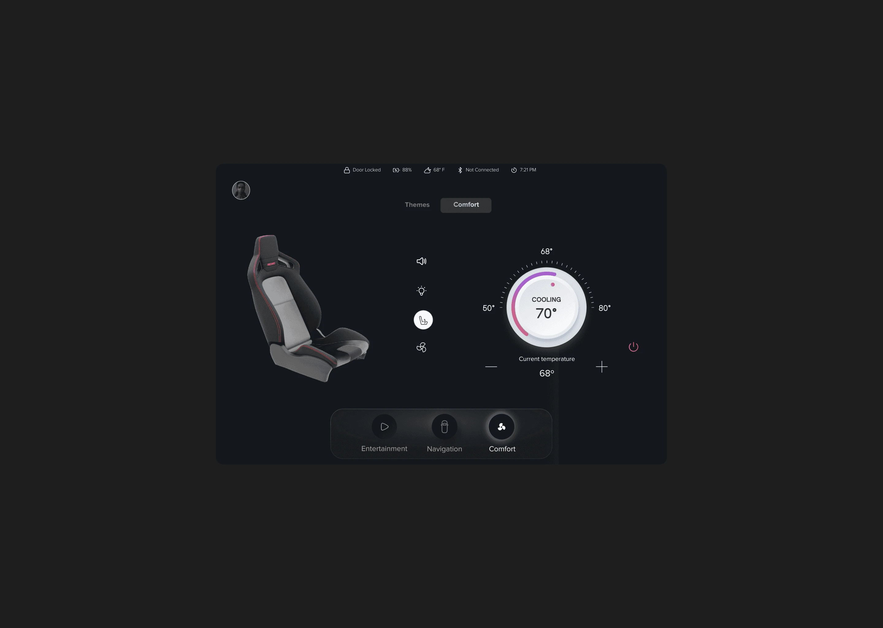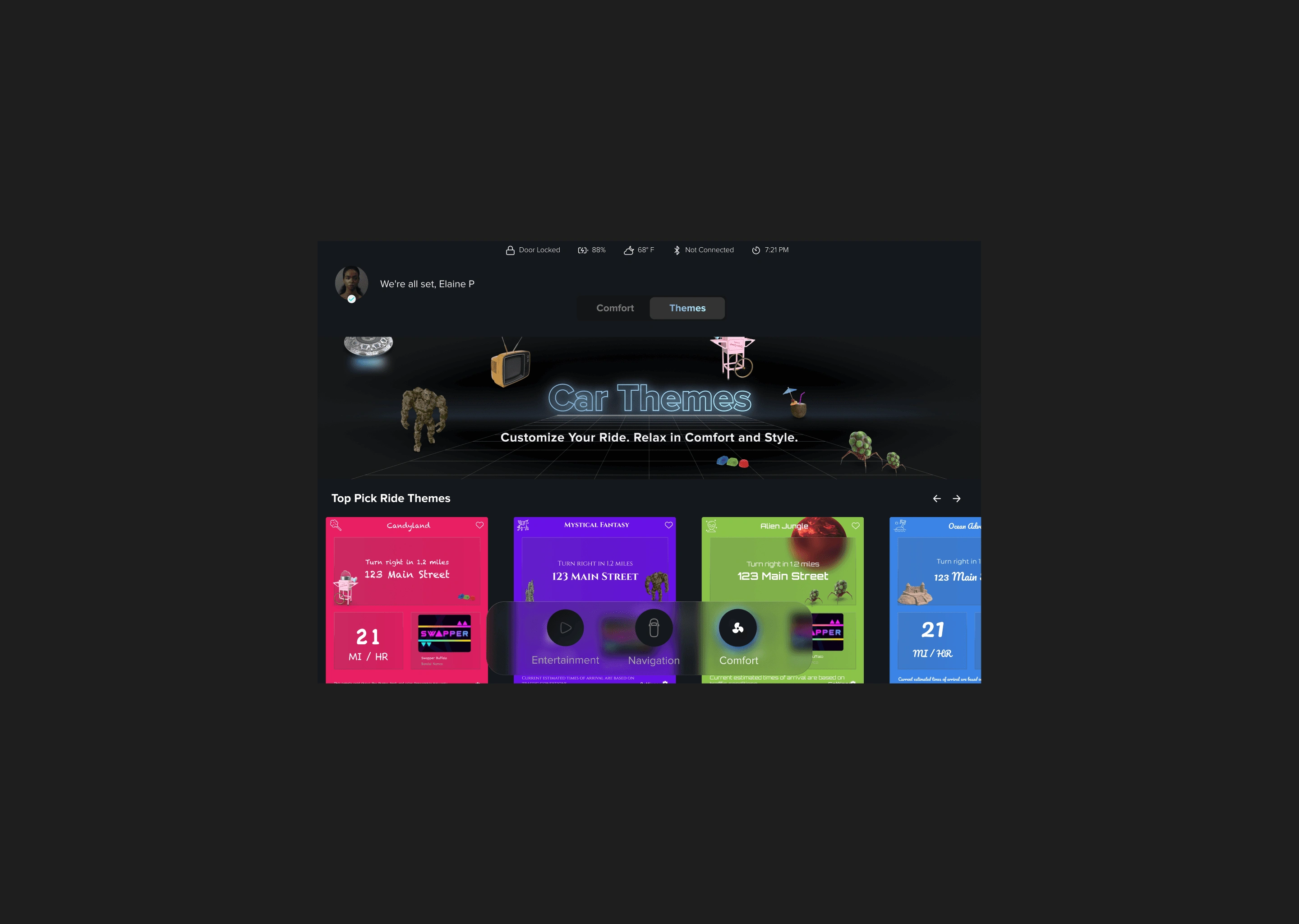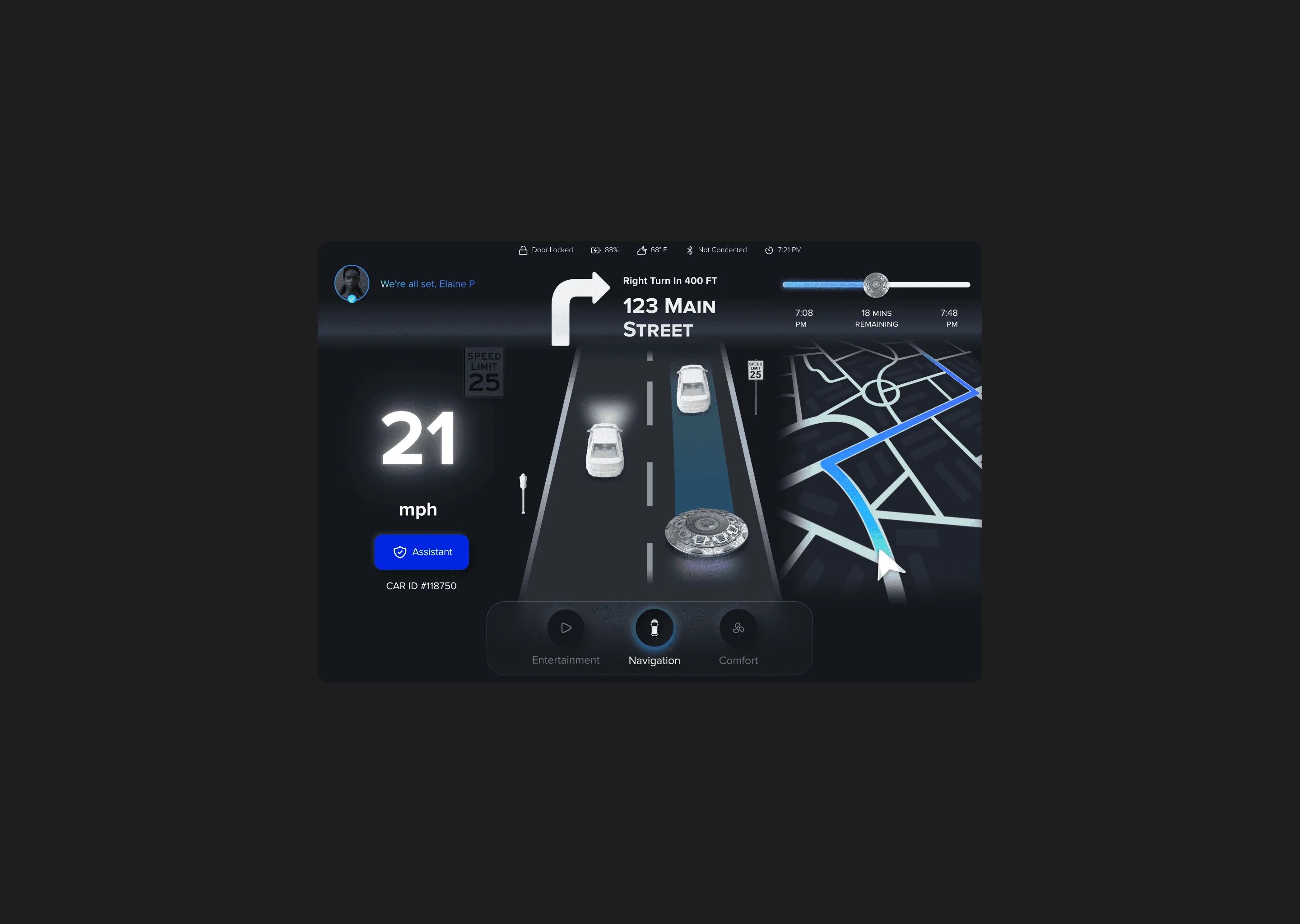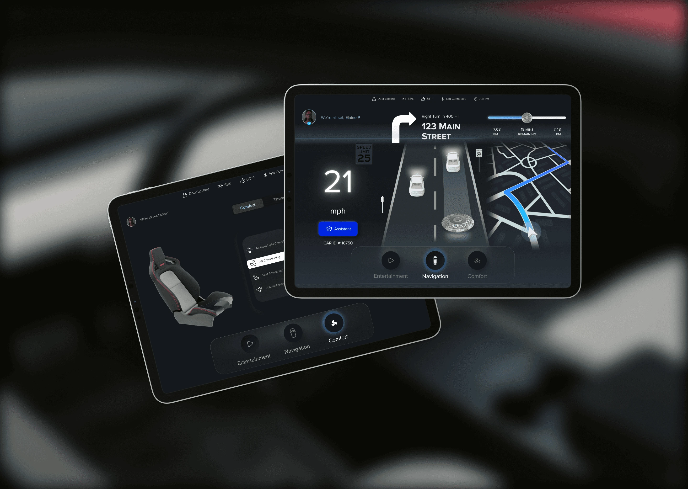 I designed a passenger-first UI that replaces noise with clarity. Look once and you know what the car is doing and what it will do next. Unambiguous autonomy states, guided ride steps, and safety cues keep attention light and trust high.
