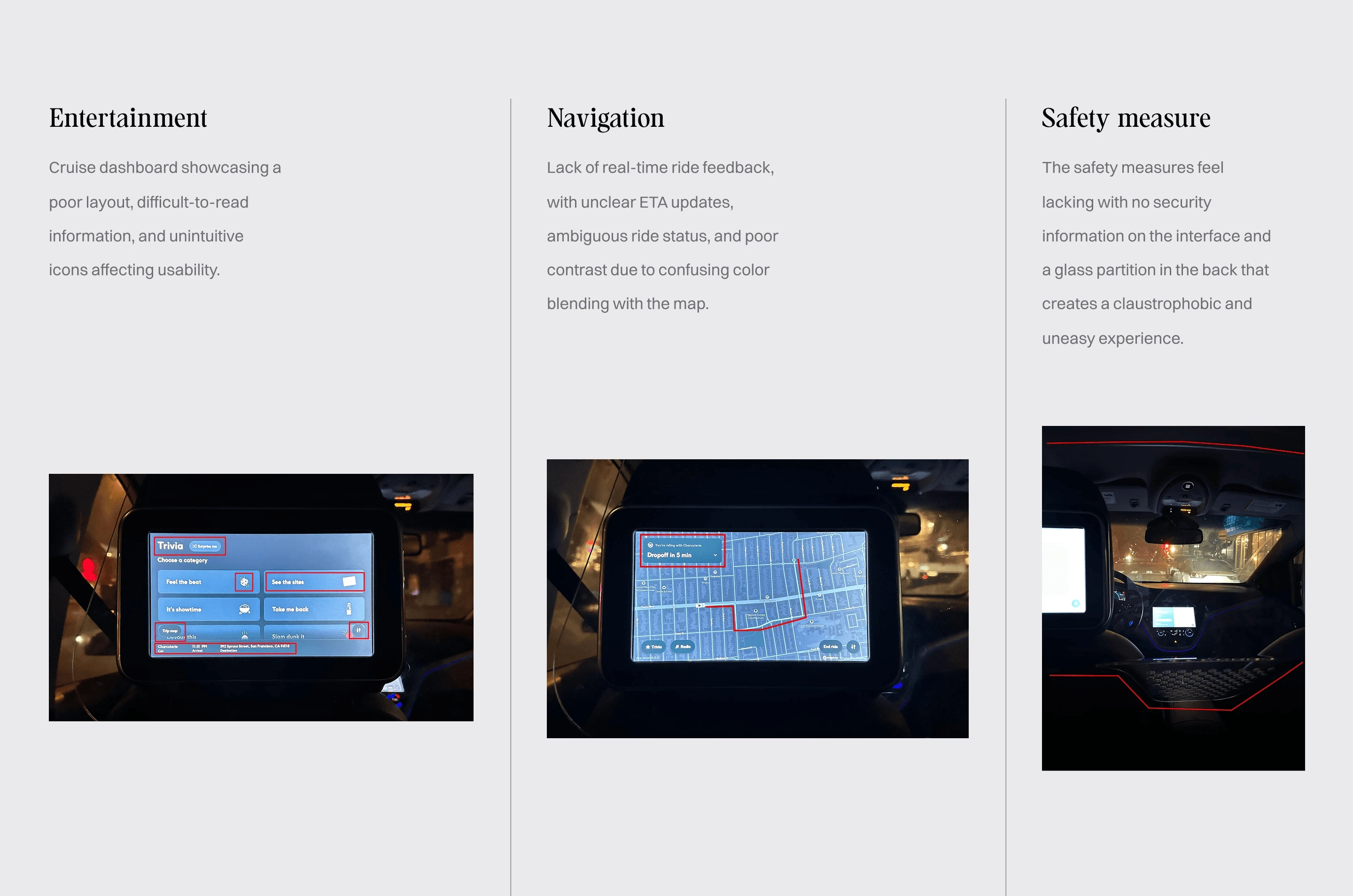 Passengers felt anxious in self-driving taxis due to cluttered dashboards, poor safety visibility, and limited feedback.