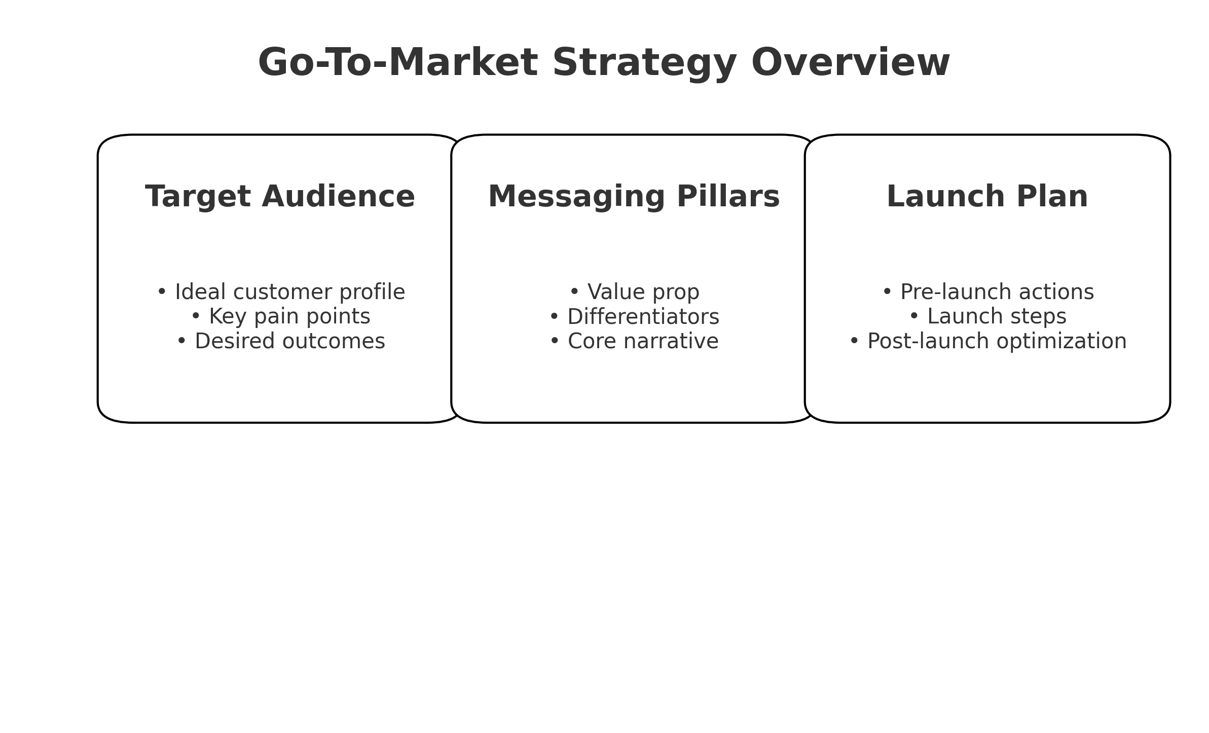A high-level GTM strategy showing target audience, messaging pillars, and launch steps to support a clear, aligned, and effective product rollout.