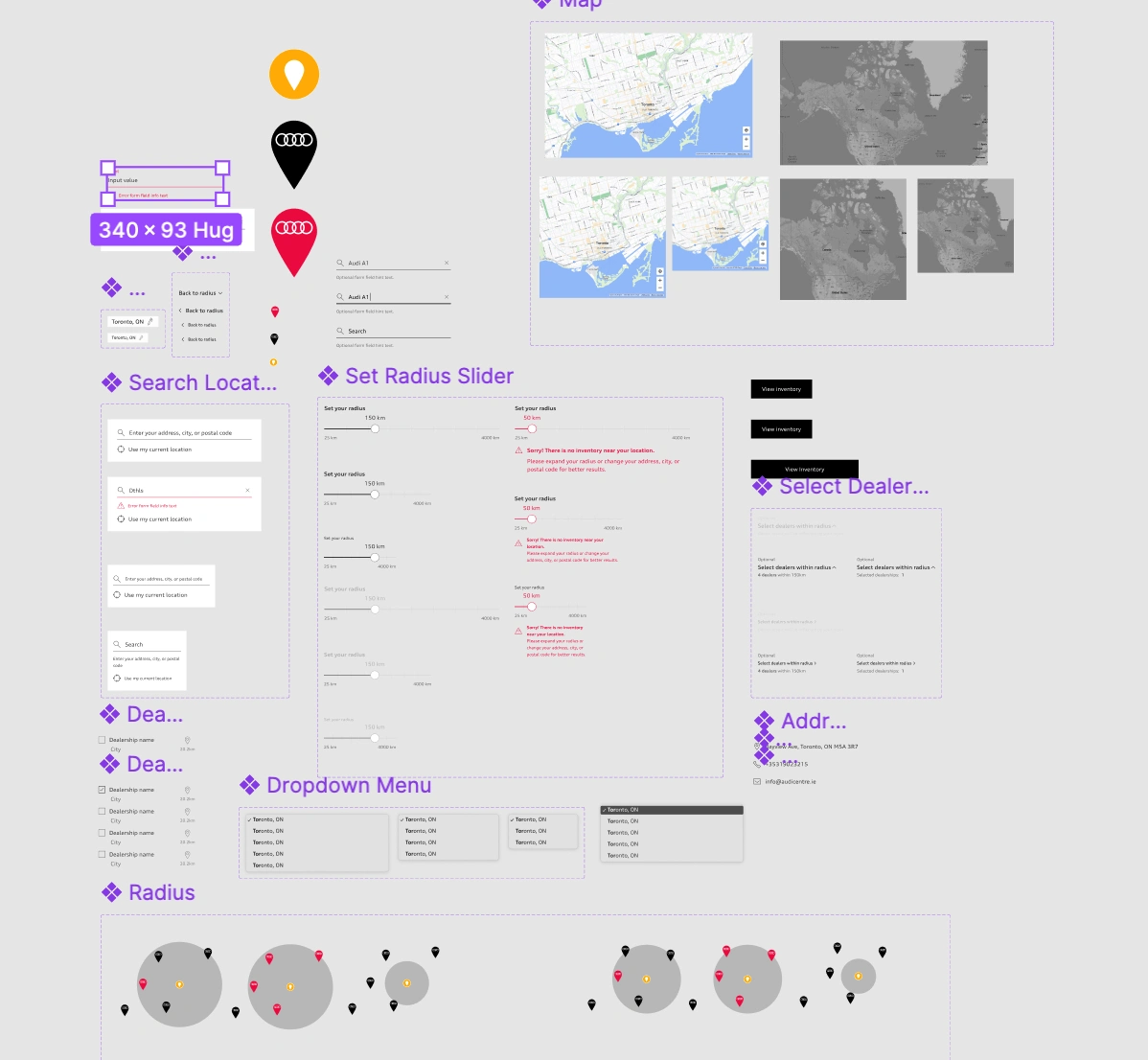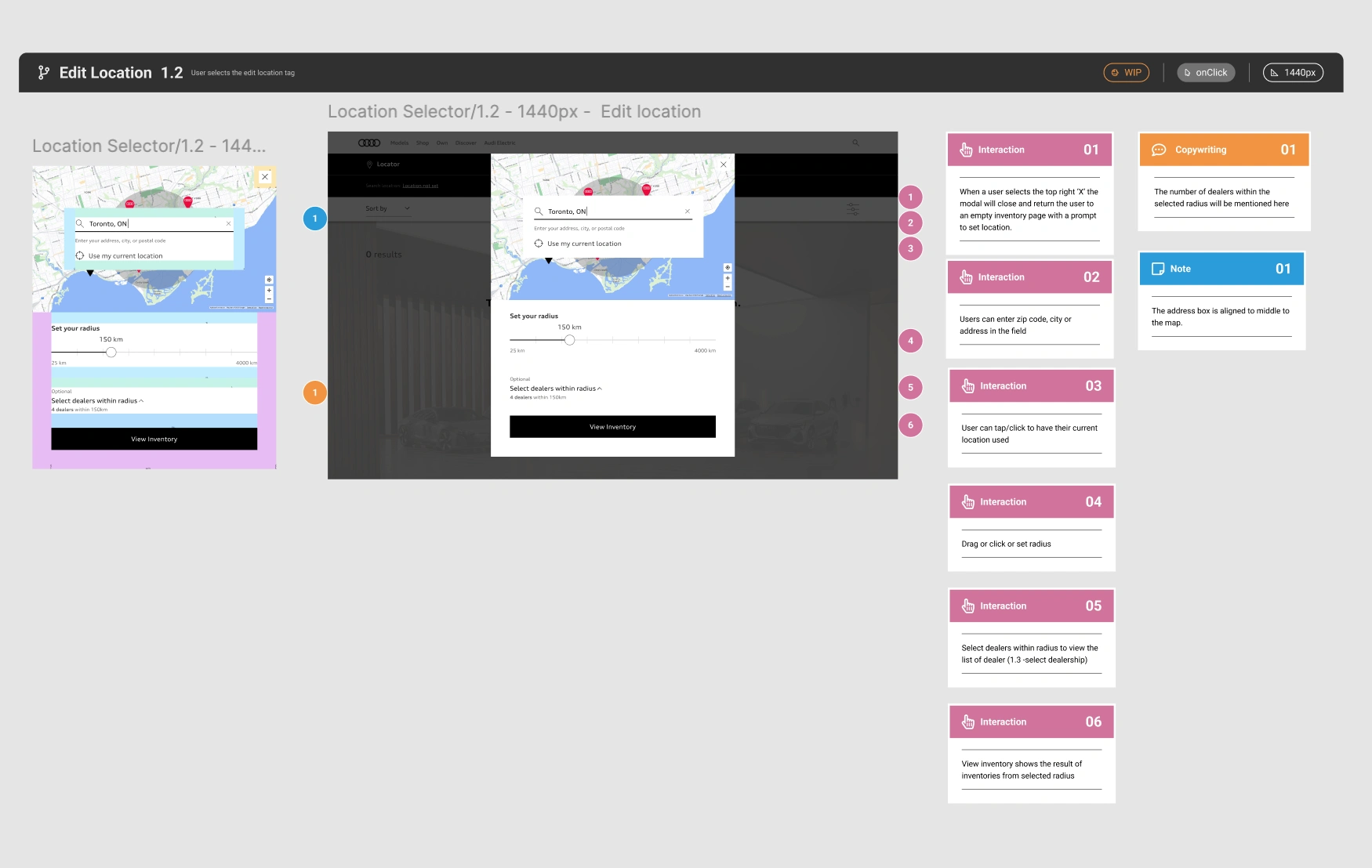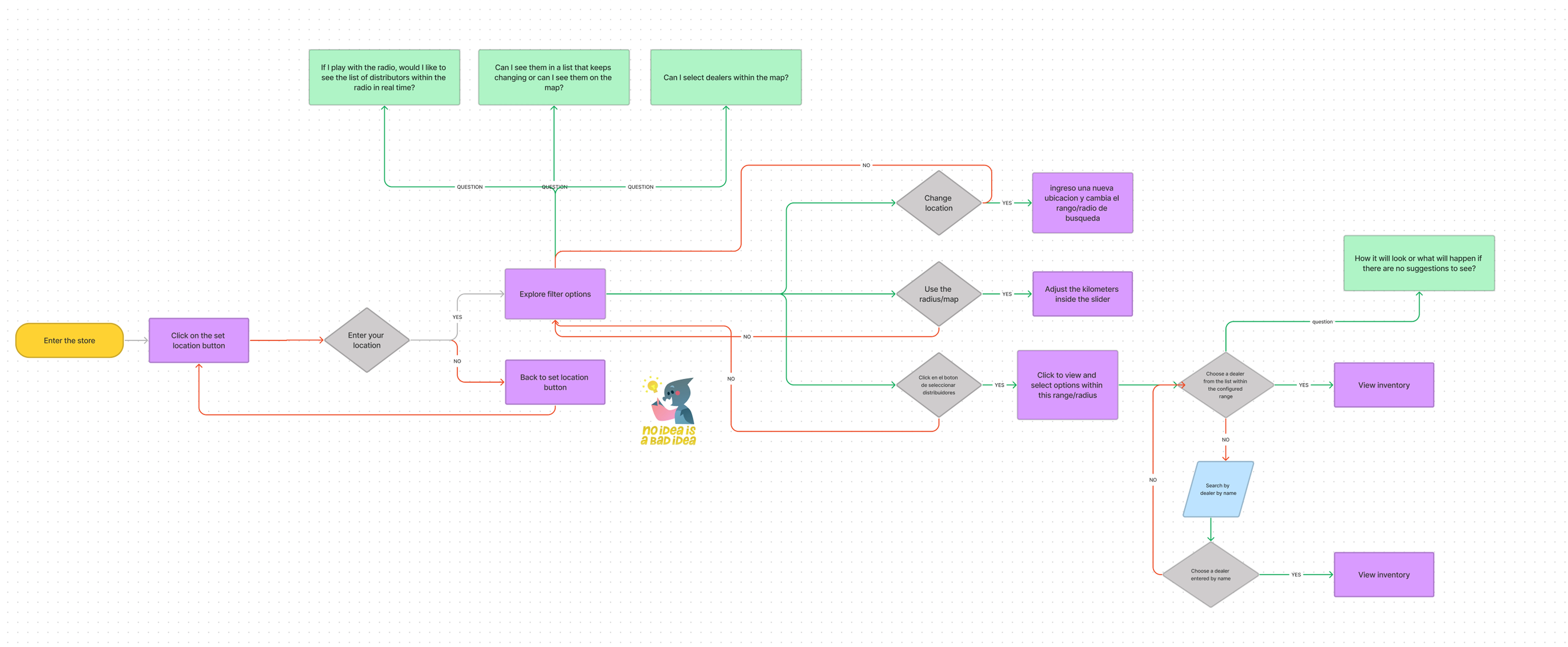 This user flow outlines the interaction journey for setting a location and selecting a dealer within an online store. It highlights key decision points, filtering mechanisms, and fallback options to ensure a seamless experience. The diagram also raises essential UX questions regarding real-time updates, selection methods, and edge cases, helping refine the logic and usability of the feature.