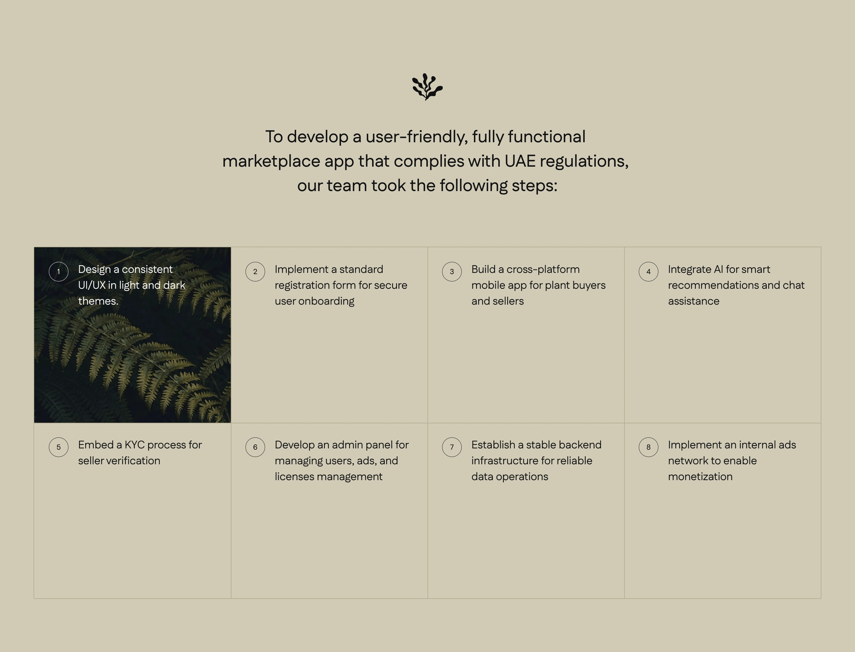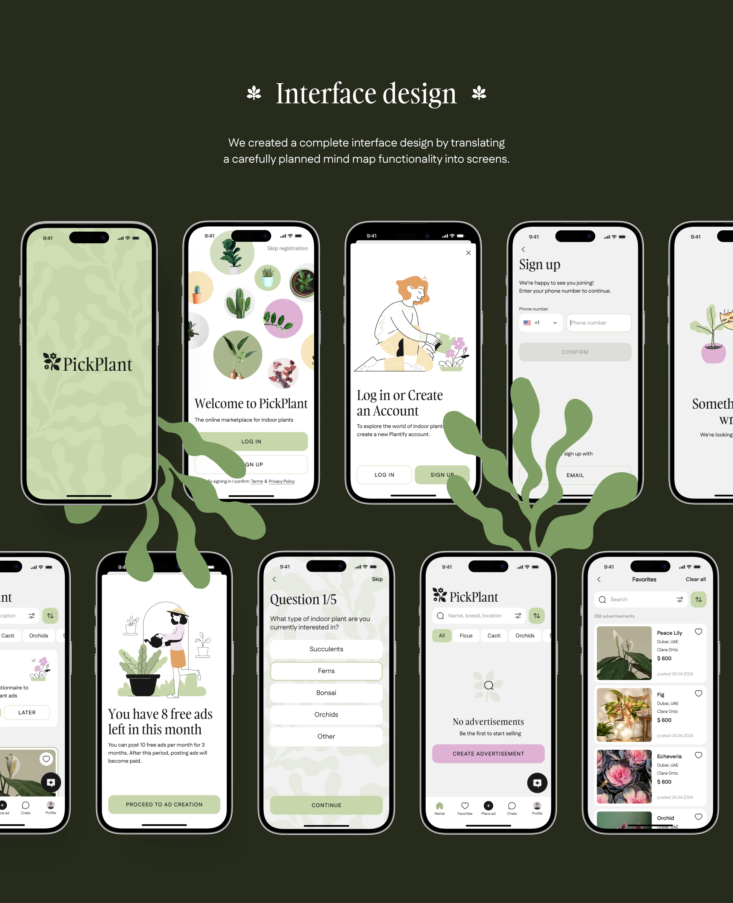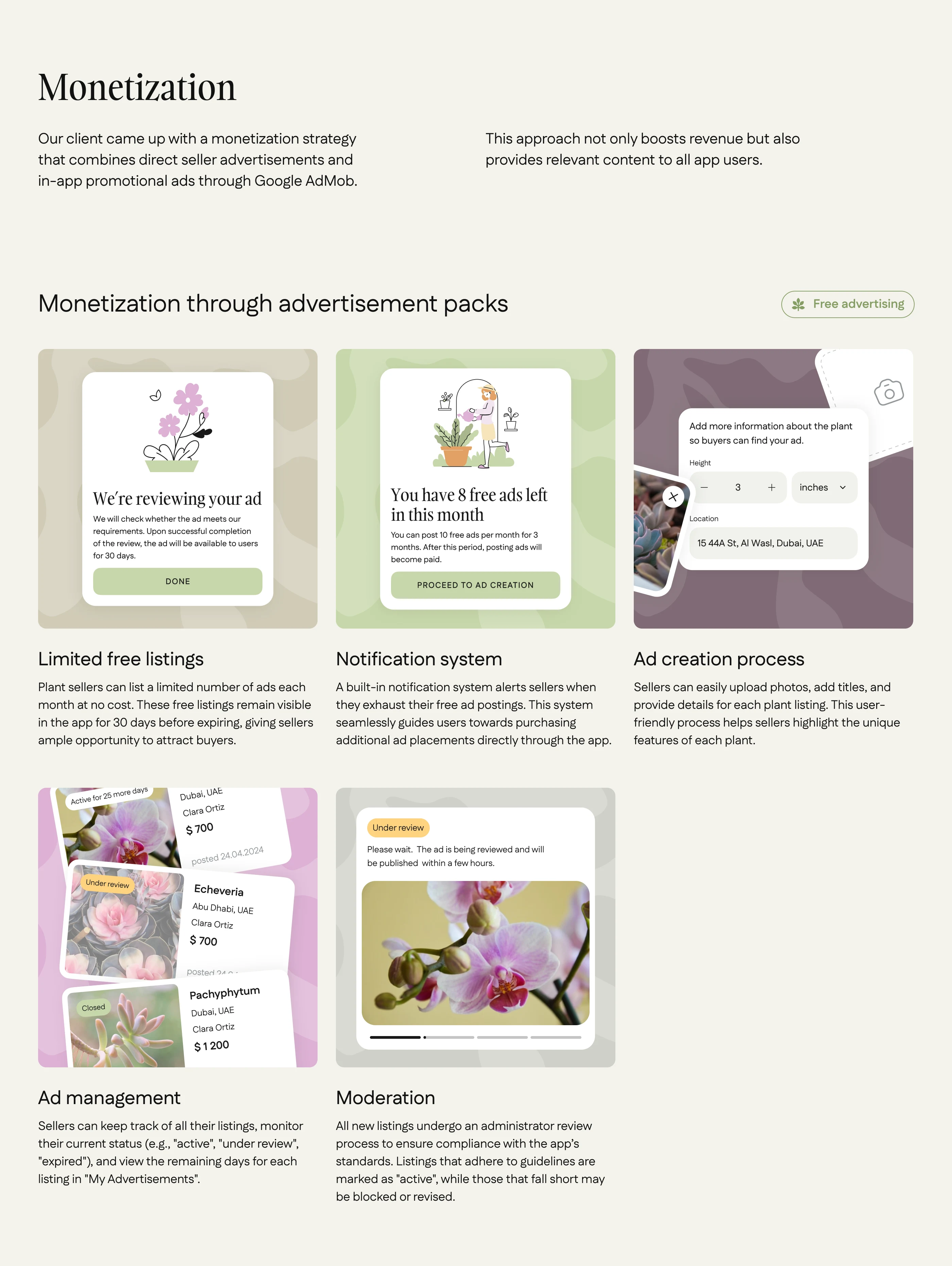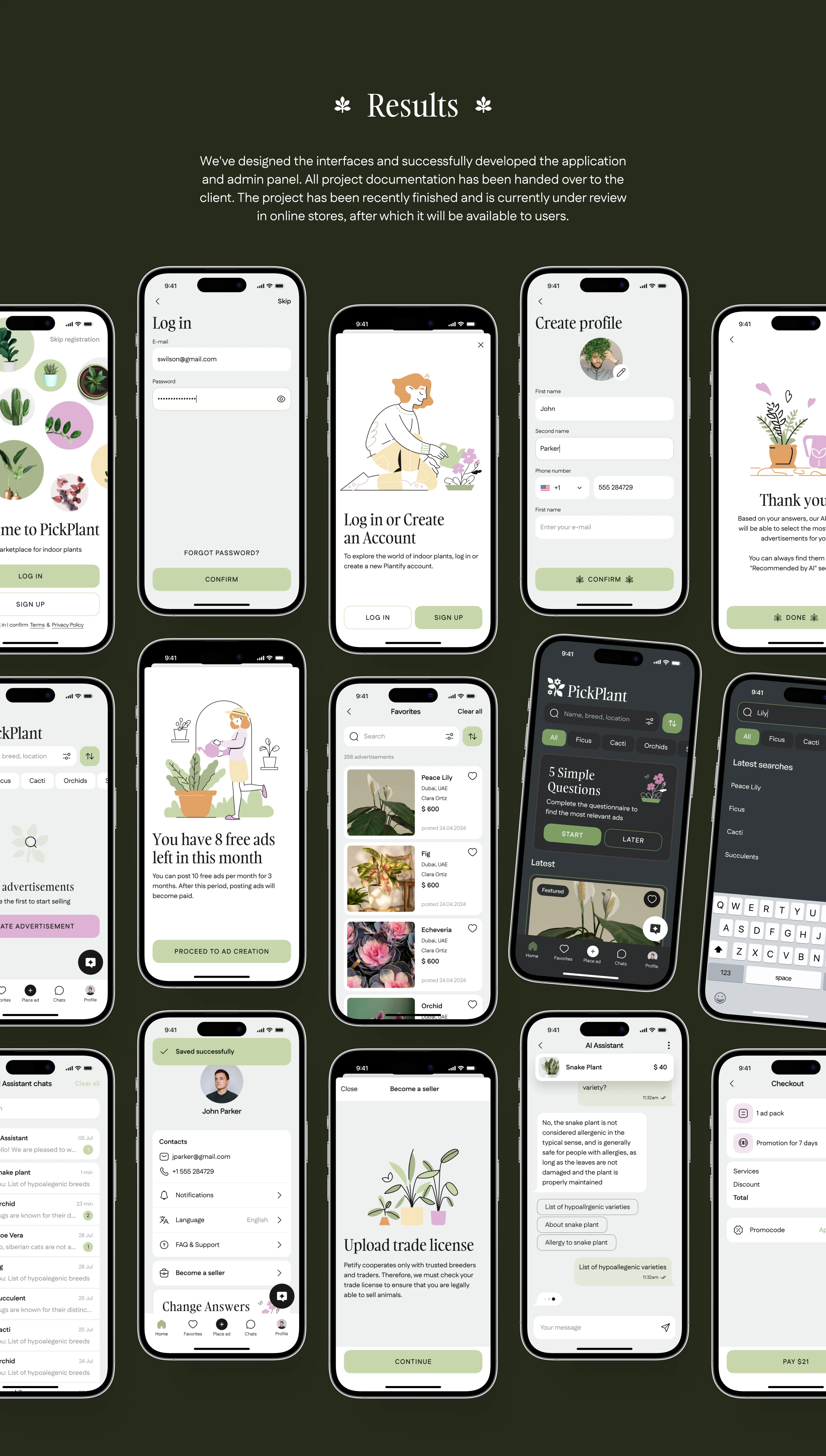 We created a marketplace app with AI-powered recommendations for the UAE indoor plants market. The solution features a cross-platform mobile app for buyers and sellers, intuitive UI/UX in light and dark modes, KYC verification, a built-in ads network, and a unique AI assistant for smart plant matching. An admin panel allows for smooth moderation, compliance with local laws, and easy management of users, ads, and trade licenses—all designed to support secure, efficient, and user-friendly online trading.