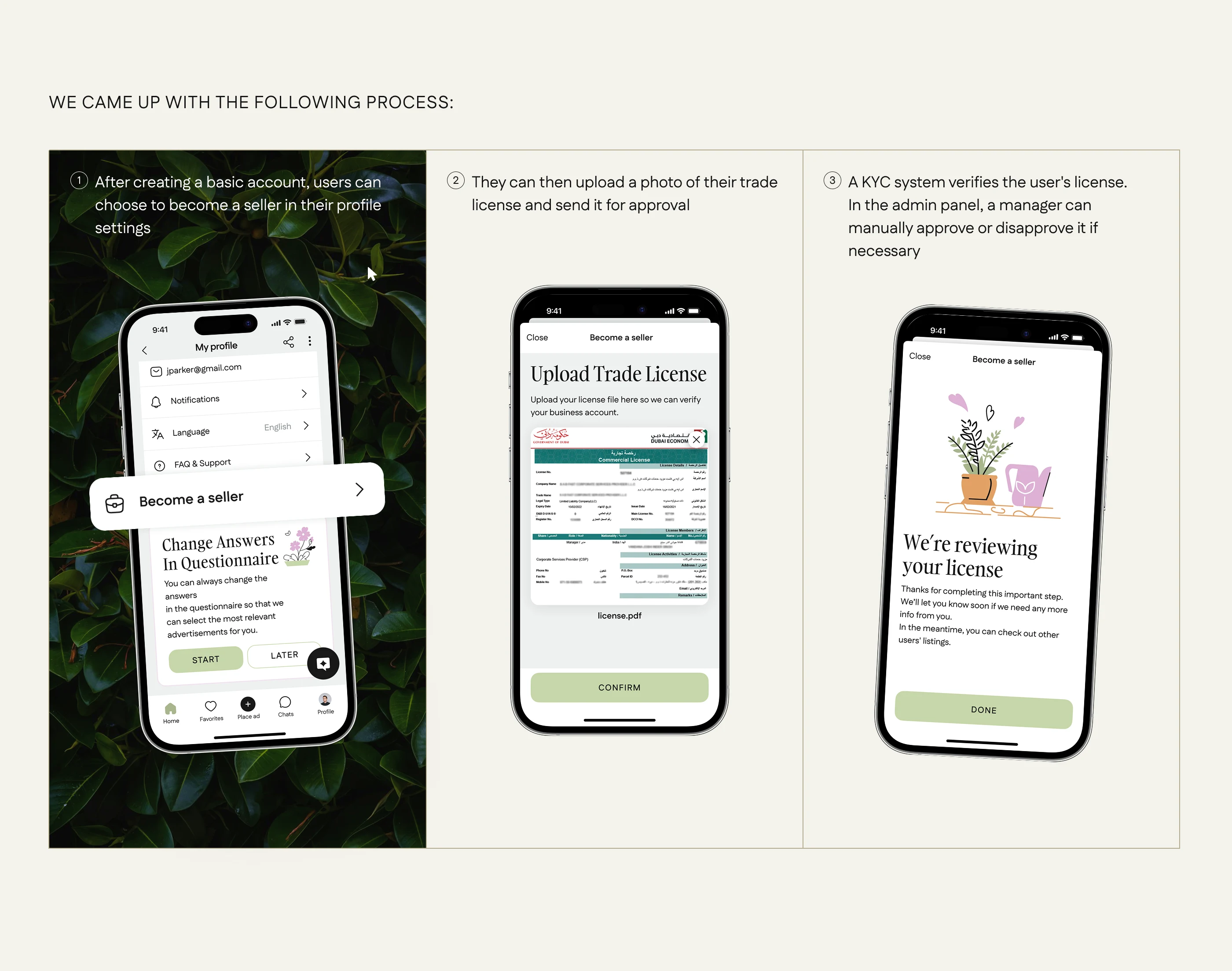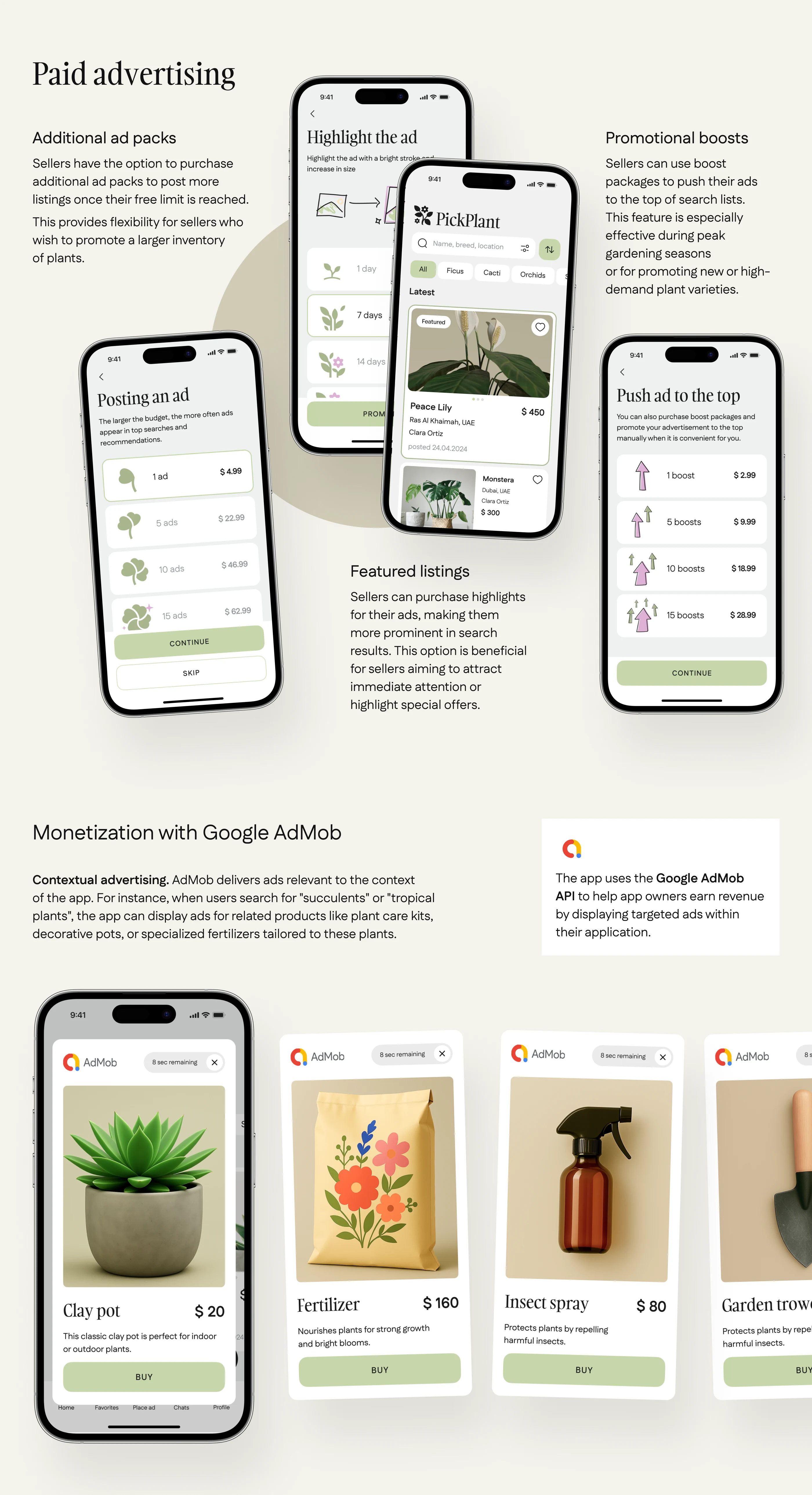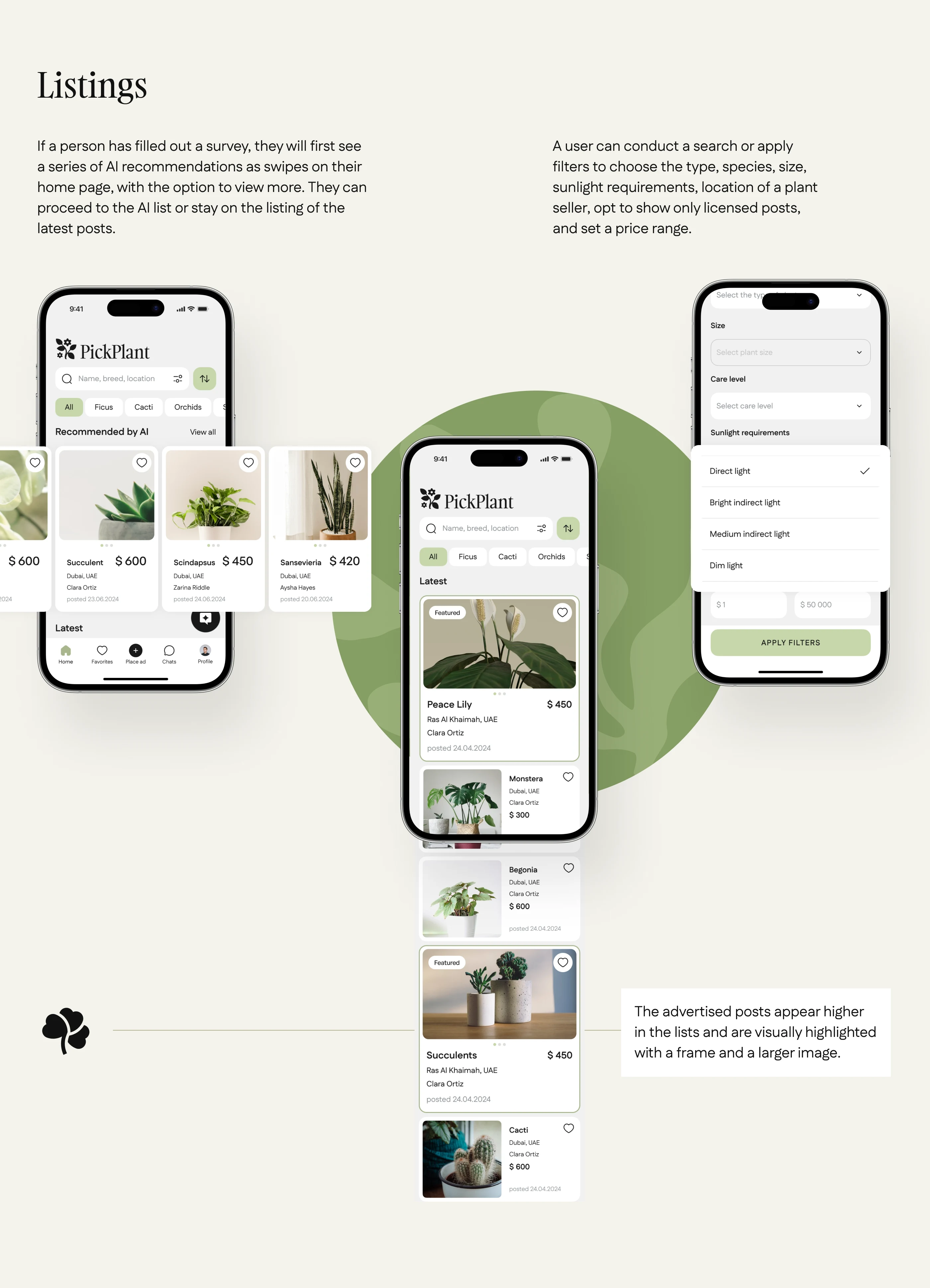 We created a marketplace app with AI-powered recommendations for the UAE indoor plants market. The solution features a cross-platform mobile app for buyers and sellers, intuitive UI/UX in light and dark modes, KYC verification, a built-in ads network, and a unique AI assistant for smart plant matching. An admin panel allows for smooth moderation, compliance with local laws, and easy management of users, ads, and trade licenses—all designed to support secure, efficient, and user-friendly online trading.