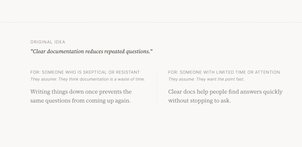 A brief walkthrough showing how a single idea is translated and compared across audiences.