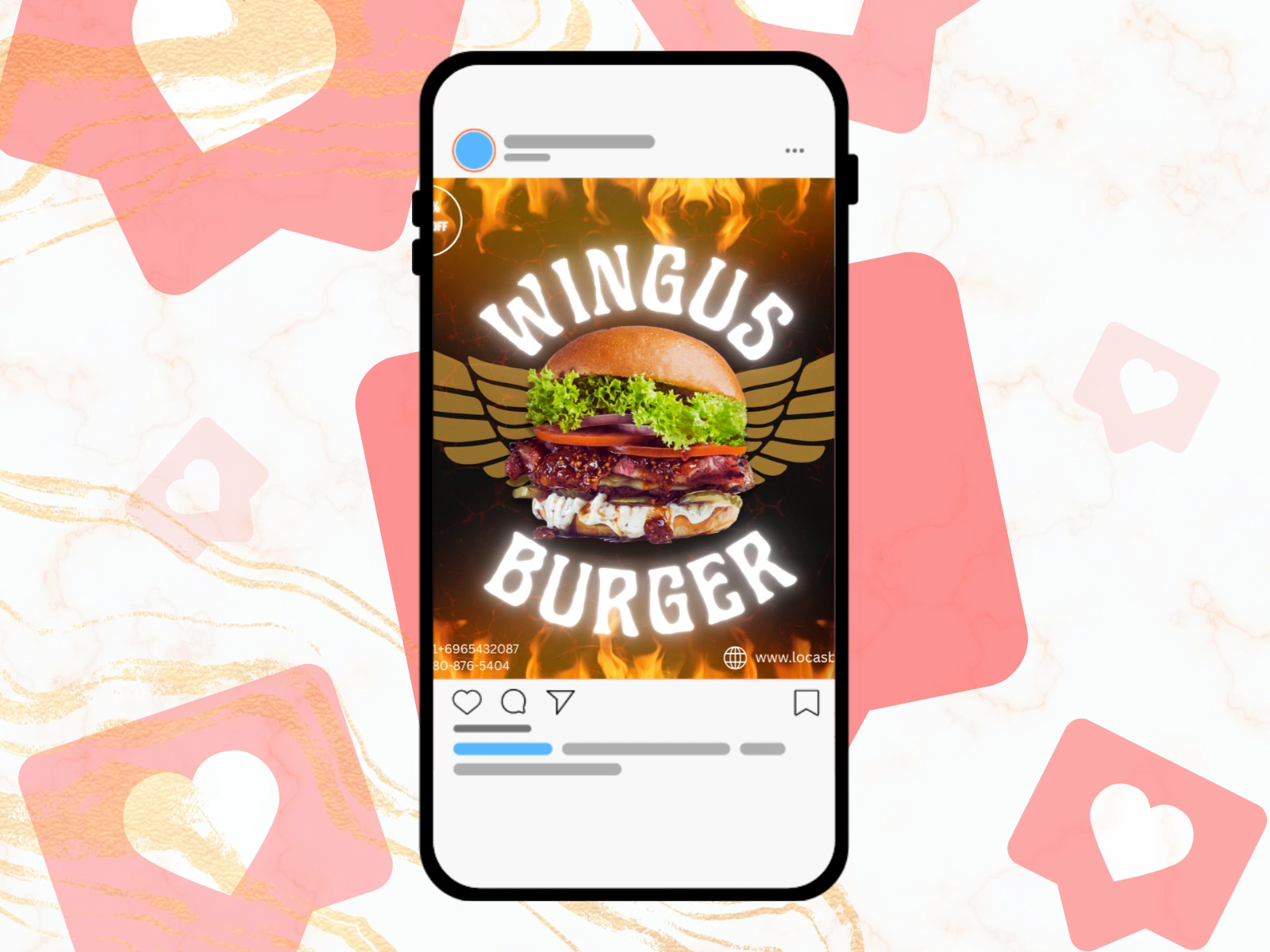 A visually striking burger advertisement designed to capture attention instantly. This personal sample project showcases my expertise in food photography editing, creative typography, and social media marketing design. Featuring a flame-inspired background, bold wing-themed graphics, and a tempting burger centerpiece, this creative blends mouthwatering visuals with a clear promotional message — "30% Off". Optimized for engagement across Instagram, Facebook, and digital ads, it highlights my skills in brand storytelling, SEO-friendly content creation, and conversion-driven design.