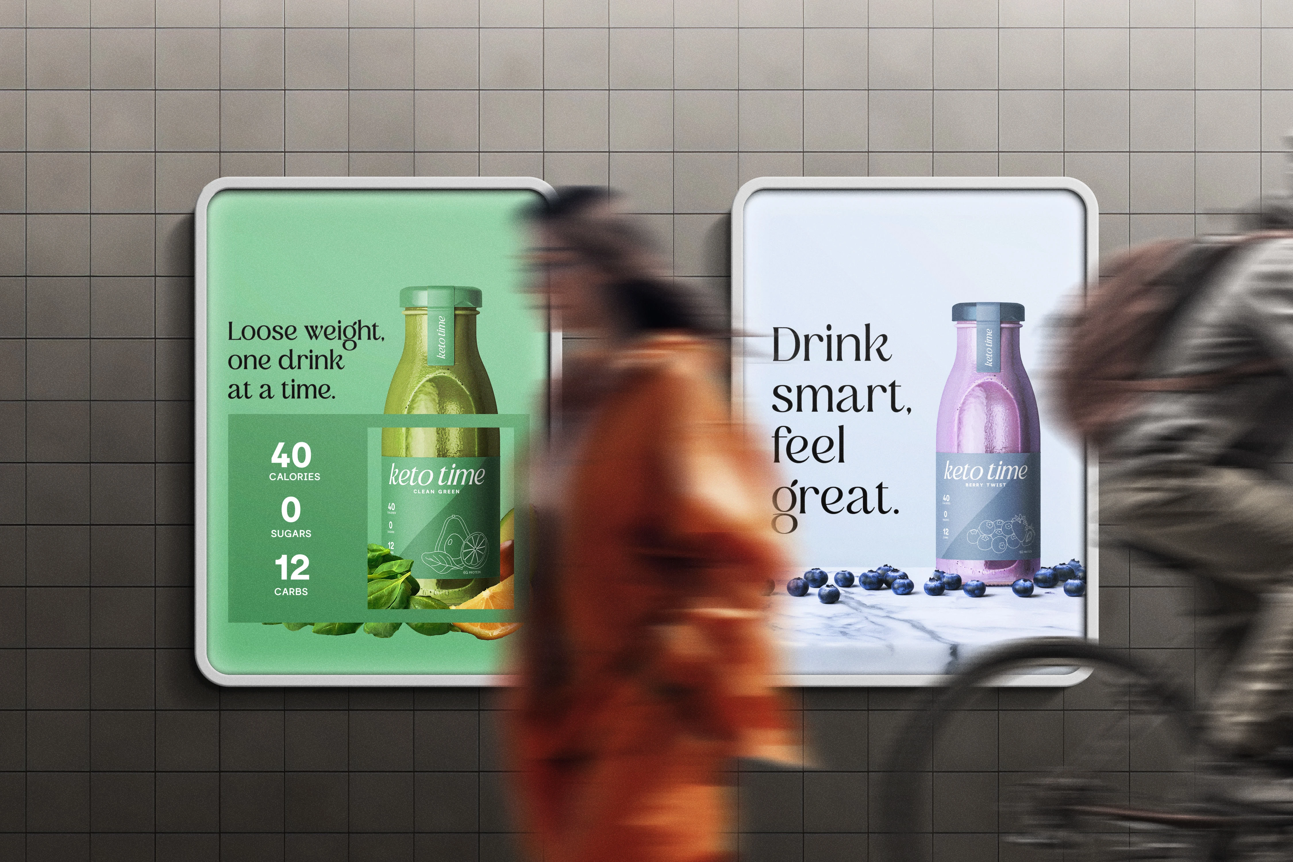 Keto Time is a premium keto-focused beverage and snack brand designed to stand apart from the typical bold, aggressive aesthetic in the category.