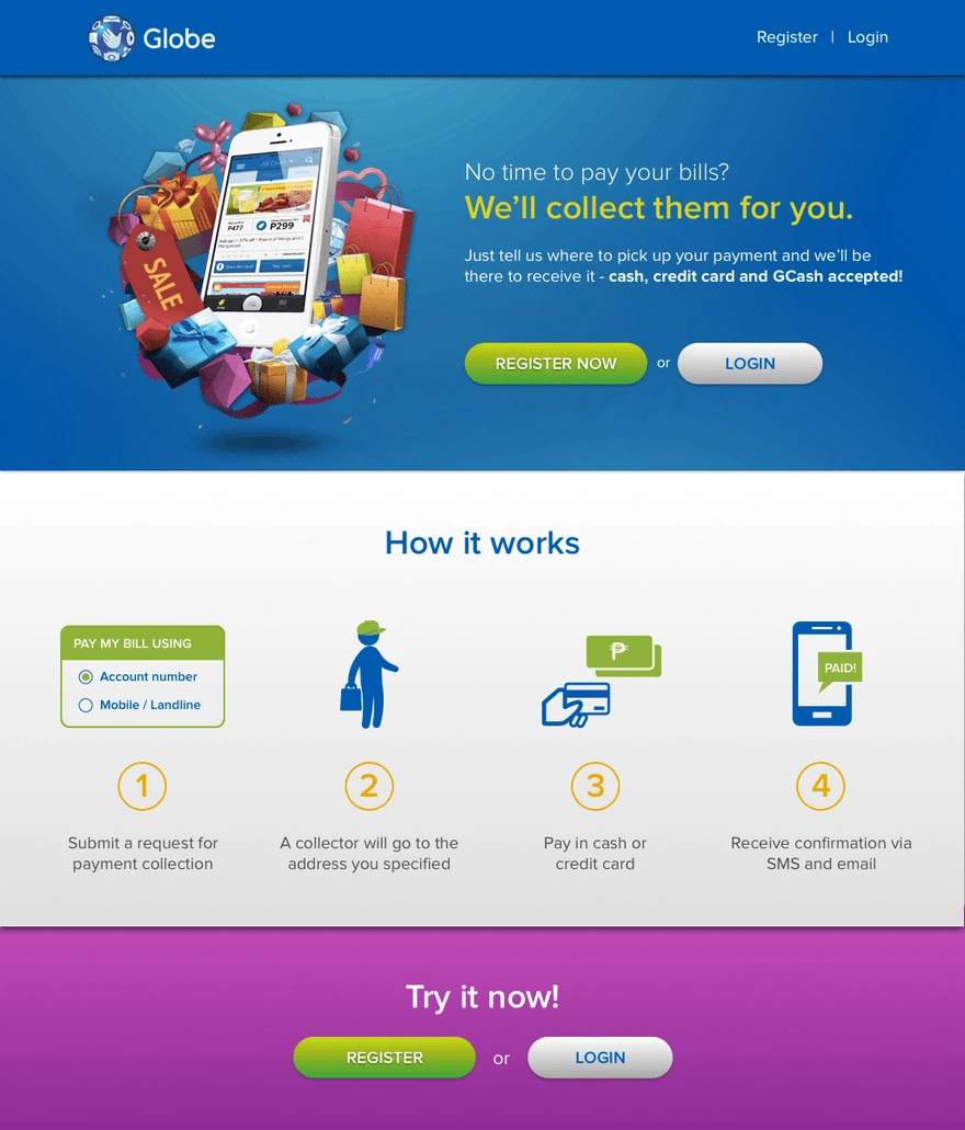Given the points above, I came up with a design for a client, Globe Telecom, that aims to make it more convenient for anyone to pay their bills and save precious time: find someone else to line up and pay the bills for them in exchange for a fee.