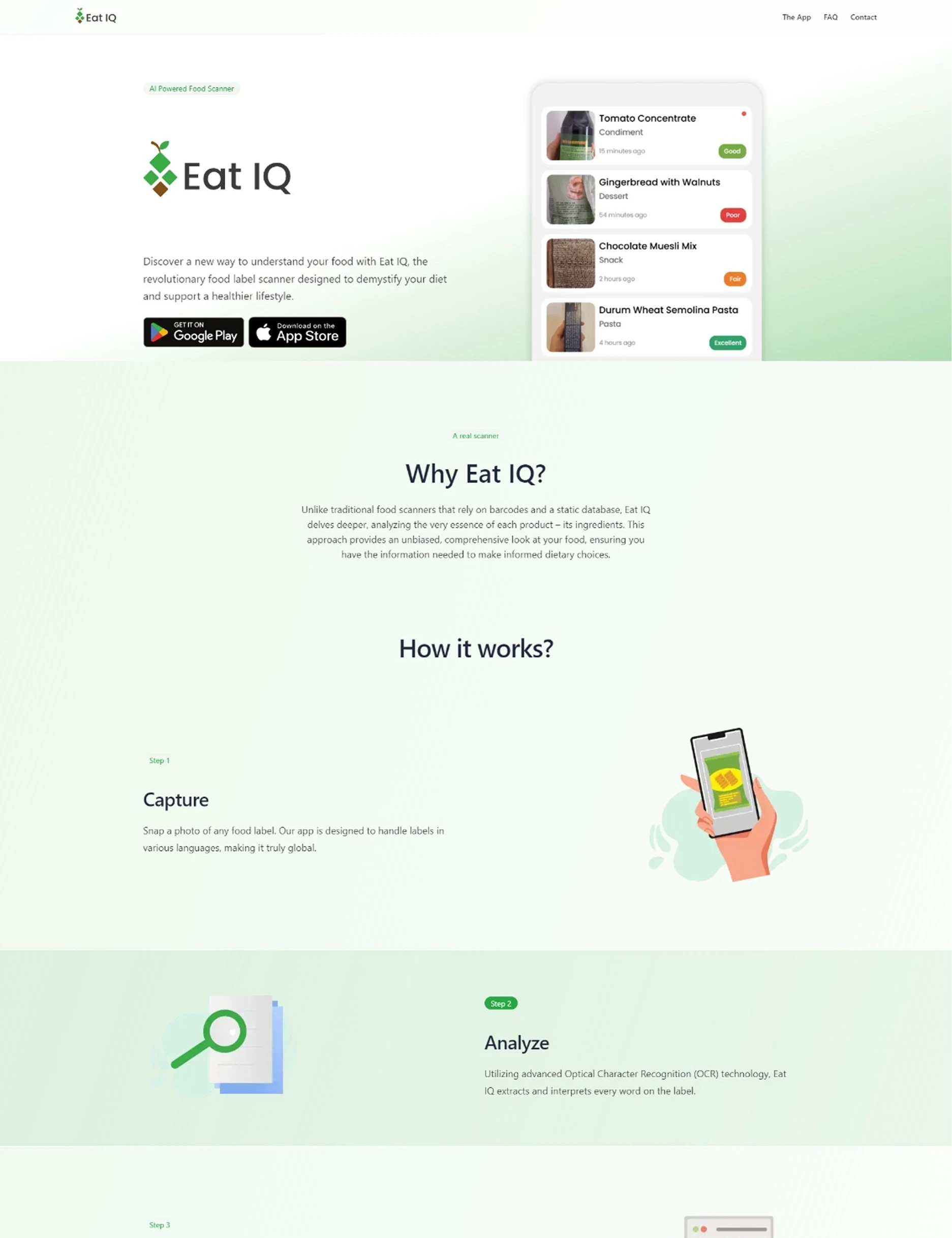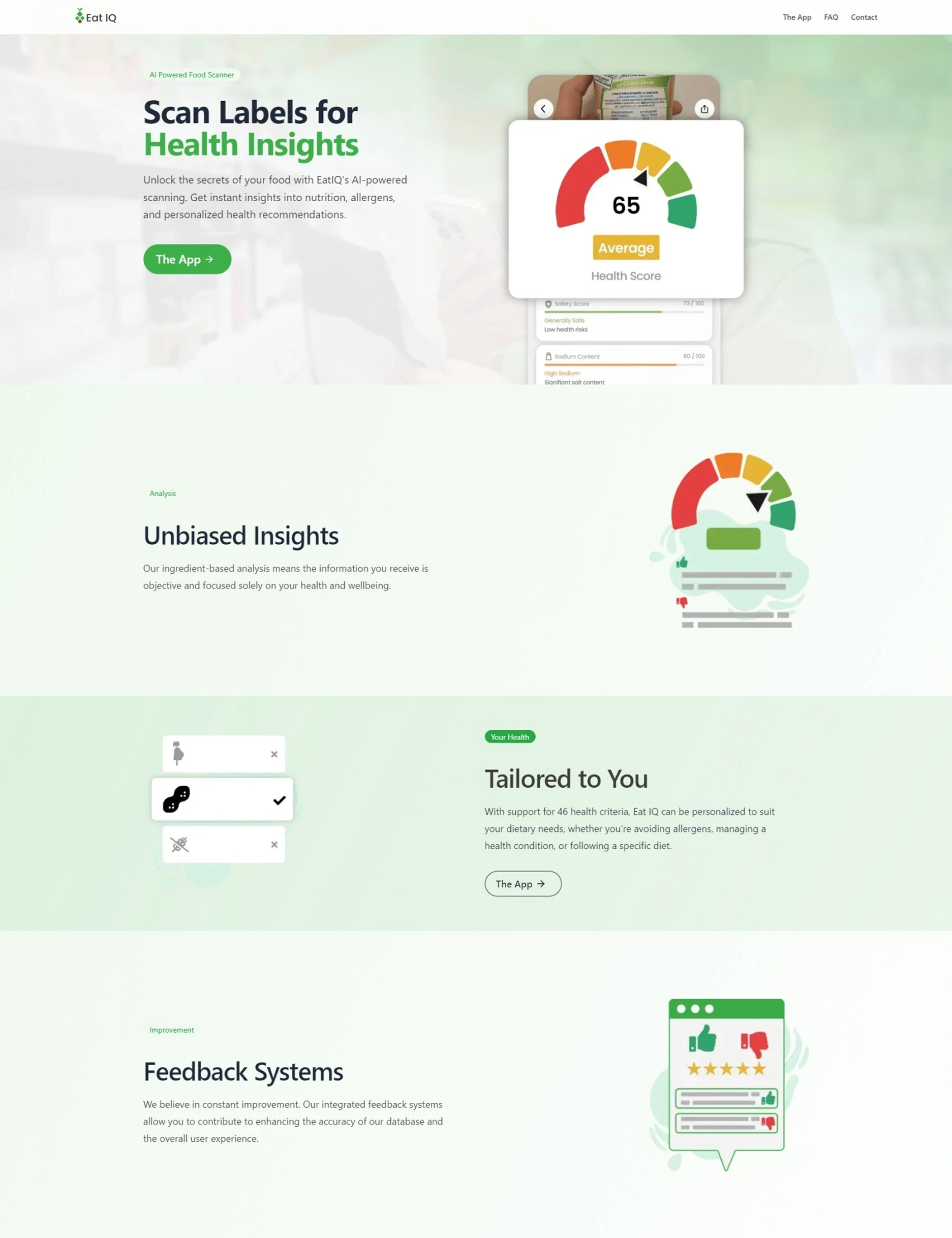 After defining the core mobile app experience, it was time to extend EatIQ’s reach to the web. Starting from a blank canvas, I designed and built a fully responsive website using React and Next.js.
