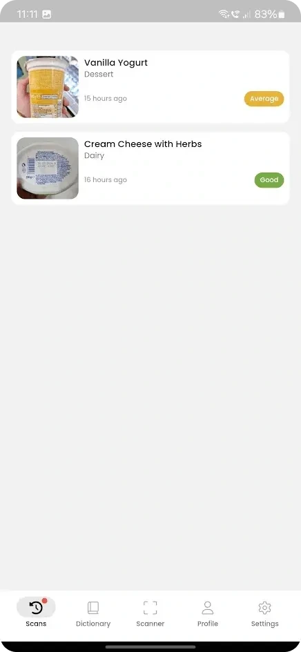 The Scans screen shows the user a history of past scanned food products and a quick preview of their quality