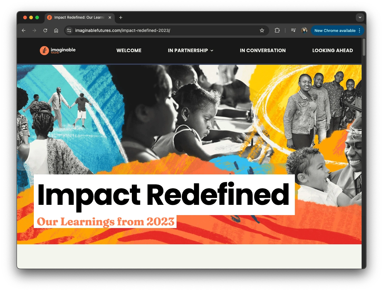 Imaginable Futures is a global education nonprofit. Be Nice Works did the Web Development for their Impact Redefined 2023 annual report microsite.