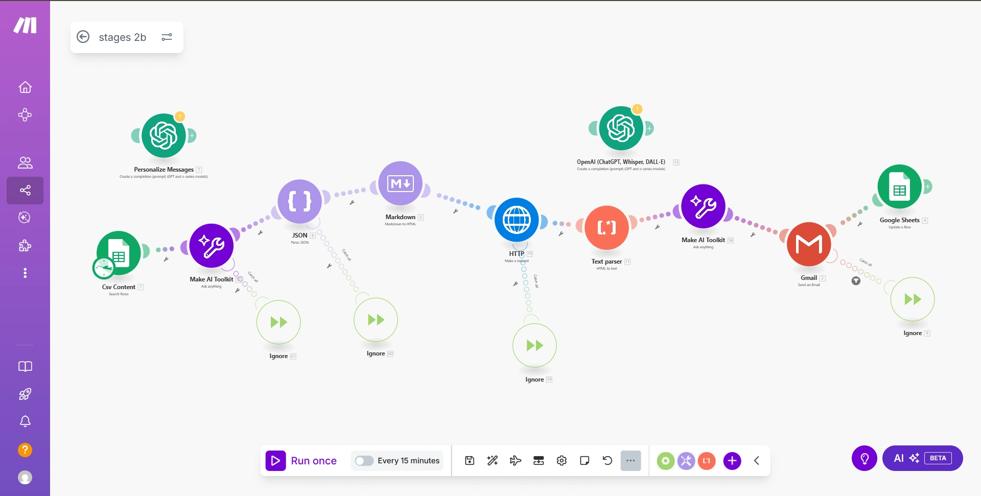 Built and deployed an end-to-end email outreach automation using Make.com. The workflow connected Google Sheets, AI personalization, website parsing, and Gmail.
