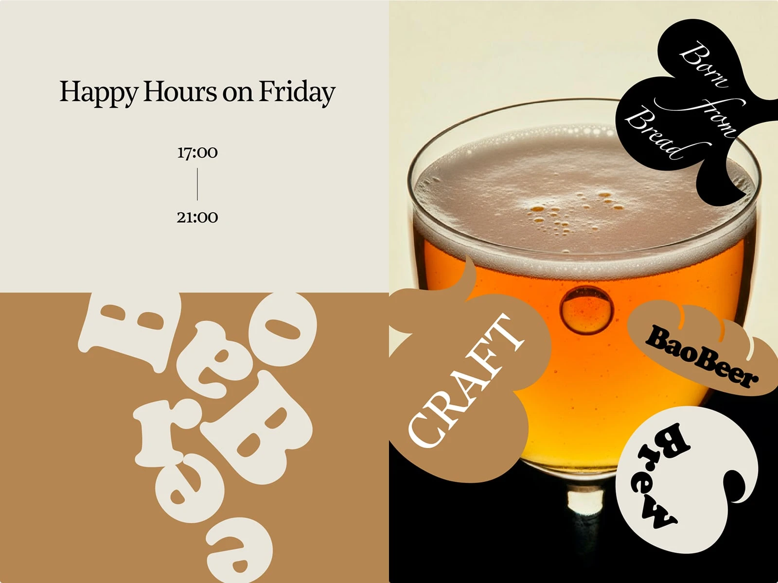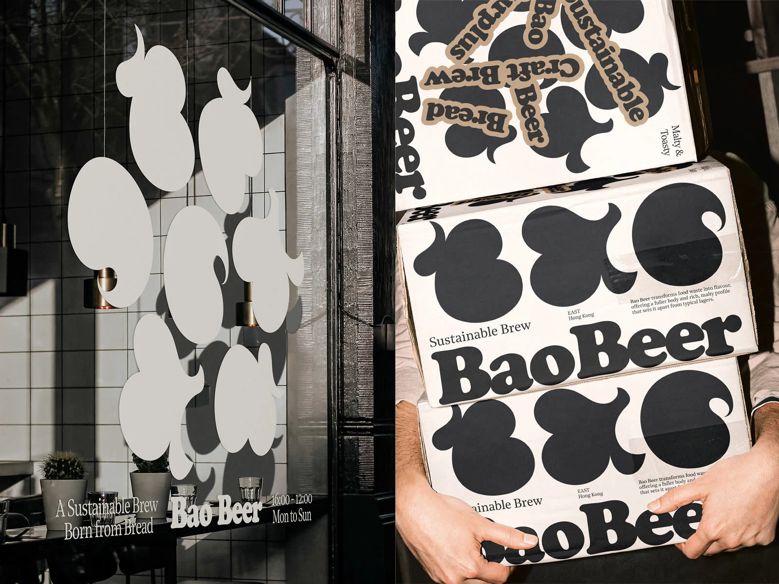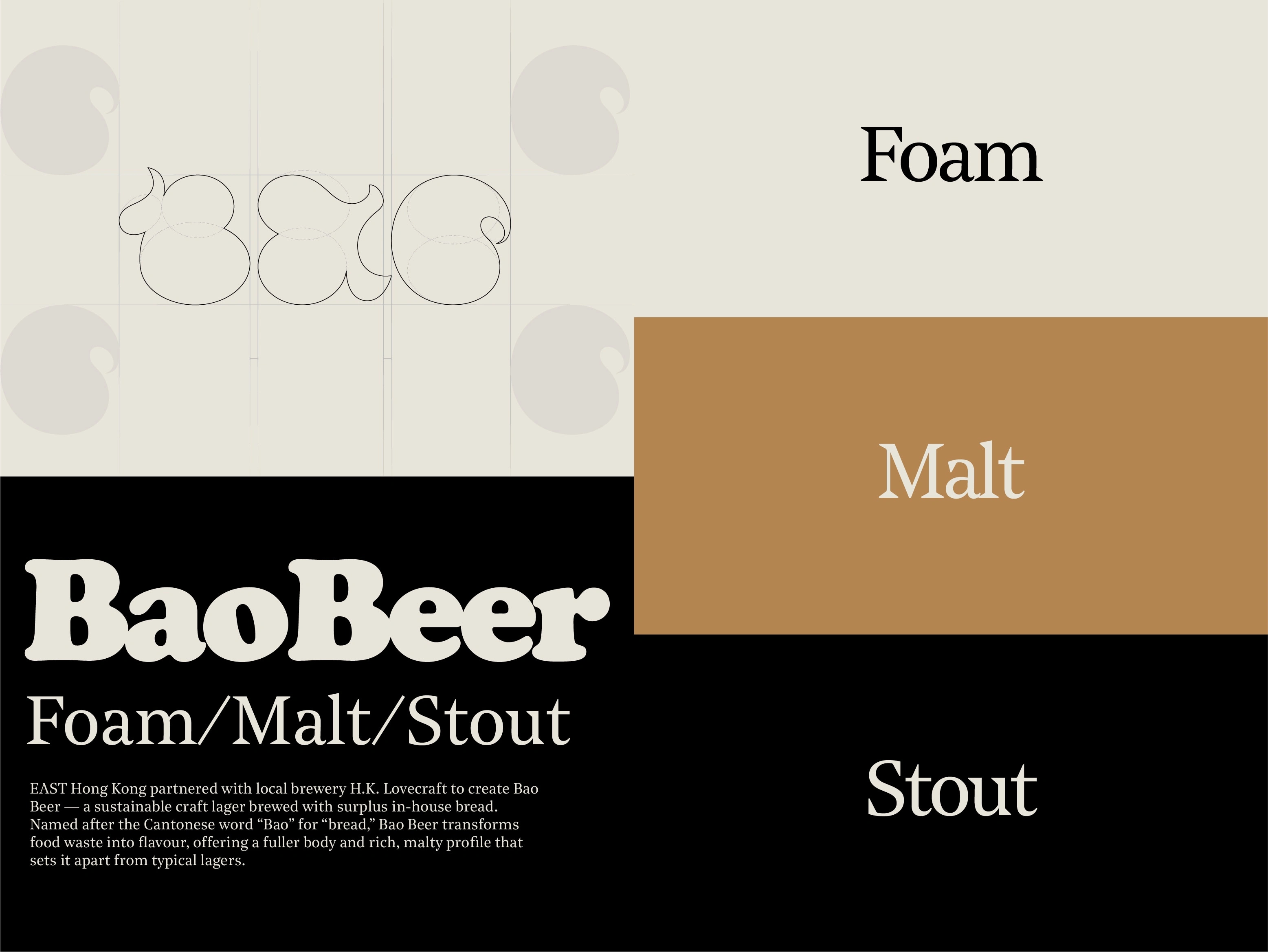 The Bao Beer identity draws from the soft, sculptural curves of bao buns and the effervescent texture of beer bubbles. The custom wordmark blends playfulness with craft, mirroring the brand’s essence — warm, bold, and circular by nature. It’s a visual homage to fermentation, transformation, and giving waste a second life.