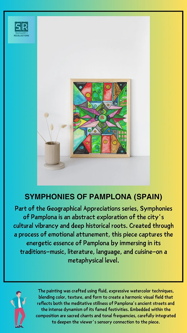 Watercolor & Ink on Paper | 21 x 29.7 cm Symphonies of Pamplona, Spain is an abstract exploration of the city's cultural vibrancy and deep historical roots.