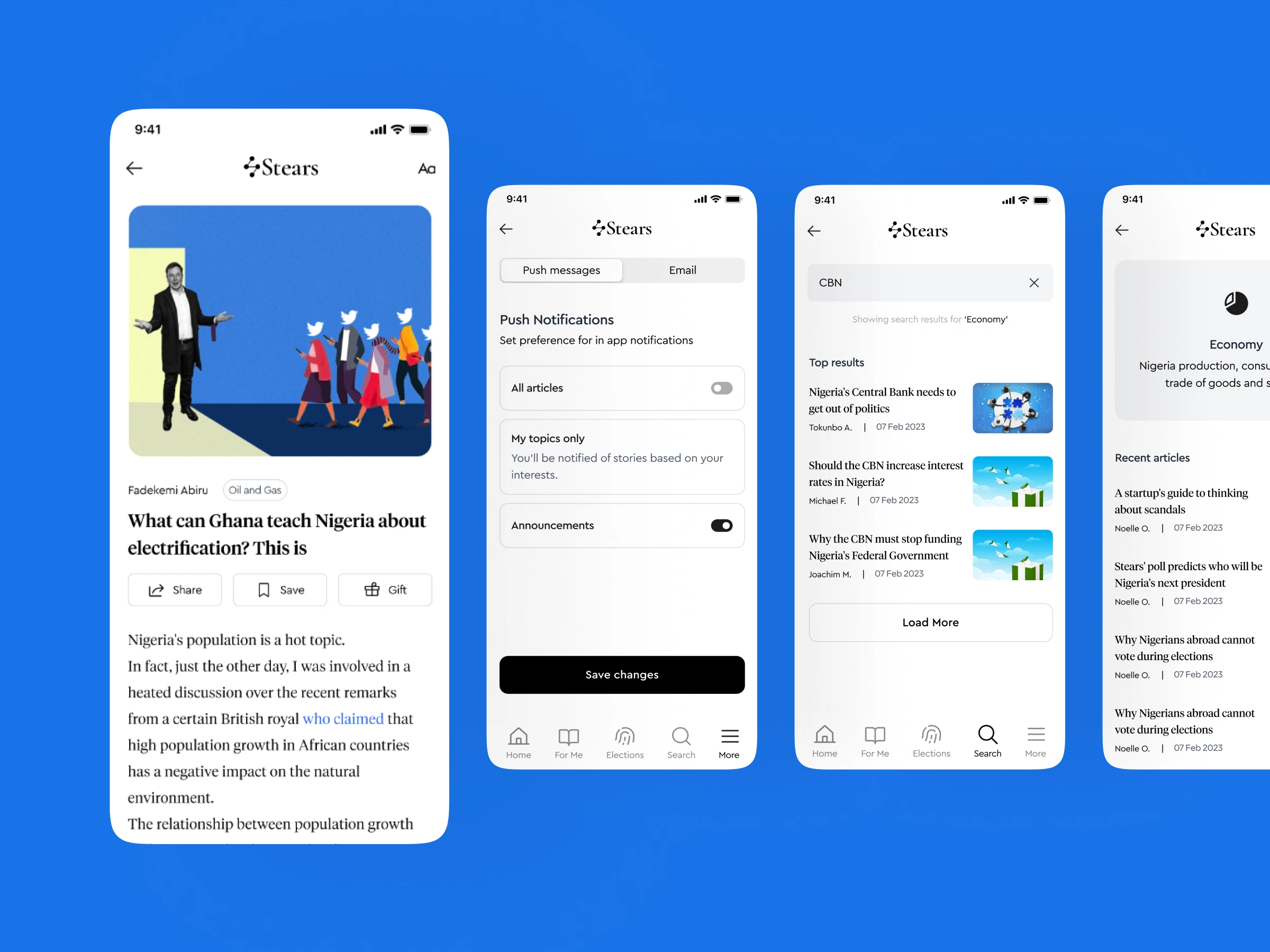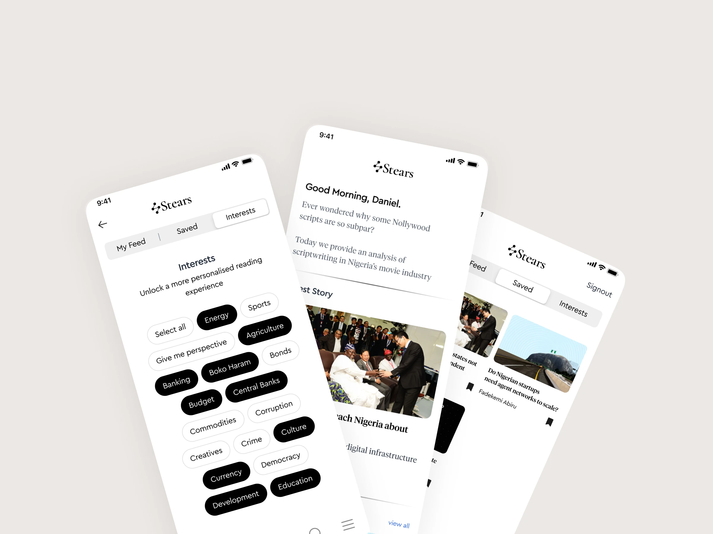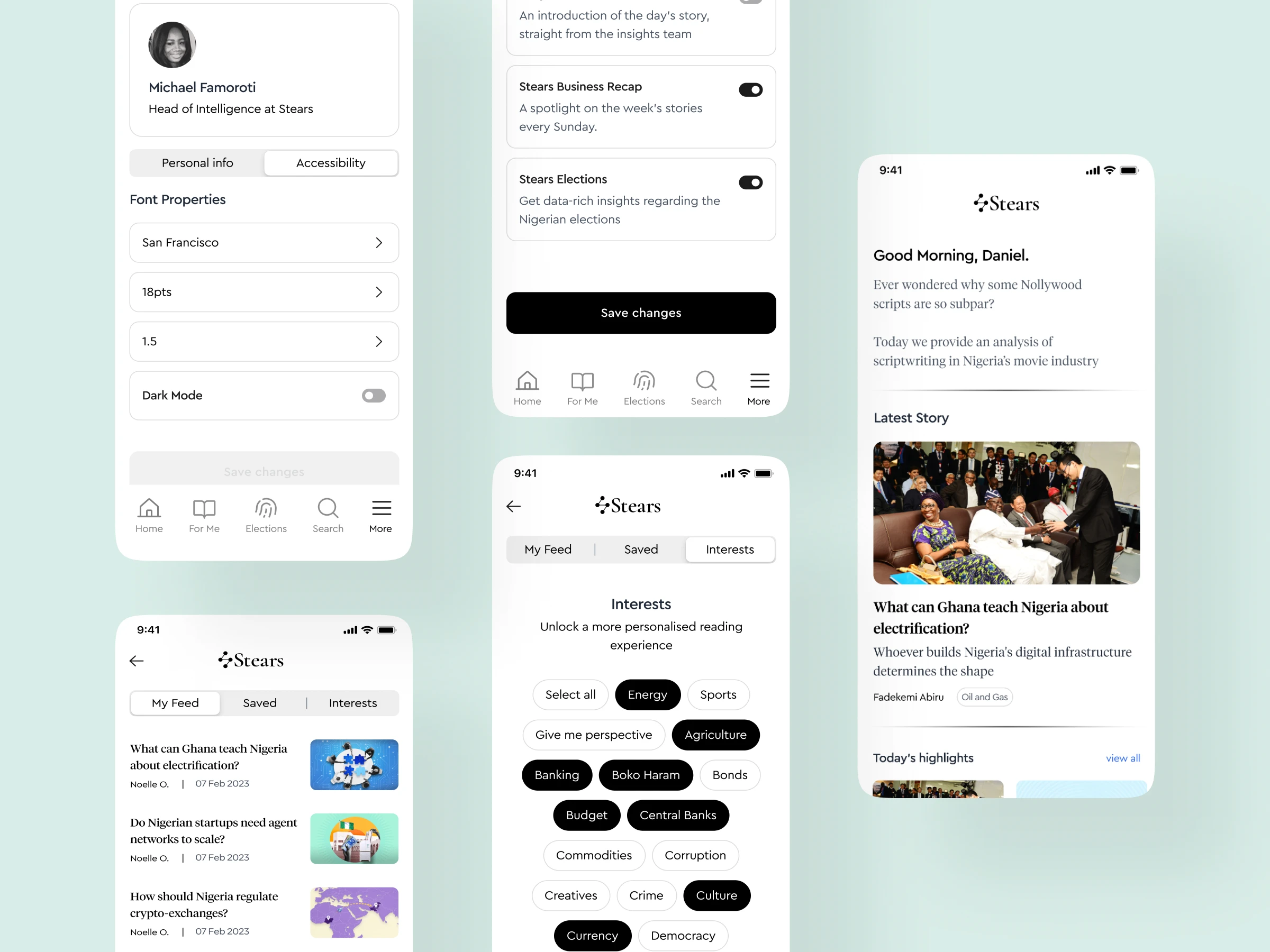Stears web platform had terrible UX - not responsive, subscribers couldn't access features. I designed mobile app with search, bookmarks, customization, interest preferences, push notifications enabling full subscription experience.