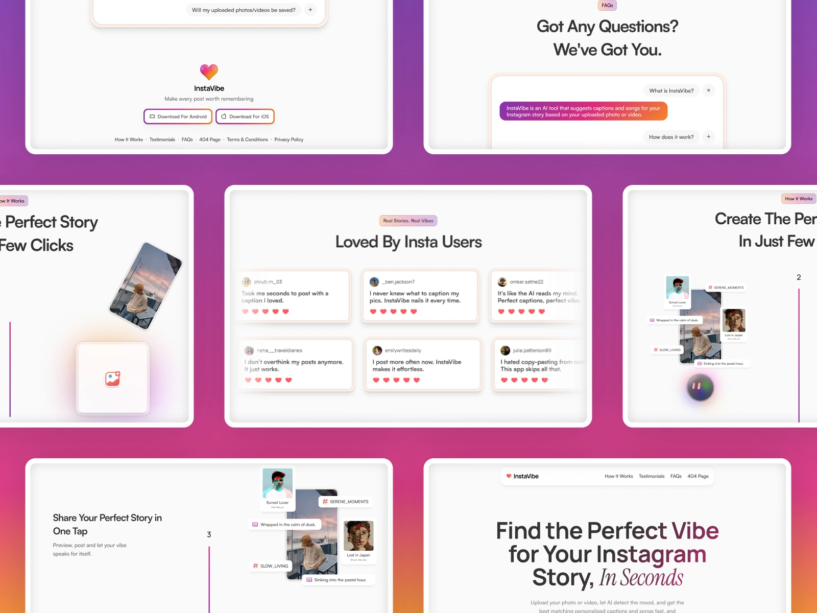 Hero Section with Strong CTA – Headline: “Find the Perfect Vibe for Your Instagram Story, In Seconds” paired with direct App Store and Play Store buttons.