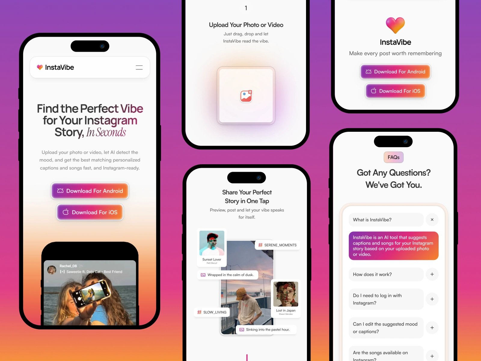 InstaVibe is an AI-powered mobile app that helps Instagram creators find the perfect vibe for their stories in seconds. Users simply upload a photo or video, and the app automatically detects the mood to generate personalized captions and song suggestions.