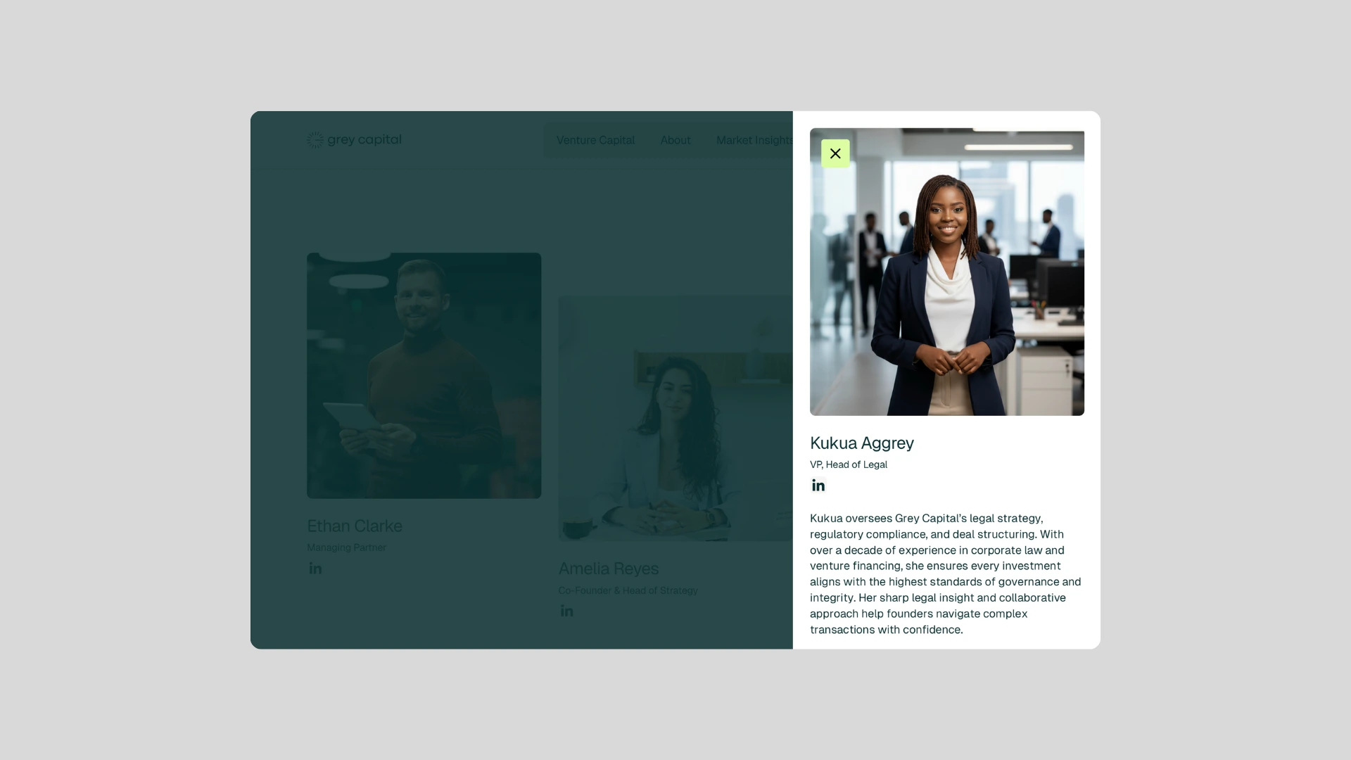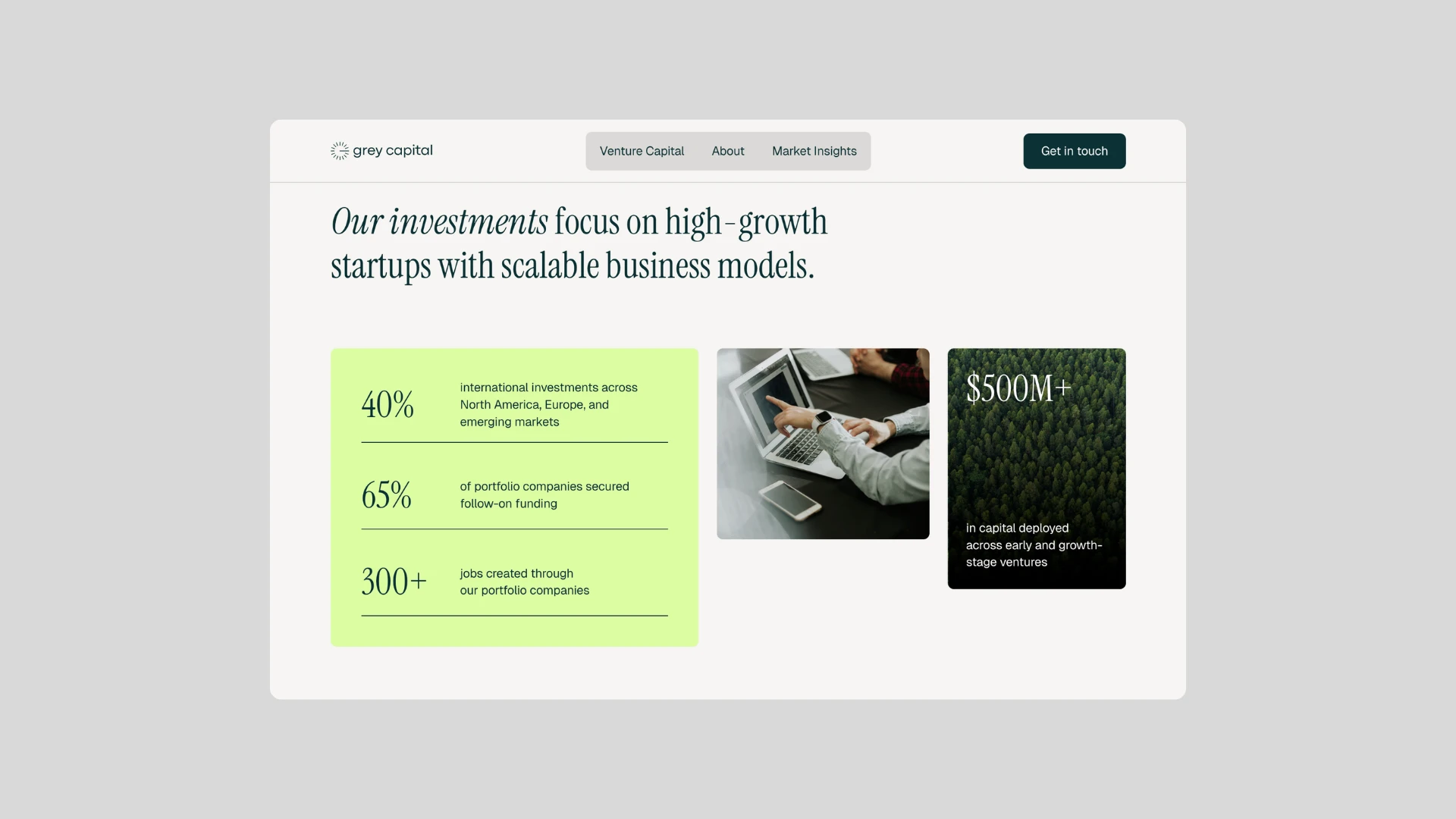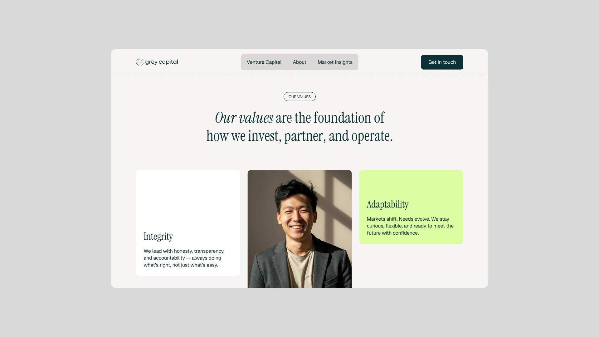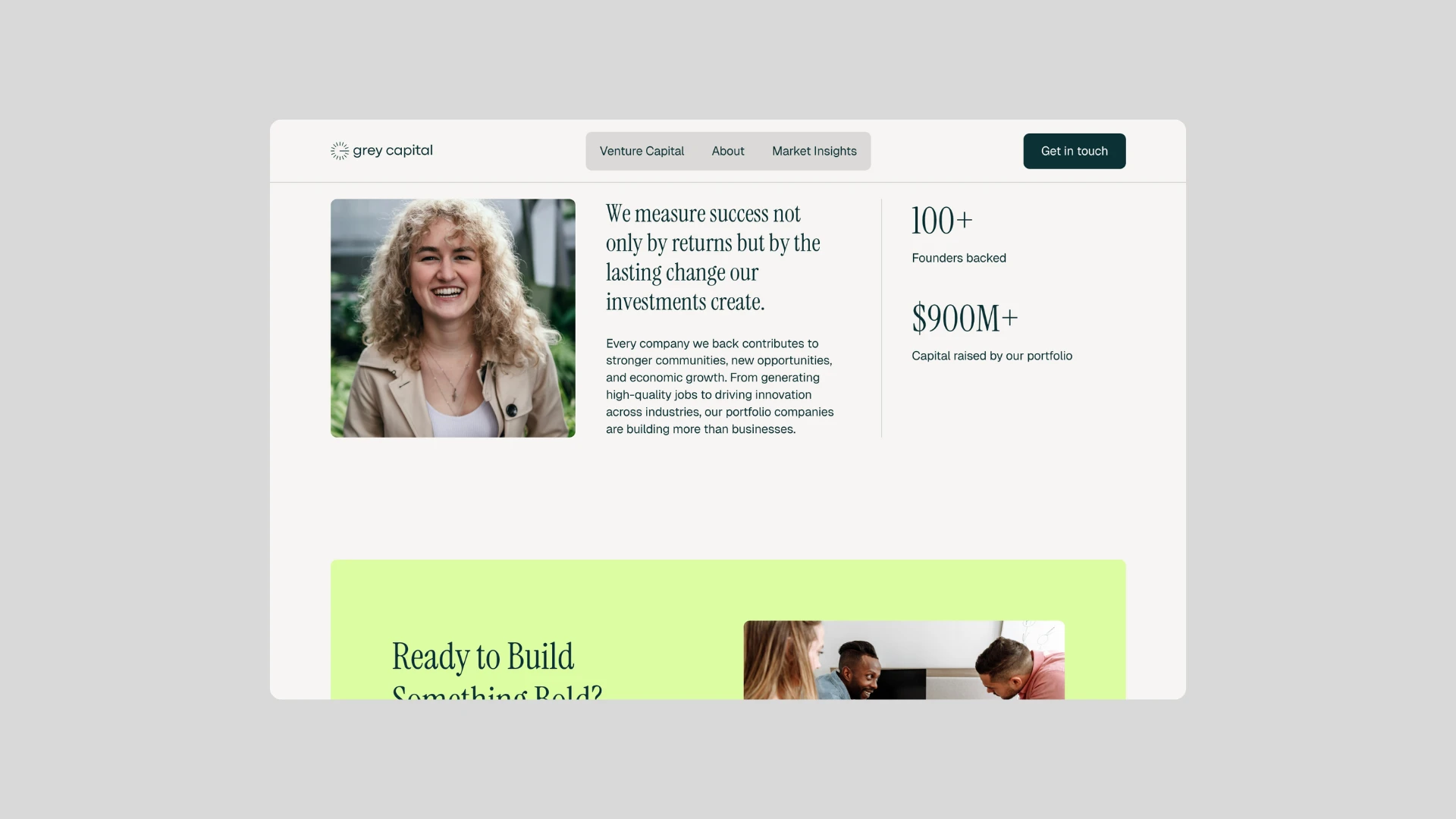 The previous website, while functional, blended into the sea of sterile finance sites. It buried the firm’s impressive numbers, felt slow and impersonal, and wasn’t driving meaningful inbound conversations with founders or limited partners. We partnered with the Grey Capital team to redesign and relaunch a site in Framer that finally looks, feels, and performs like the conviction-driven firm they are.